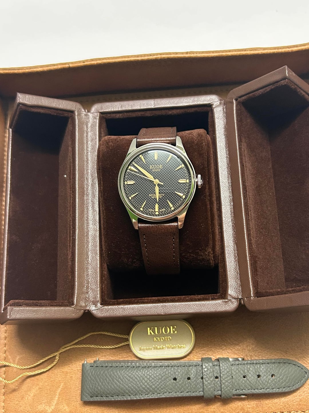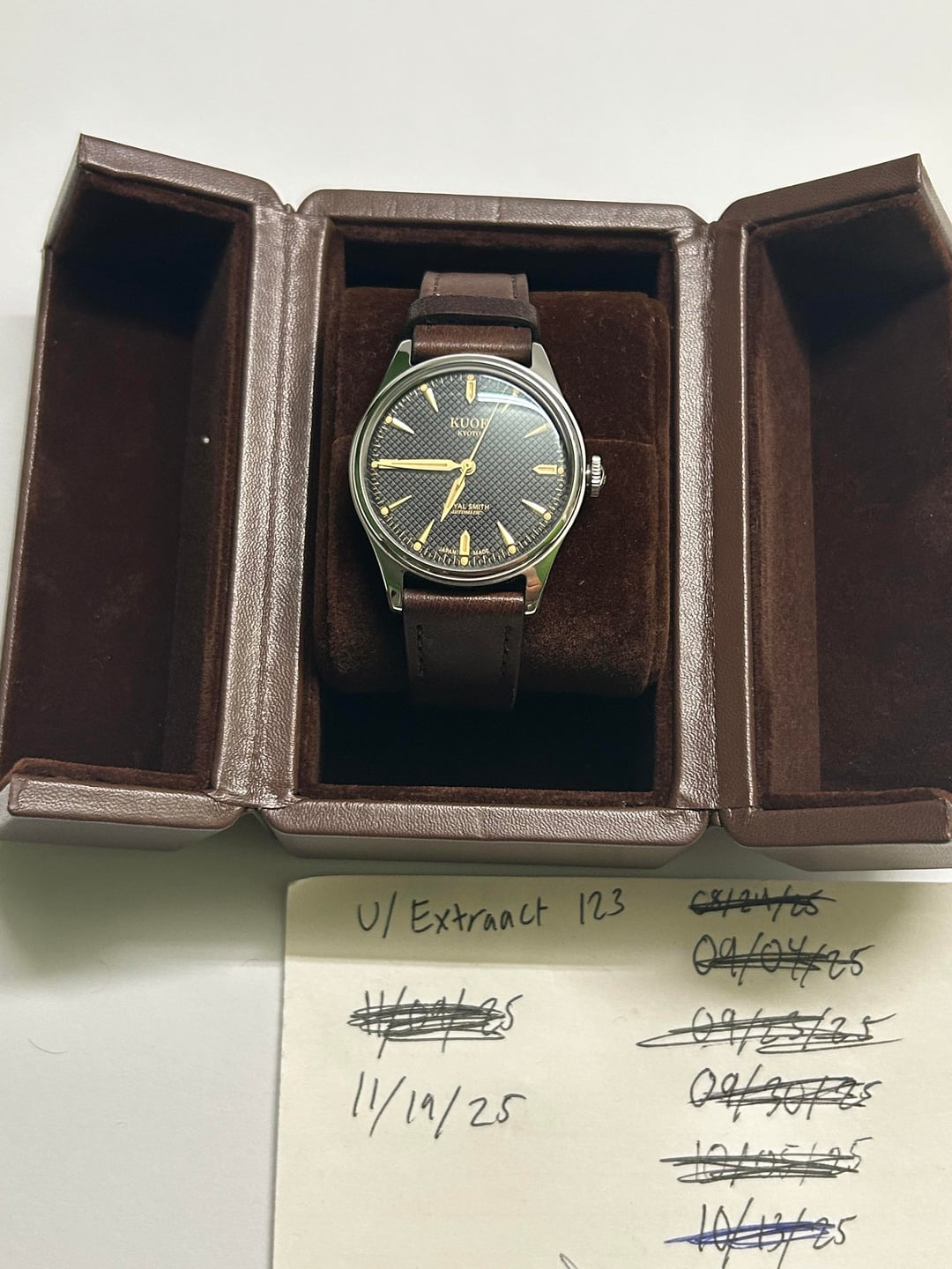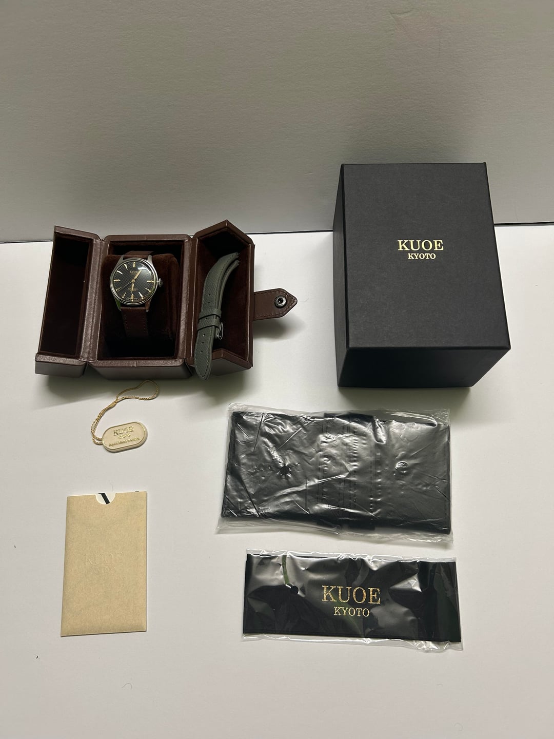 Gorgeous vintage-inspired KUOE Royal Smith with black dial. Comes full kit plus an extra OEM strap and KUOE carry pouch. Model: KUOE Royal Smith 90-006 – Silver Case / Black Dial Condition: Excellent – only light hairlines from careful wear Kit: Full kit – box, papers, OEM strap Extras: Extra OEM KUOE leather strap + KUOE carry pouch Specs: Movement: Citizen Miyota Cal. 9039 automatic, hacking + hand-wind Case dimensions: 35 × 35 mm, approx. 10 mm thick Lug-to-lug: 42 mm Lug width: 18 mm Case material: 316L stainless steel Crystal: Domed sapphire with internal AR coating Crown: Screw-down Water resistance: 10 bar / 100 m Dial: Black, vintage-inspired design with lume on hands/indices (Swiss Super-LumiNova) Price: $610 shipped CONUS