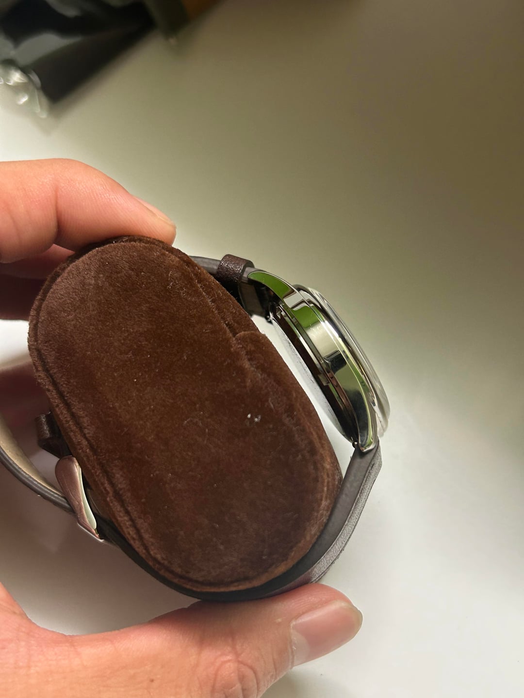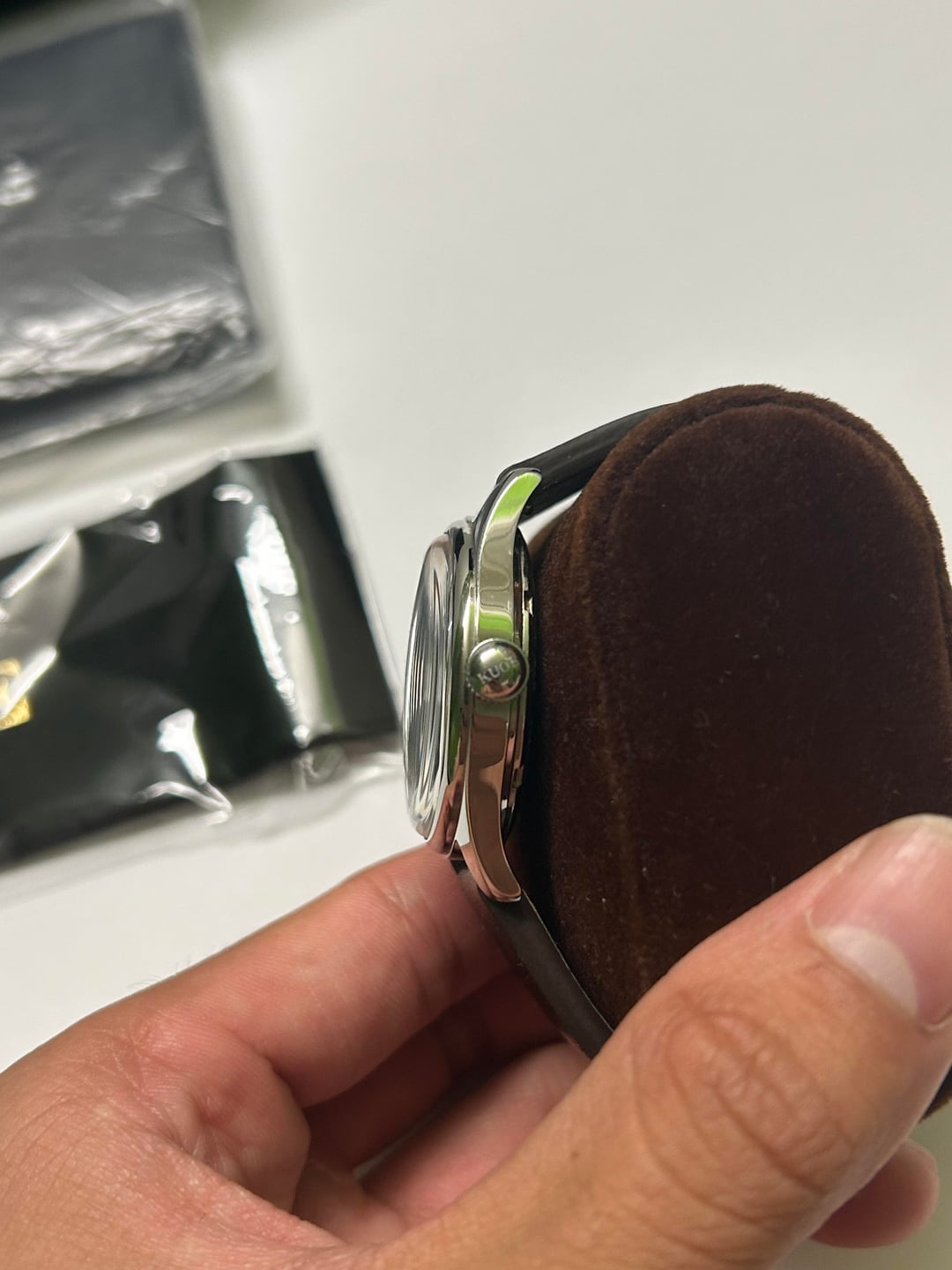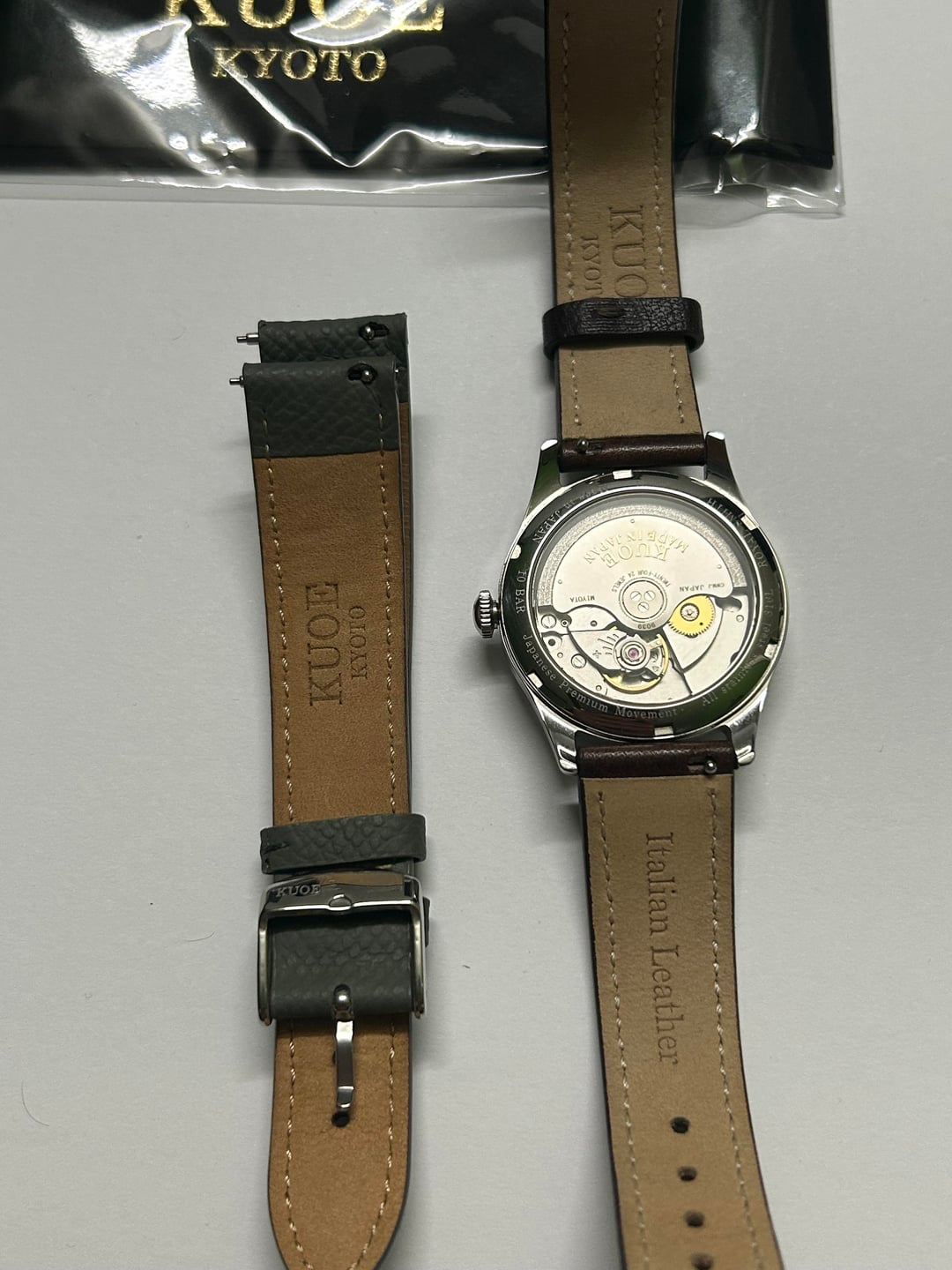 Gorgeous vintage-inspired KUOE Royal Smith with black dial. Comes full kit plus an extra OEM strap and KUOE carry pouch. Model: KUOE Royal Smith 90-006 – Silver Case / Black Dial Condition: Excellent – only light hairlines from careful wear Kit: Full kit – box, papers, OEM strap Extras: Extra OEM KUOE leather strap + KUOE carry pouch Specs: Movement: Citizen Miyota Cal. 9039 automatic, hacking + hand-wind Case dimensions: 35 × 35 mm, approx. 10 mm thick Lug-to-lug: 42 mm Lug width: 18 mm Case material: 316L stainless steel Crystal: Domed sapphire with internal AR coating Crown: Screw-down Water resistance: 10 bar / 100 m Dial: Black, vintage-inspired design with lume on hands/indices (Swiss Super-LumiNova) Price: $610 shipped CONUS