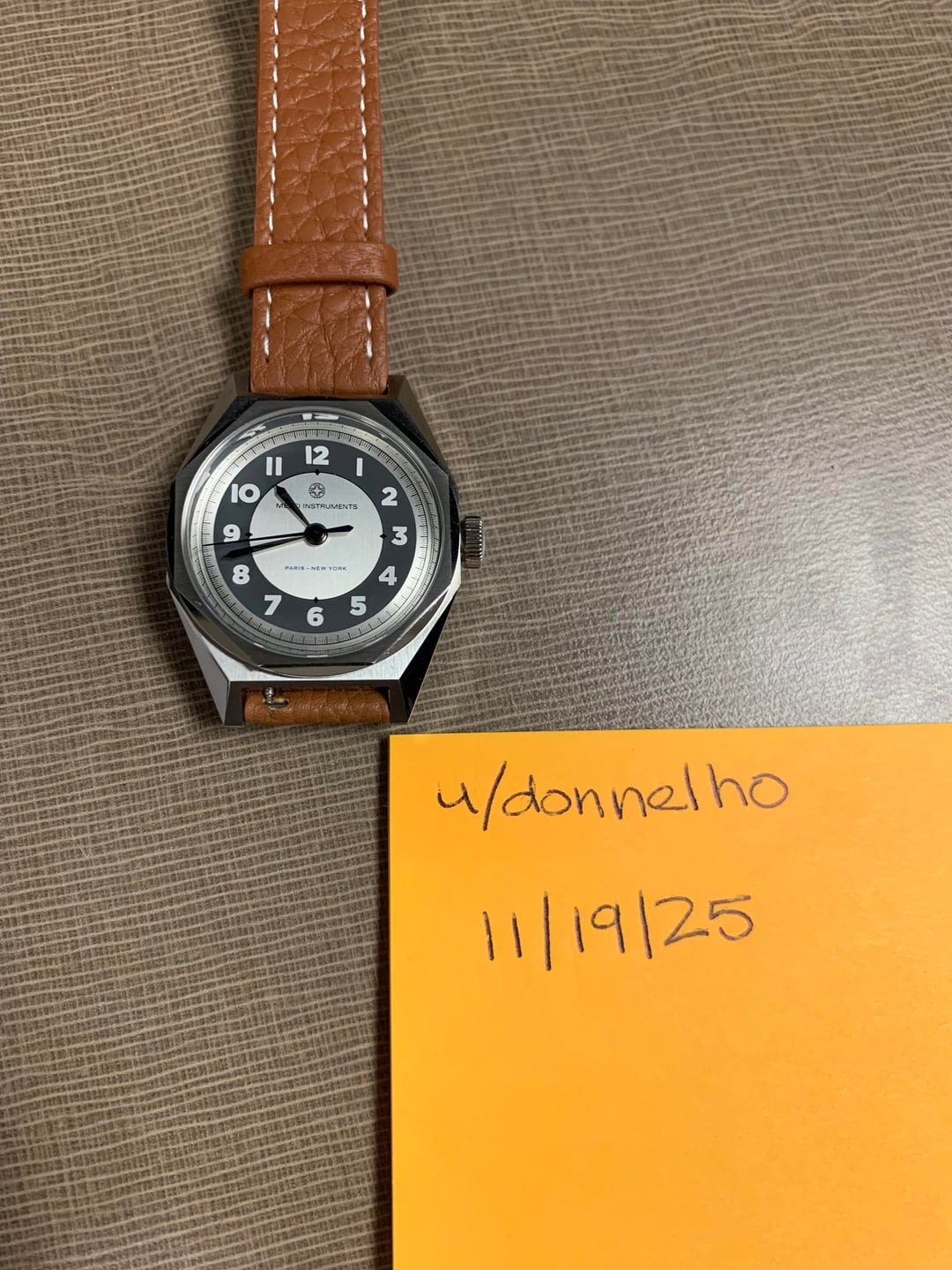 Reference: Merci Instruments-H02 Case: Stainless Steel 316L Thickness: 9.8mm Diameter: 36mm Dial Color: Silver Anthracite Grey Movement: Miyota 9039 Automatic Power Reserve: 42 hours Water Resistance: 10 ATM Strap: Honey Brown Leather Lug Width: 18mm Tried on. Never worn out. Not even a crease in strap. Numbered to 500 pieces. Price: $625+shipping CONUS, I accept Venmo, Zelle, PayPal FF or +3.5% for G&S Fees.
