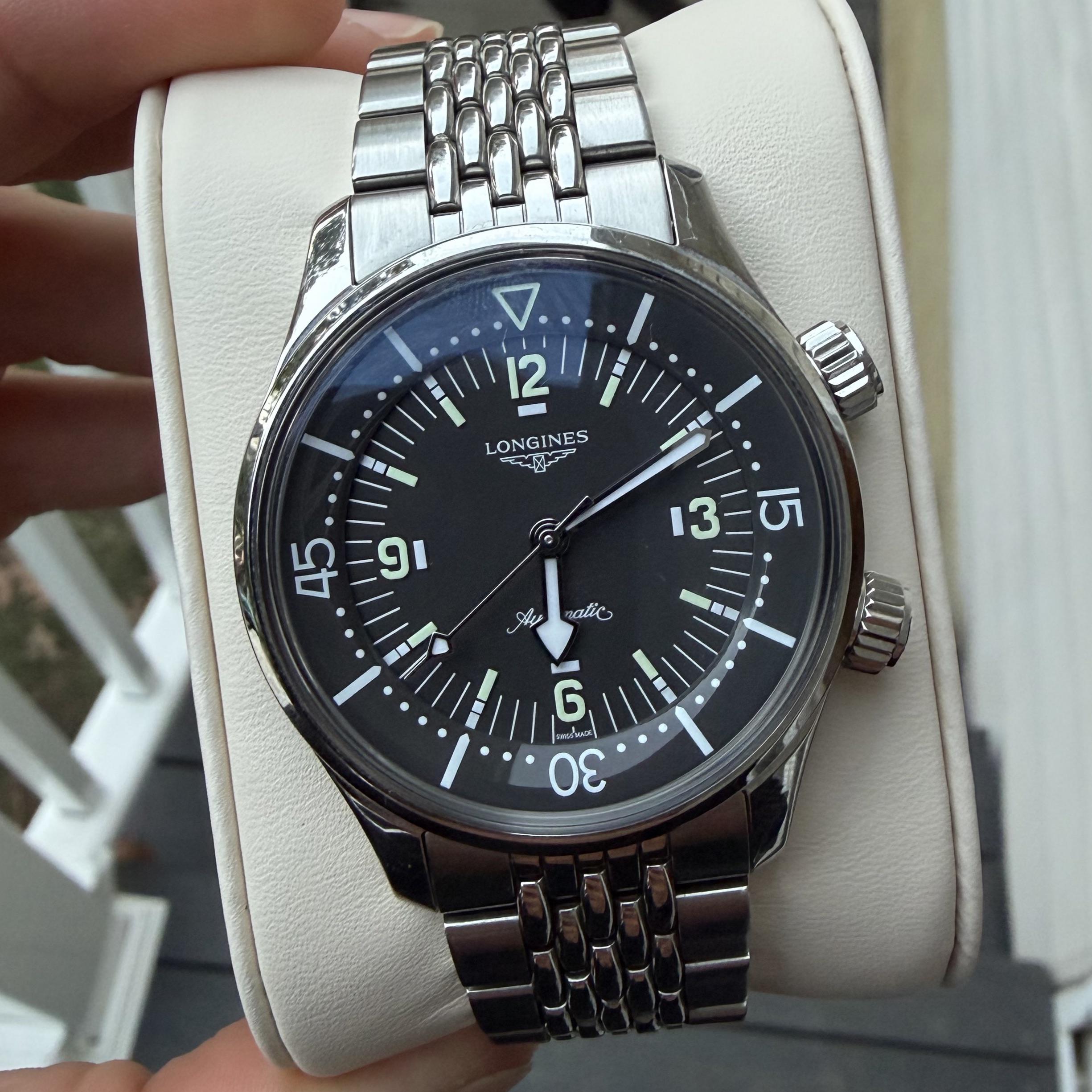 Selling my Longines Legend Diver 39 mm Anthracite on bracelet (ref L37644996). Full kit, purchased from AD on 8/14/2025. The watch is in excellent condition and running within COSC standards, with only some light hairline scratches on the highly polished parts of the watch, mainly the clasp. Bracelet is currently sized for my 6.5-6.75” wrist (all extra links included), and includes the micro adjust for on-the-fly adjustments! Asking $2,100 shipped via FedEx and paid with PayPal F&F or Zelle. Happy to provide more pictures or video. Thanks! Timestamp: https://imgur.com/a/McOaZqJ Album with video: https://imgur.com/a/oOgcgKG