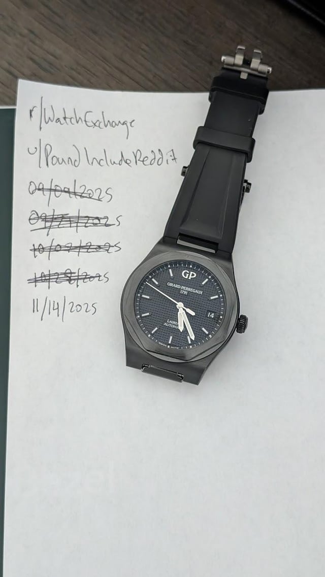 Hello WatchExchange! Price drop again! For sale is my Girard-Perregeaux Laureato (reference 81005-32-631-FK6A) in the discontinued black ceramic 38mm variant, with the original rubber strap and deployant clasp. It comes with full kit, including inner and outer boxes, book, warranty card, and hang tag. It is in immaculate condition. Asking for $7500 + shipping in CONUS, or best offer! Bank wire, Zelle, and Venmo accepted. Sale strongly preferred - funding another purchase! I will entertain trade offers, though. Pictures and timestamp attached. Let me know if you have any questions, thanks!