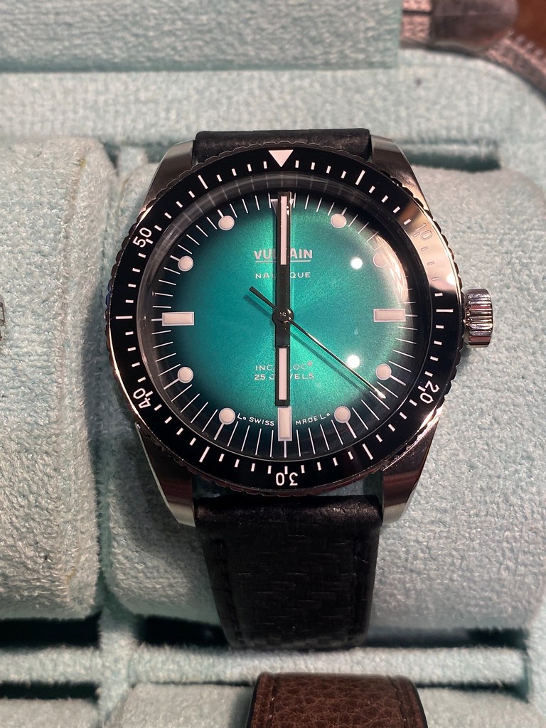 4. Vulcain. Skindiver Nautique. Special edition of 50 pieces for Oracat Jewelers in France. "Wembley." Sold out. 38mm. Price shipped in USA is $1200.