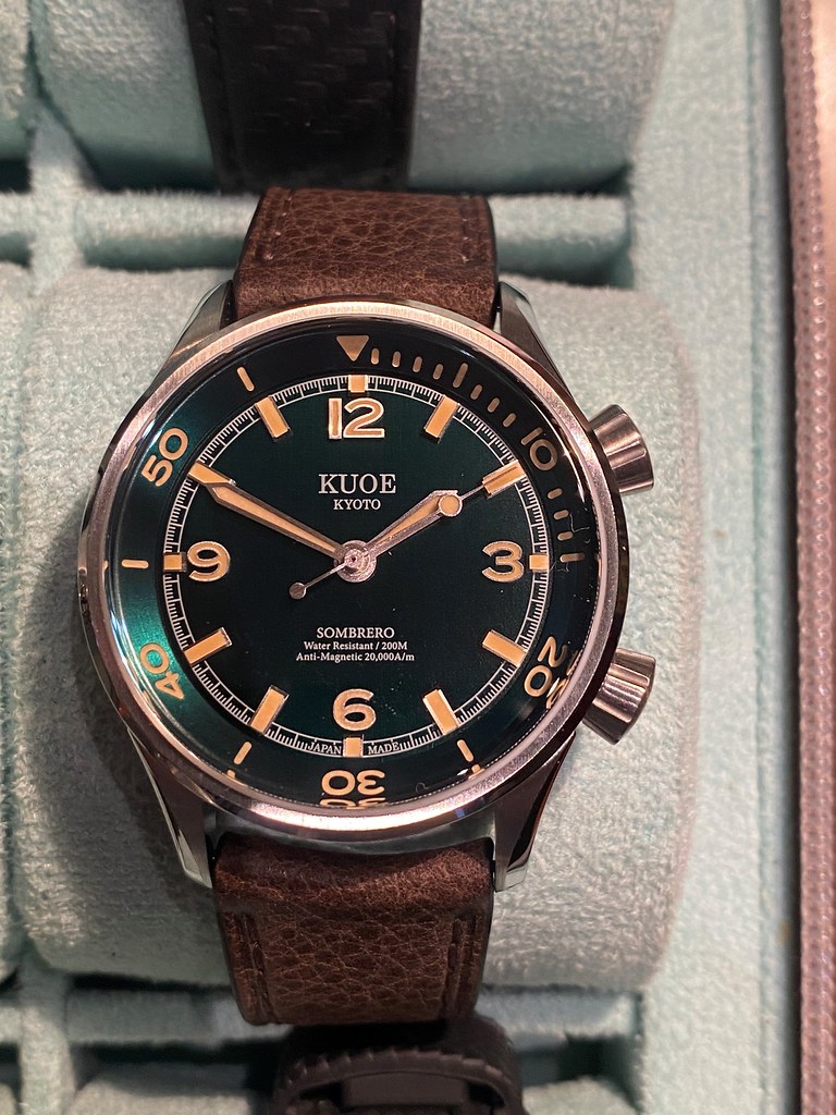 7. Kuoe Kyoto Sombrero 90-011. Green linen textured dial. 38mm. Price shipped in USA is $675.
