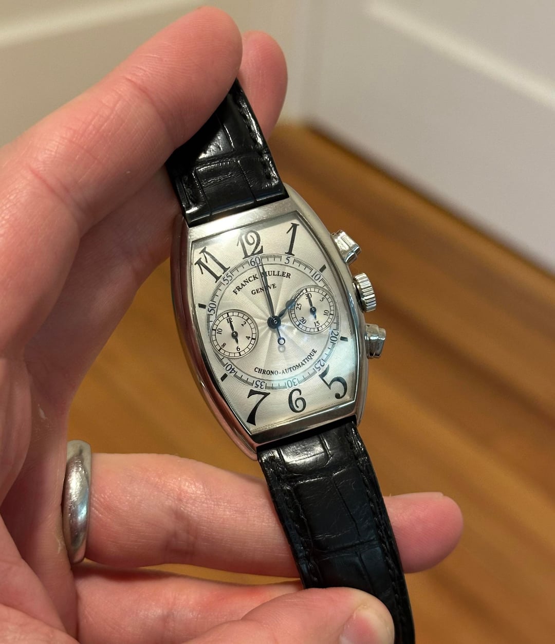 Up for sale is an awesome watch, and I am selling primarily because I have two of these (or at least another in very similar variant). This is a Franck Muller chronograph. It dates back to the 2000s. It features an automatic FP Cal. 1185 movement (5.5mm thick for a chrono--crazy) that is currently running at about +/- 10 seconds per day. The movement has a platinum rotor. The finishing on this watch is excellent. The watch features Franck Muller's signature exploding numbers, in glossy applied format, sitting on top of a sunburst guilloche dial. The inside minutes track features blue finished numerals, which nicely complement the blued steel hands. One of my favorite thing about this dial is that the corners bend down towards the case and give the dial an awesome three-dimensional effect. This watch is in very good condition, and its case and dial are free of any damage. The case measures about 40mm vertically and 31mm horizontally. At the lugs, the case measures about 8mm thick, and at the widest point in the center of the watch, the case measures about 11mm thick. The case is curved. This watch will come on a black leather Franck Muller strap with buckle. **Price:** $4,500 **Timestamp:** in photos **Videos:** I can send a video of the watch through my instagram, @WarmDials **Payment and Shipping:** to be agreed upon by the buyer and myself, taking the buyer's purchase history into consideration. I am open to shipping internationally I'm located in the United States and frequent user in this community. I have bought and sold often, and I'm happy to answer any questions you may have / provide more photos or a video. You can find me on instagram at @WarmDials. Don't hesitate to reach out if you have any questions or want to chat