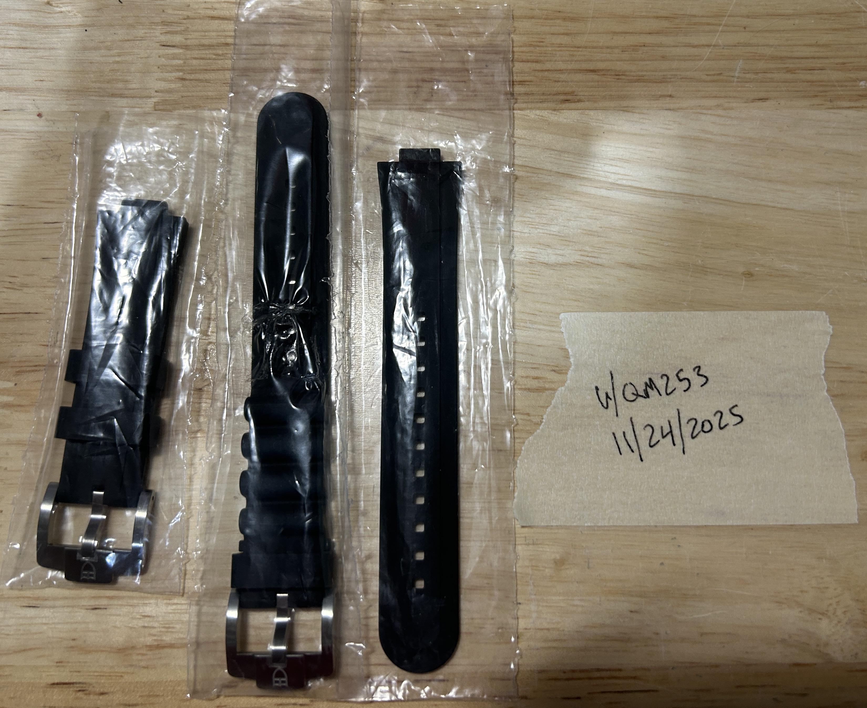 Up for sale is an unworn OEM rubber strap set for a Tudor Pelagos 39mm. Imgur link: https://imgur.com/a/5ngeXvN Still has plastic covers on the buckle tangs. Only did a quick test fit on the end links before realizing I had the wrong ones for my Pelagos 42mm, and then put them back in the plastic sleeves. See imgur link for pics of measurements and condition. Don't hesitate to reach out with any questions or to request more pictures! Looking to get $210 shipped or trade for the OEM black rubber strap set for the 42mm Pelagos Thanks!