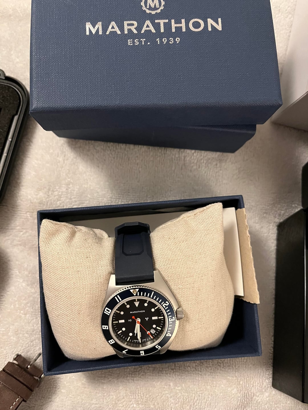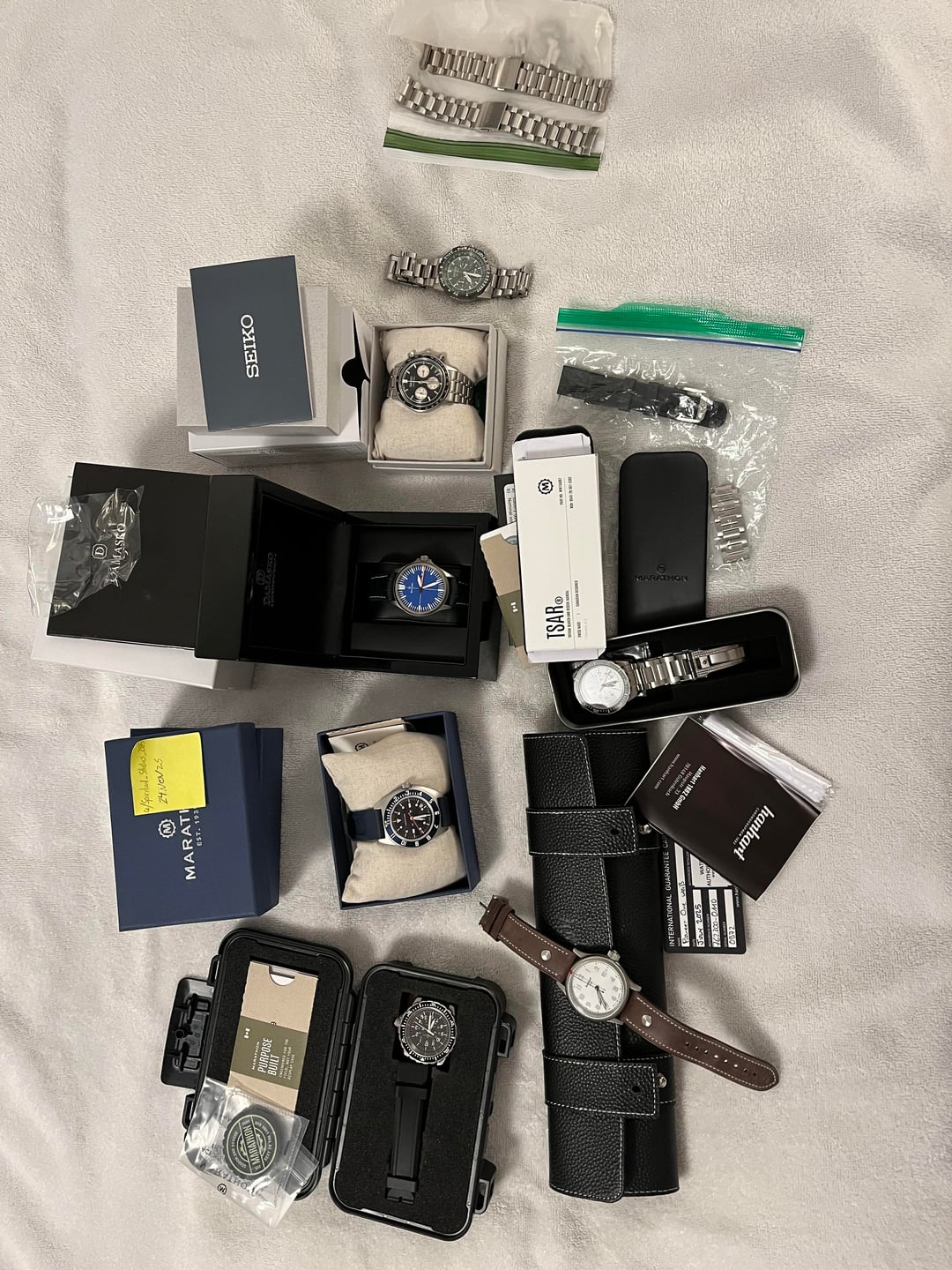 **Hello everybody, I am treating this as a re-seller’s special. To save time I am seeing if anybody wants all of these watches for a steeply discounted price so I do not have to sell each individually. These are all being sold for my father. Asking $3250 for all shipped/insured CONUS. Individual prices listed in each description. I accept PayPal, Venmo or Zelle. Please reach out with questions or to FaceTime. Thanks for looking!** 1. Hanhart Pioneer One White Dial - Box and Papers bought from Watchbuys. No outer cardboard box. $800 2. Marathon TSAR/GSAR 41mm Diver White w/ Bracelet - Full kit bought from Long Island with aftermarket bracelet (On the fly adjustment). $800 3. Marathon TSAR/GSAR 41mm Diver Black IDF SF 217 - Full kit, $650 4. Marathon SSNAV-D 41mm Navigator Blue Yonder - Full kit. $600 5. Damasko DS30 OBO - Full kit bought from Long Island. $750 6. Seiko SSB479 Reverse Panda Chronograph - Full kit $300 7. Citizen Promaster Navihawk 40mm - No box or paper, bracelet will fit 7.25 inch wrist. $200 8. Two seiko bracelets: I believe they are from quartz speed timers. $20