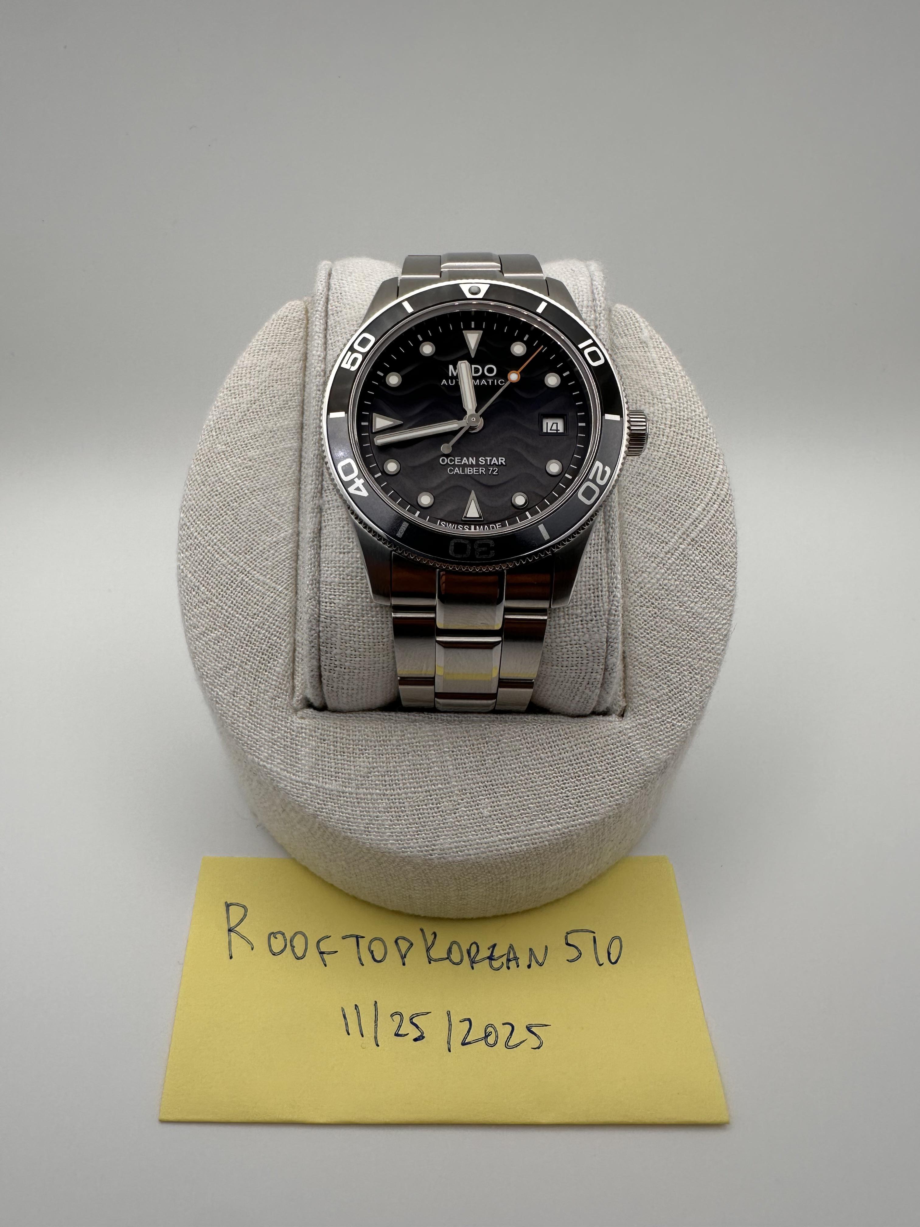 Mido Ocean Star 39. Black/Grey gradient wave dial. Ref M026.907.11.061.00. Full set in excellent condition. Original purchase is August 2025 from Teddy. Comes complete with everything (inner & outer box, papers, all links). Watch is in excellent condition with just some hairline scratches present on the bracelet/clasp. Crystal is clear and free of scratches. No trades, shipping to CONUS only. [More pictures here](https://imgur.com/a/HvJKrWD) Let me know if you have any questions, please leave a comment here before sending a DM. **$730 shipped** Payment via Zelle, Venmo, Paypal FF/G&S (+fee)