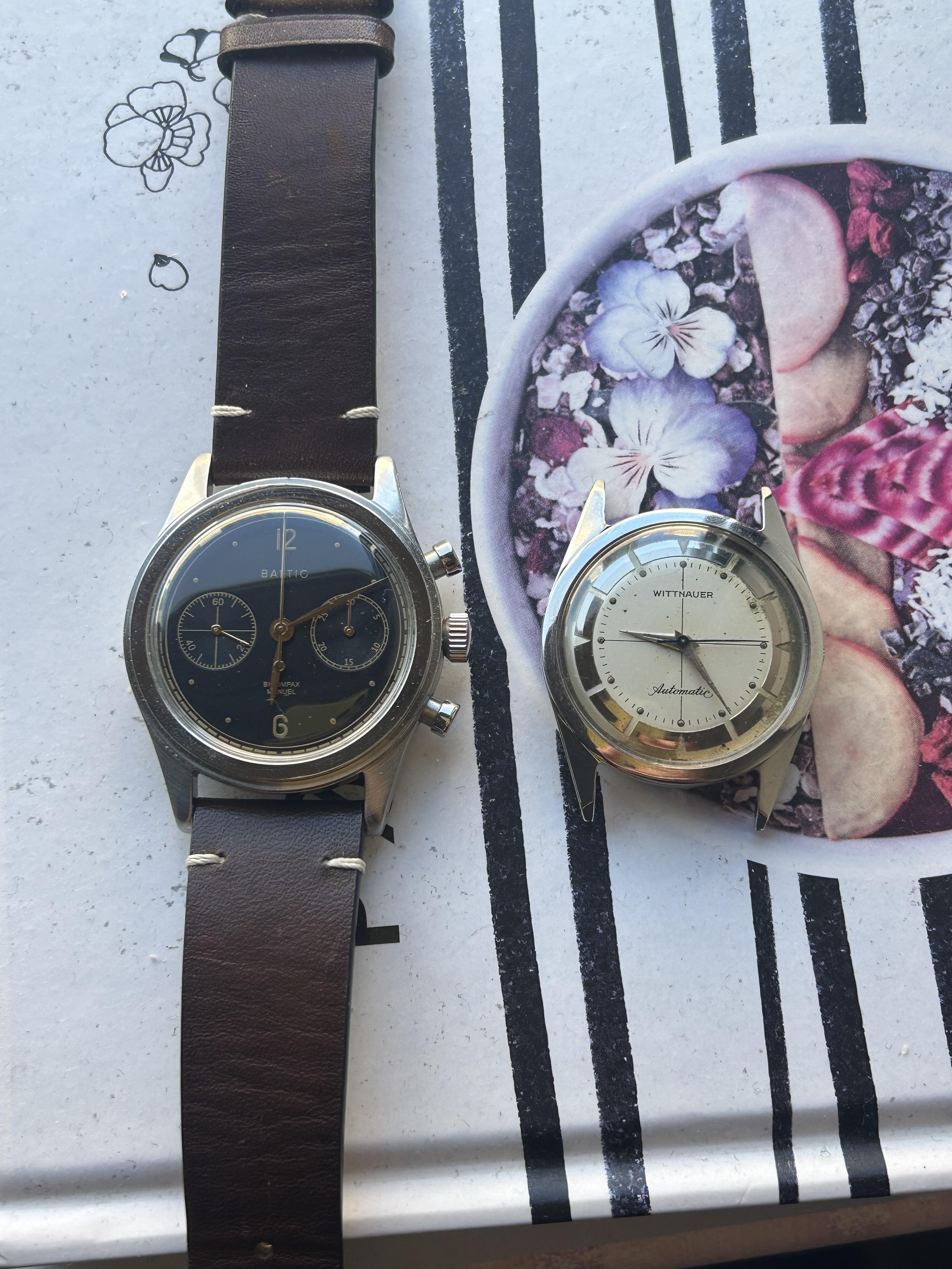 Hi Watchexchange! Today I have for you the Baltic Bicompax 001 Chronograph in Stainless Steel with the Black Gilt dial. This is part of the first series Bicompax and, with this dial configuration, represents a relatively rare reference. The watch is inspired by vintage chronographs with its bold masculine lugs, stepped bezel and perfect 38mm case size and 47mm lug-to-lug. The watch is brought to modern times with its contemporary build quality and dial aesthetic. Watch is in 8.5/10 condition with a perfect dial and movement (please excuse the harsh lighting and reflection on the dial side - I took a few angled shots for you to get a more true sense of the dial). There are minor scratches most notably on the polished stepped bezel and case back, and a tiny ding at the 12 o'clock side of the stepped bezel. Watch is in full working order, and comes as a full set - box and papers. In addition, I am throwing in this beautiful 1950s Wittnauer Automatic Ref. 2317-SW with a white, cross hair, and applied sector dial FOR FREE. This will come head only and is approximately 34mm in diameter. Selling as a set, so please do not inquire about breaking it apart unless it is a compelling proposition. Price: $499 OBO, I'll cover shipping! NOT INTERESTED IN TRADES Timestamp and Pictures: [https://imgur.com/a/baltic-bicompax-gilt-SBvbdtV](https://imgur.com/a/baltic-bicompax-gilt-SBvbdtV) Payment: Zelle, wire Shipping: CONUS or F2F in Boston Tons of feedback on WEX (via [u/lolkatzdeli](https://www.reddit.com/user/lolkatzdeli/), which was my account prior to getting hacked) to reference if helpful. Thanks for looking, and please don't hesitate to reach out with questions / thoughts / Facetime / further requests.