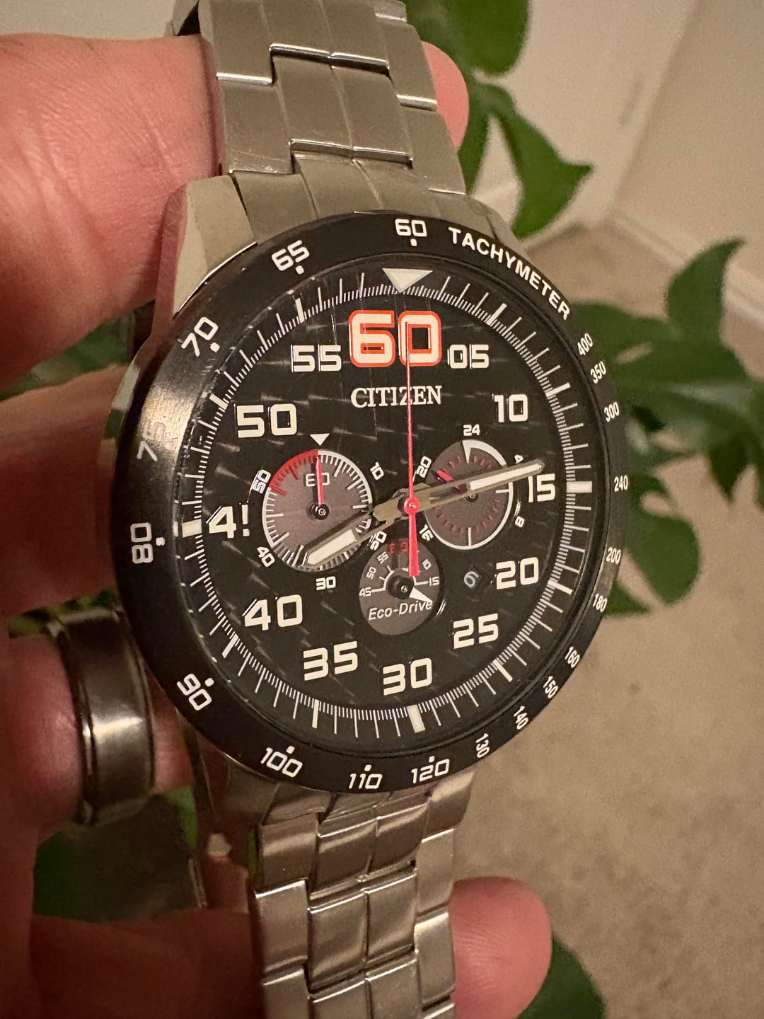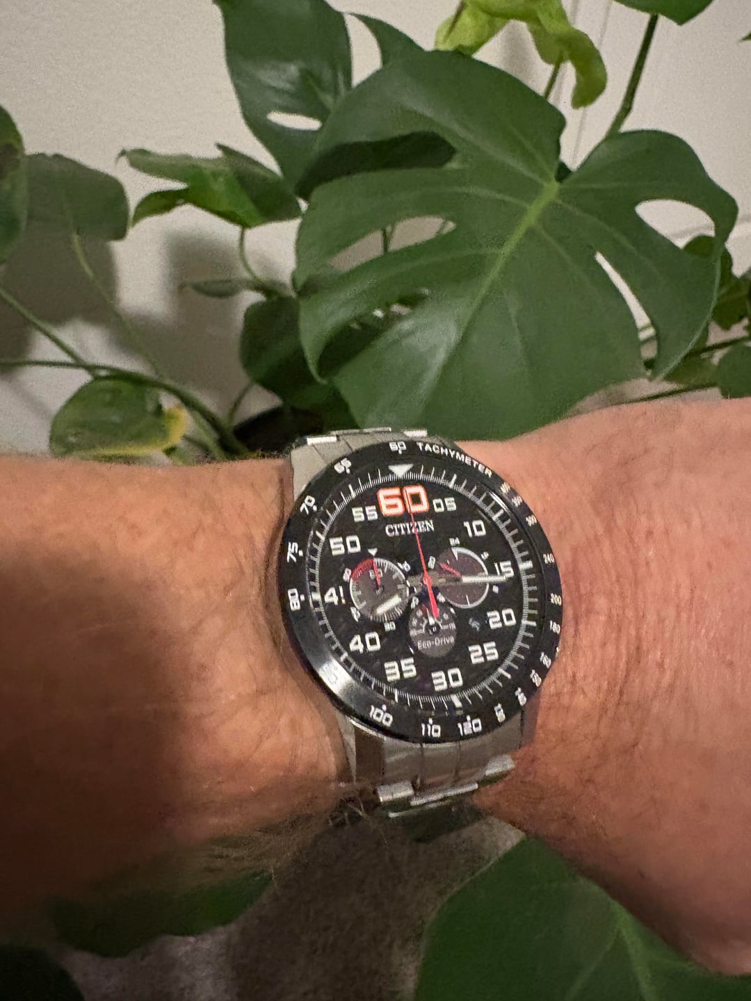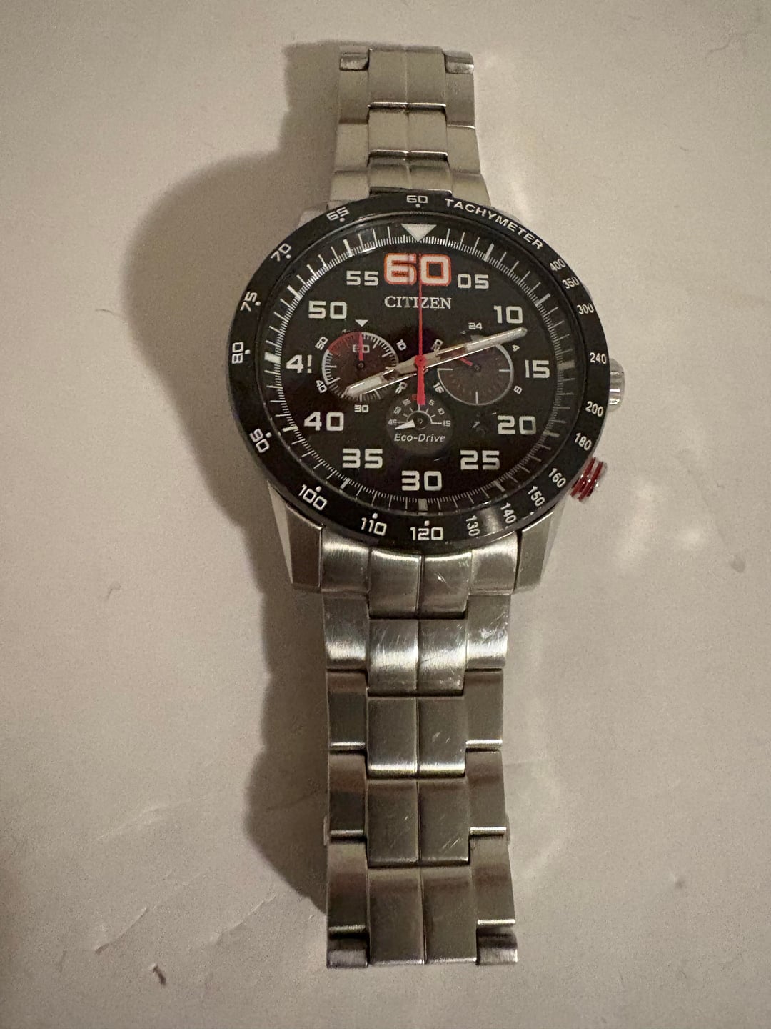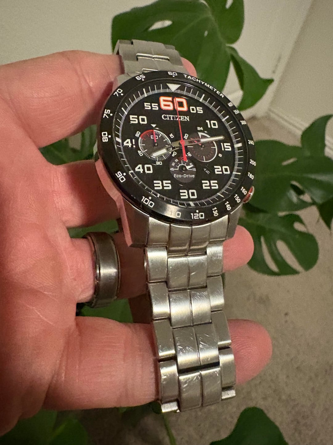 Looking to sell or trade my Citizen Eco-Drive Chrono. I love this watch but in my advanced age I need a date on the dial. Gently used with minimal wear just some desk diving marks that would buff out pretty easy if you wanted. No scratches on the crystal. 44 mm but wears a little smaller I’d say. Fits my 7” wrist as shown but comes with 3 extra links so should fit up to 8”+. 100 meters of water resistance. Tachometer. Really a cool piece. Feel free to ask any questions. Looking for $240 shipped obro. Will trade for something with a date. Preferable 40mm case size or higher but might consider down to 38” Cheers!