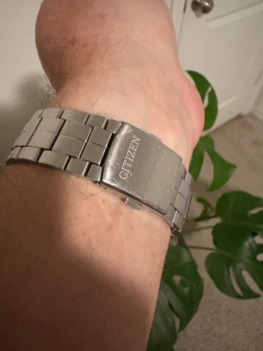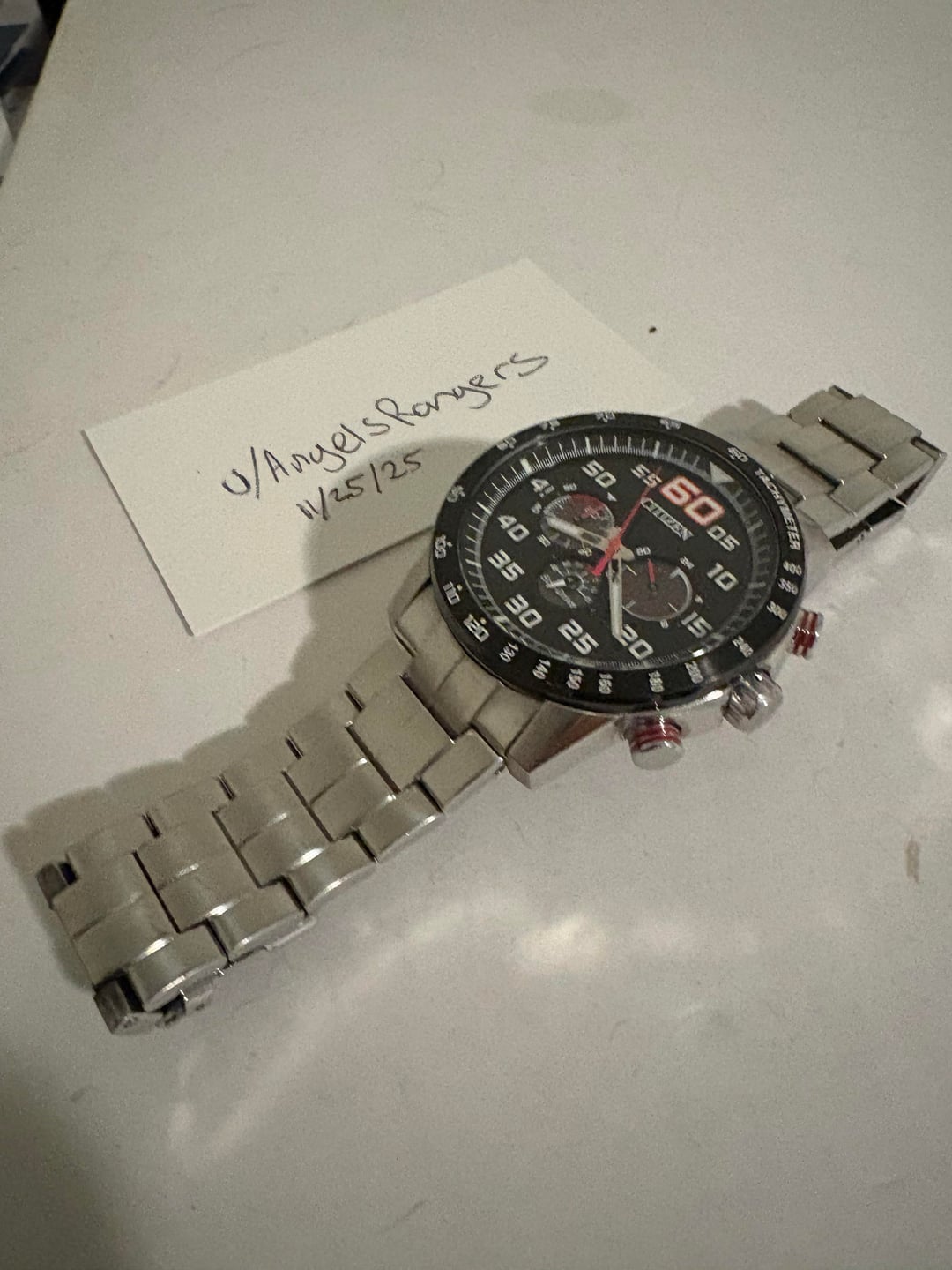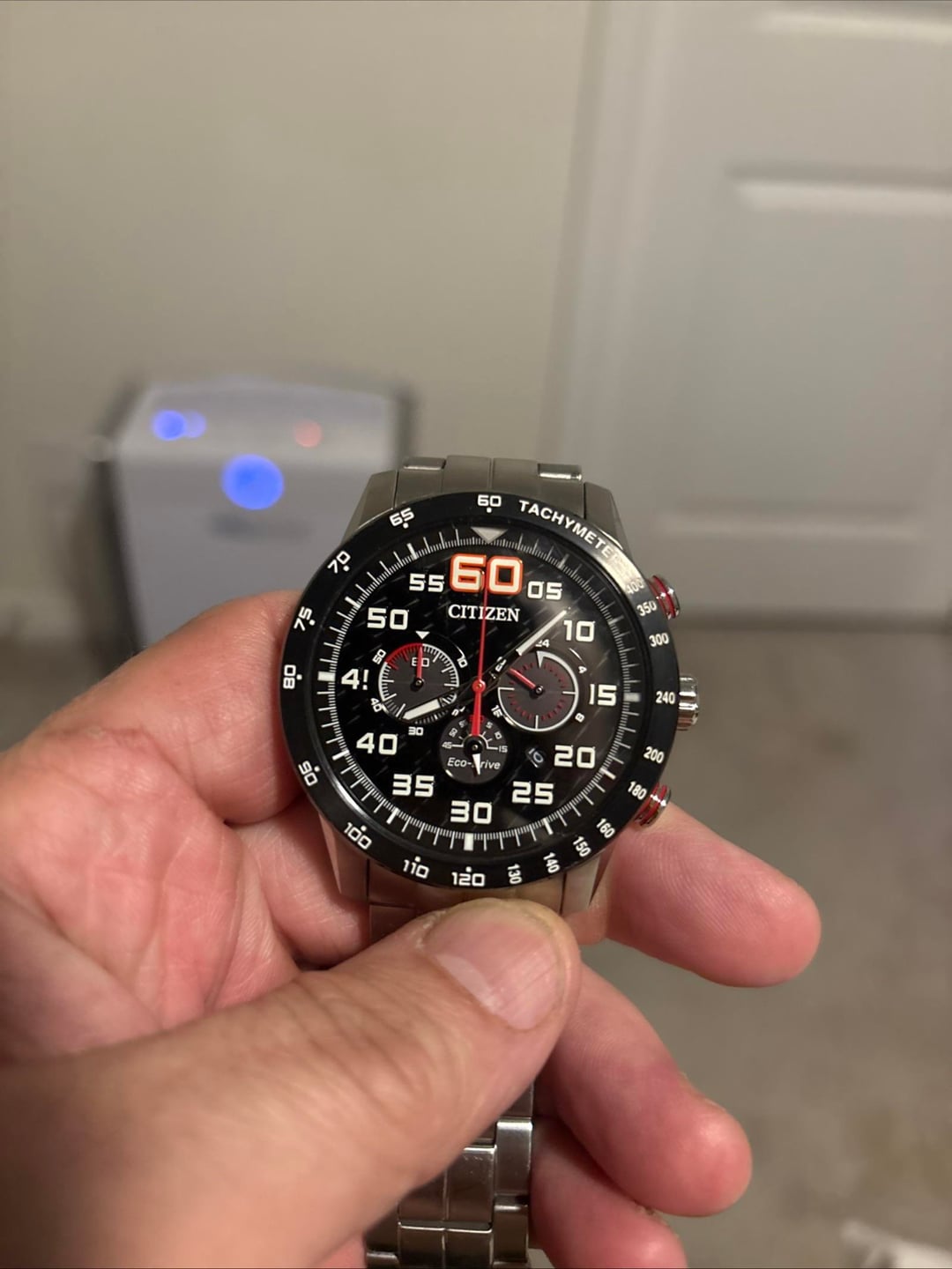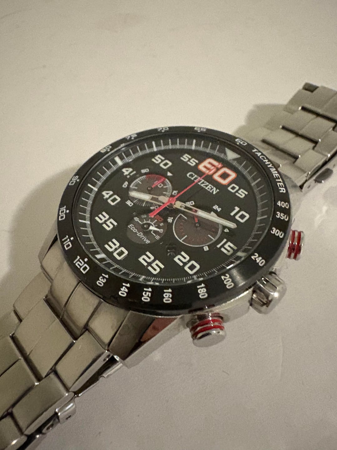 Looking to sell or trade my Citizen Eco-Drive Chrono. I love this watch but in my advanced age I need a date on the dial. Gently used with minimal wear just some desk diving marks that would buff out pretty easy if you wanted. No scratches on the crystal. 44 mm but wears a little smaller I’d say. Fits my 7” wrist as shown but comes with 3 extra links so should fit up to 8”+. 100 meters of water resistance. Tachometer. Really a cool piece. Feel free to ask any questions. Looking for $240 shipped obro. Will trade for something with a date. Preferable 40mm case size or higher but might consider down to 38” Cheers!