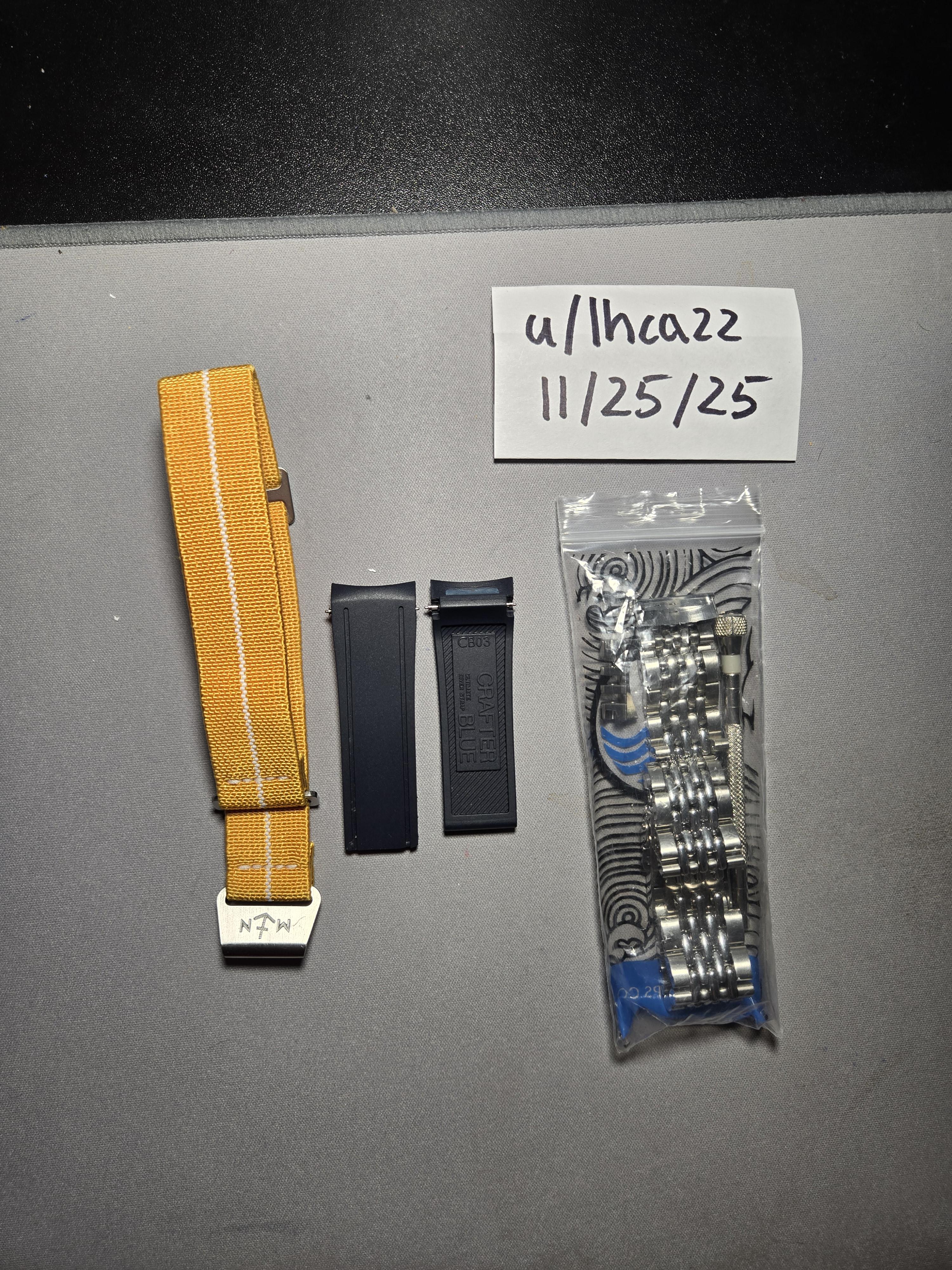 Hey yall Looking to sell this strap and bracelet - Crafter Blue Rubber Strap in Navy Blue (CB03) for Marinemaster bodies, 20mm, cut to 6.75" wrist , $25 shipped - Uncle Straps Beads of Rice bracelet, MM300 removable endlinks, great condition, $35 shipped - Erika's Original MN Strap, yellow, 20mm, $45 shipped Can do PayPal F&F, Zelle or Venmo. Buyer's protection available at buyer's expense. I am located near the KC Metro area if a local buyer is interested. Thanks for looking