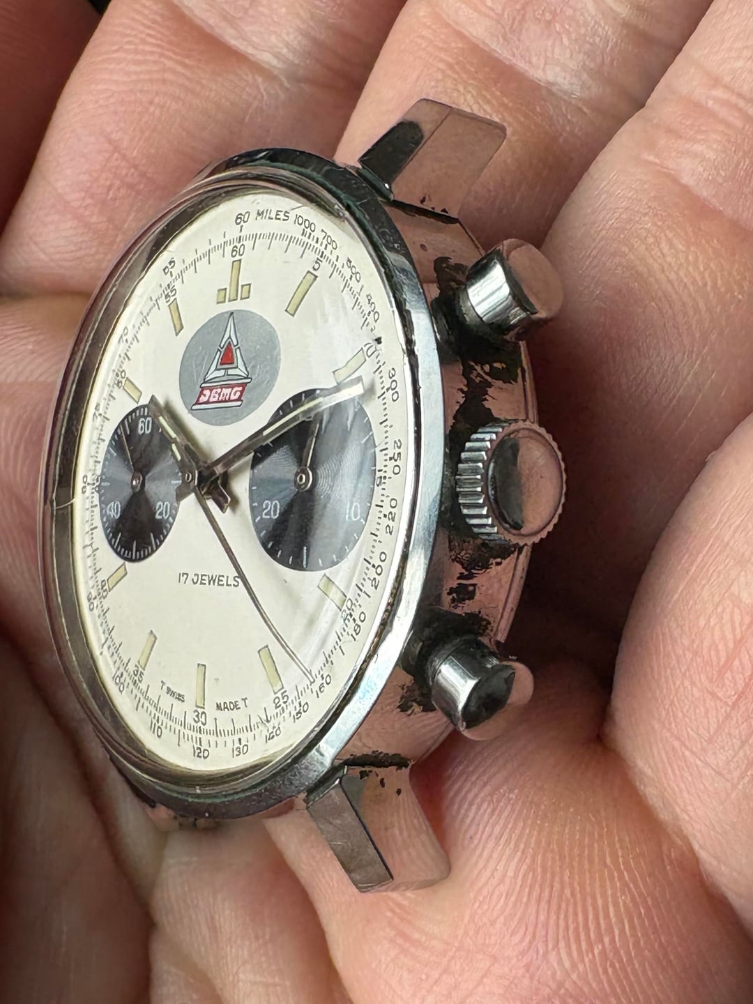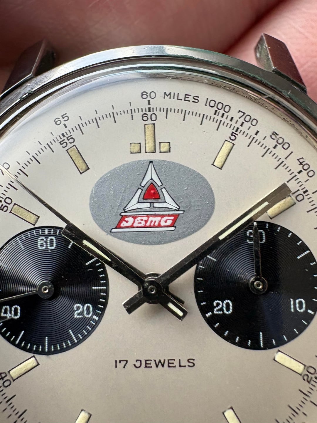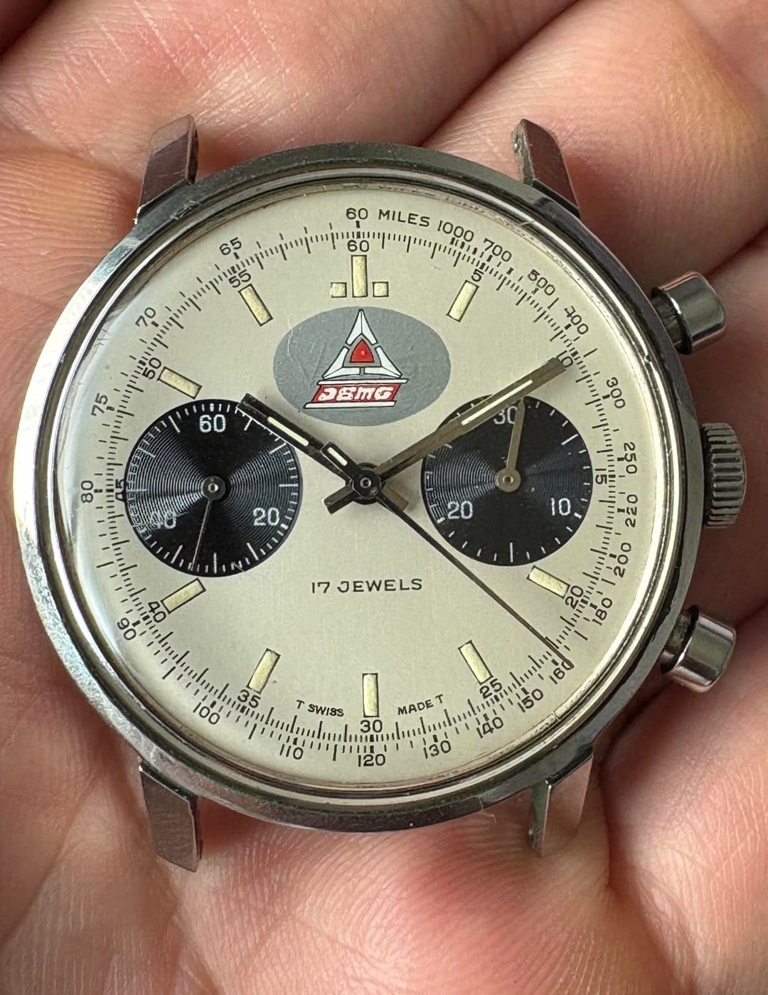 Vantage 449 two register panda dial chronograph circa 1960s/70s 1960s Dodge Fratzog brand logo printed over original Vantage logo, can see Vantage imprint up close. Text appears to be “DSMG”, curious if anyone knows what it represents. Have not seen another example. Dial and hands in good condition with matching tritium patina 37mm stainless steel case with screw down back Cal 449 (base valjoux 7733) manual wind movement is running and chrono functions work properly, however service history is unknown Head only; 19mm lug width Asking $750 shipped CONUS [album](https://imgur.com/a/BdTYIeW) [timestamp](https://imgur.com/a/BdTYIeW#eWXZsoi)
