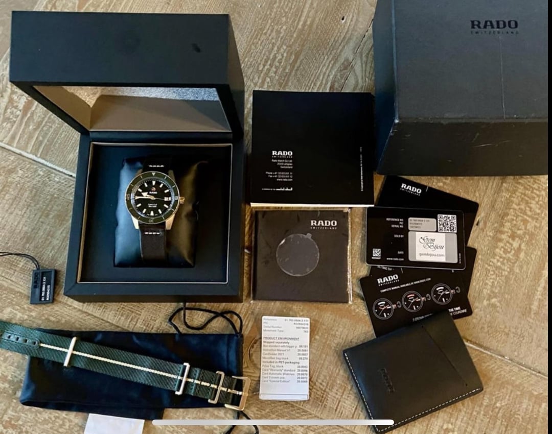 Happy Thanksgiving! I am selling my Rado Captain Cook Bronze (R32504315) with a deep green dial that plays with the light and combines a beautifully executed concave green ceramic bezel. I tried to capture the color variations this green dial can display in the pictures, from a dark forest to a brilliant emerald. It’s built to be tough with 300m water resistance, a concave ceramic bezel and an 80 hour power reserve. While the diameter is 42mm, it’s plenty light (79g with a titanium case-back) and thin (only 12.5mm) so it is an absolute dream on the wrist. Below is the link for Rado’s website detailing the specifications: https://www.rado.com/en_us/captain-cook-automatic-bronze-r32504315.html?srsltid=AfmBOorlOsNtPxVcxEm3kbTKIT_nZ1GsKa3JZQAIyfs6sQr0HxARuBwW There are also plenty of rave reviews online: Hodinkee: https://www.hodinkee.comHands-On: The Rado Captain Cook Bronze aBlogtoWatch: https://www.ablogtowatch.comTraveling With The Rado Captain Cook 42mm Automatic Bronze Watch ***Timestamp is the last picture in the album. This watch was worn sparingly as part of my large collection so it is in very good condition and comes as a full kit with all accessories/papers/cards/boxes/tags/etc. It came on a Rado leather strap with bronze buckle and I am also including the Rado NATO with bronze hardware (an extra $190 retail) that dresses it down and matches perfectly. I am selling this watch for $1450 (current retail is $3250 plus $190 for the NATO). This price includes shipping CONUS (insured with tracking), I accept most forms of payment (Zelle, PP F&F, and Venmo). I am happy to answer any questions, FaceTime, hop on a call or send additional pictures. Please don’t hesitate to reach out and thanks for looking!