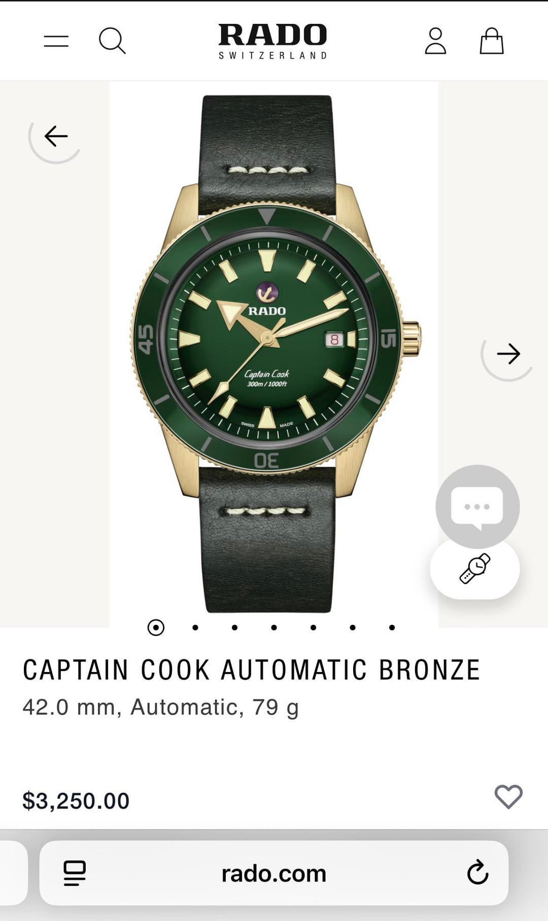 ![Thumbnail [WTS] Rado Captain Cook Bronze- Green Dial w/Concave Ceramic Bezel, Full Kit on Leather+OEM NATO w/Bronze Hardware. $1450 6](https://cdn-cf.watchpatrol.net/120x120/img/full/6ea7d17ca43964e558ddf38caec5b93d4e53d799.jpg)