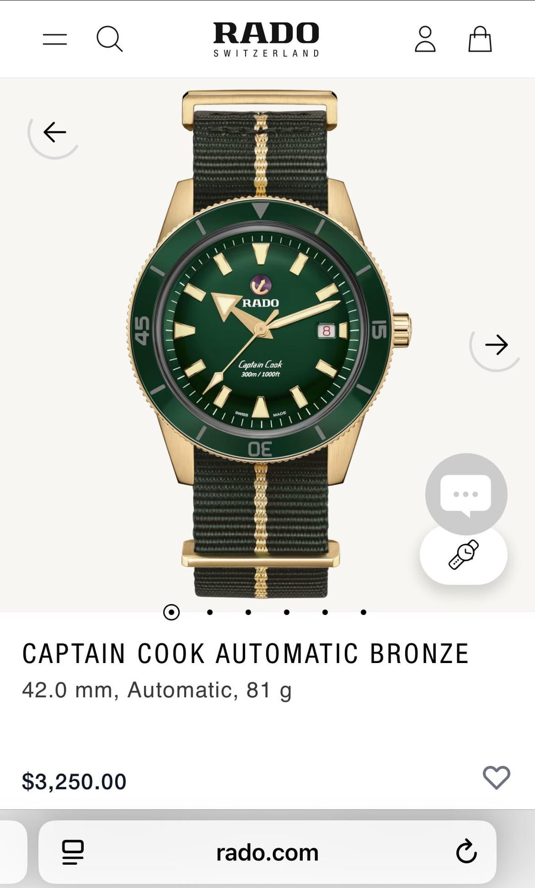 ![Thumbnail [WTS] Rado Captain Cook Bronze- Green Dial w/Concave Ceramic Bezel, Full Kit on Leather+OEM NATO w/Bronze Hardware. $1450 3](https://cdn-cf.watchpatrol.net/120x120/img/full/8ef33dbfa336d47f516292ba1d975998920436ce.jpg)