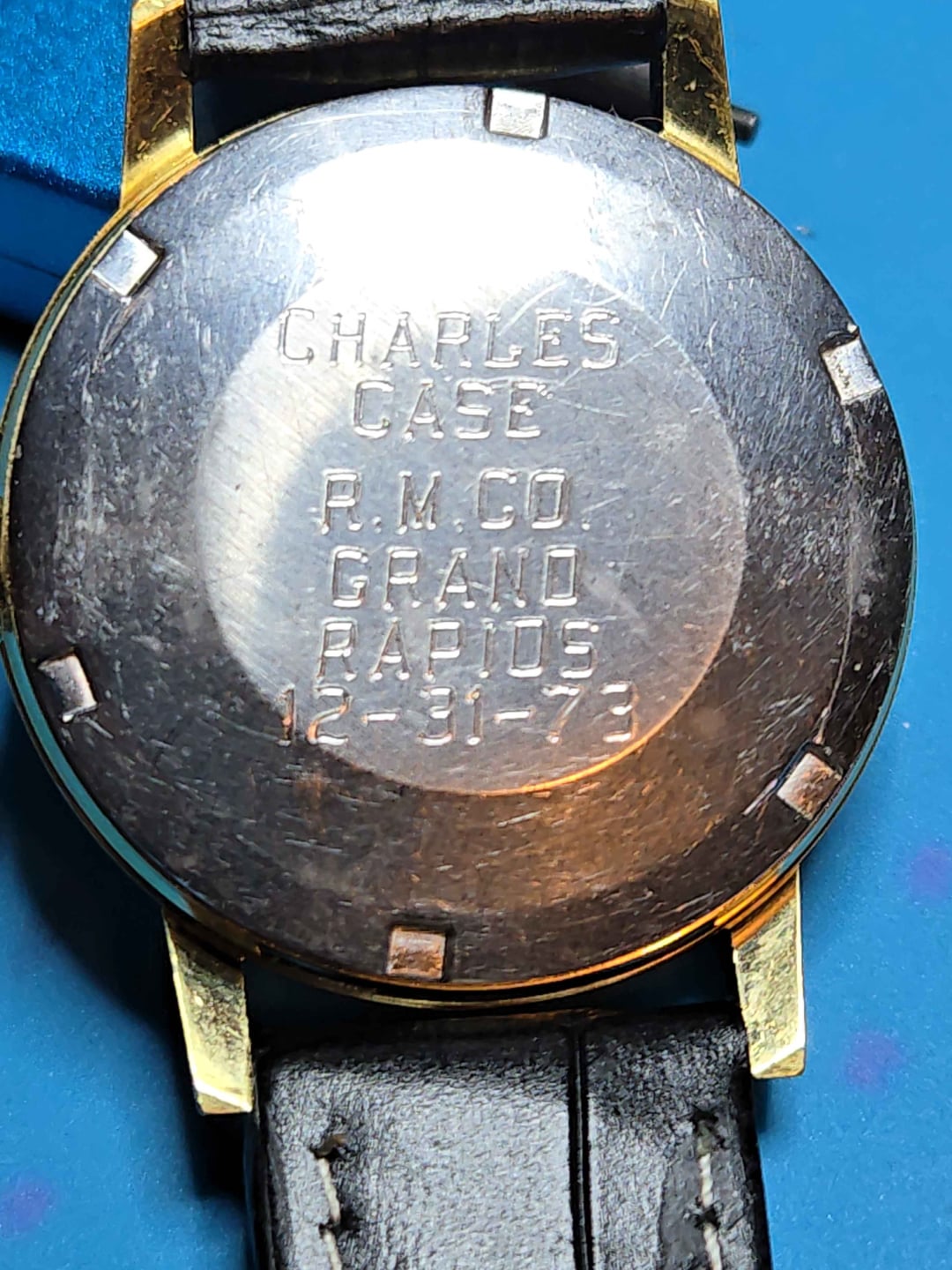 This is a 1973 Omega Geneve gold filled watch. 35mm case, 11mm thick. Runs well and keeps good time but probably needs to be professionally regulated. I had it cleaned and the original crystal polished by my watch shop. It has a super-cool date advance feature where you just push the crown to advance the date. All works perfectly. Strap is new leather but obviously not an original. $695 shipped.
