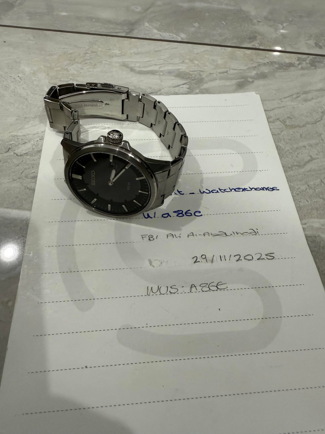 Hey all Seiko solar, 39 mm. Used in overall very good condition Watch only, missing a few links, will fit 18.5 cm Asking : $250 shipped Via FedEx from Kuwait No trades Please read the disclaimer before shooting a PM Thanks ⸻ Watch Sale Disclaimer: • I am a private collector, not a store or reseller, and I am not affiliated with any watch brand mentioned in this listing. • The watch will be shipped from Kuwait via FedEx, and a tracking number will be provided to the buyer once dispatched. • Buyer is responsible for any customs duties, VAT, or import taxes that may be charged upon delivery, depending on your country’s regulations. • I welcome all reasonable requests for additional information, including more photos and/or videos to verify the watch and its condition. • Payment terms: • Established Watchexchange members with verifiable feedback may pay via PayPal Goods & Services only, I do not accept Friends & Family nor Zelle • New or low-feedback users must pay via wire transfer. All watches are sold as-is, with details described to the best of my knowledge. Serious inquiries only, please. Thanks for looking