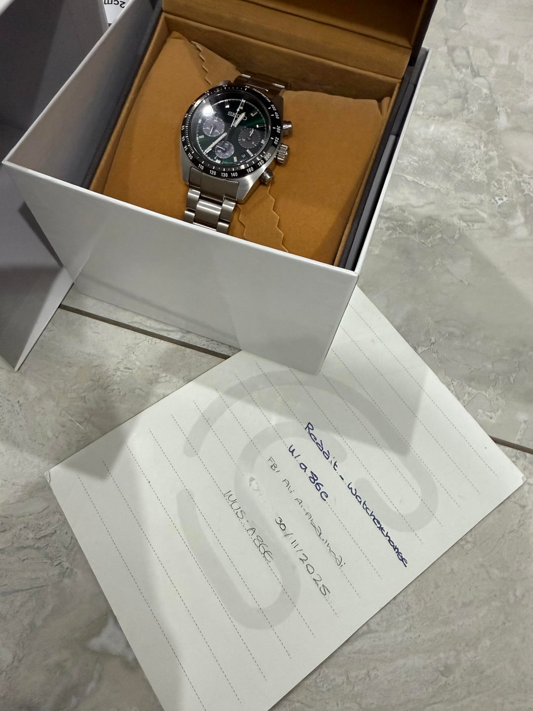 Greeting On hand is the solar Seiko Prospex Speedtimer Emerald Green japan Watch is in very good conditon, hair line on the side case and missing 2 links. Fits about 17 cm wrist Asking price: $465 shipped TYD No trades Thanks for looking ⸻ Watch Sale Disclaimer: • I am a private collector, not a store or reseller, and I am not affiliated with any watch brand mentioned in this listing. • The watch will be shipped from Kuwait via FedEx, and a tracking number will be provided to the buyer once dispatched. • Buyer is responsible for any customs duties, VAT, or import taxes that may be charged upon delivery, depending on your country’s regulations. • I welcome all reasonable requests for additional information, including more photos and/or videos to verify the watch and its condition. • Payment terms: • Established Watchexchange members with verifiable feedback may pay via PayPal Goods & Services only, I do not accept Friends & Family nor Zelle • New or low-feedback users must pay via wire transfer. All watches are sold as-is, with details described to the best of my knowledge. Serious inquiries only, please. Thanks for looking