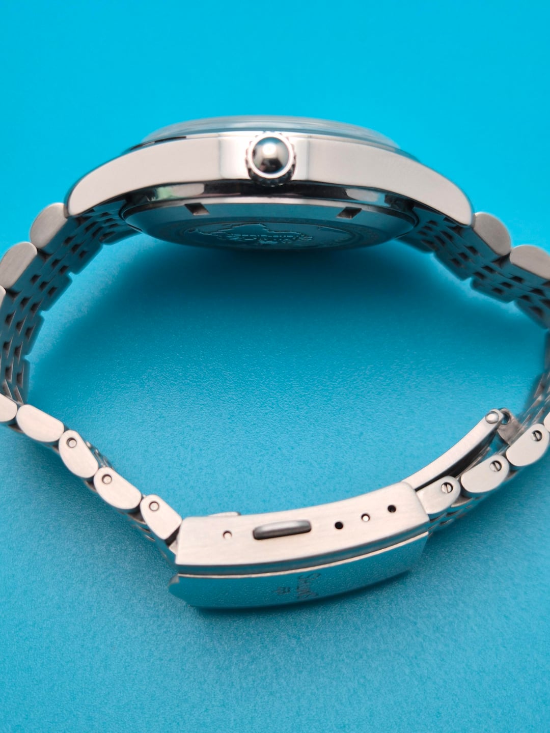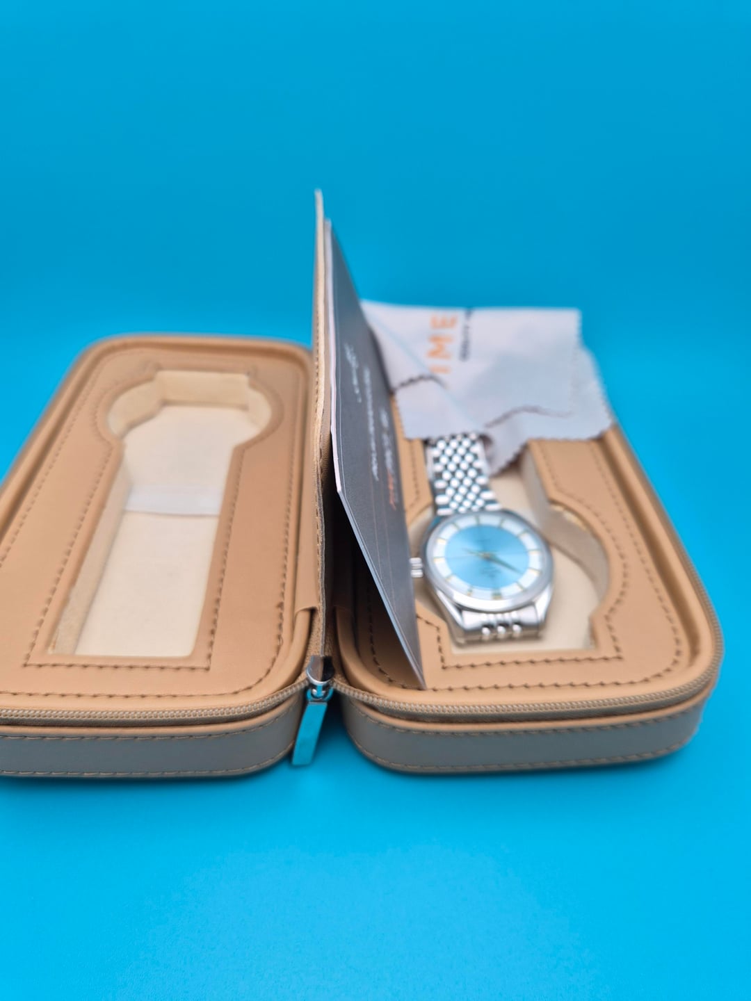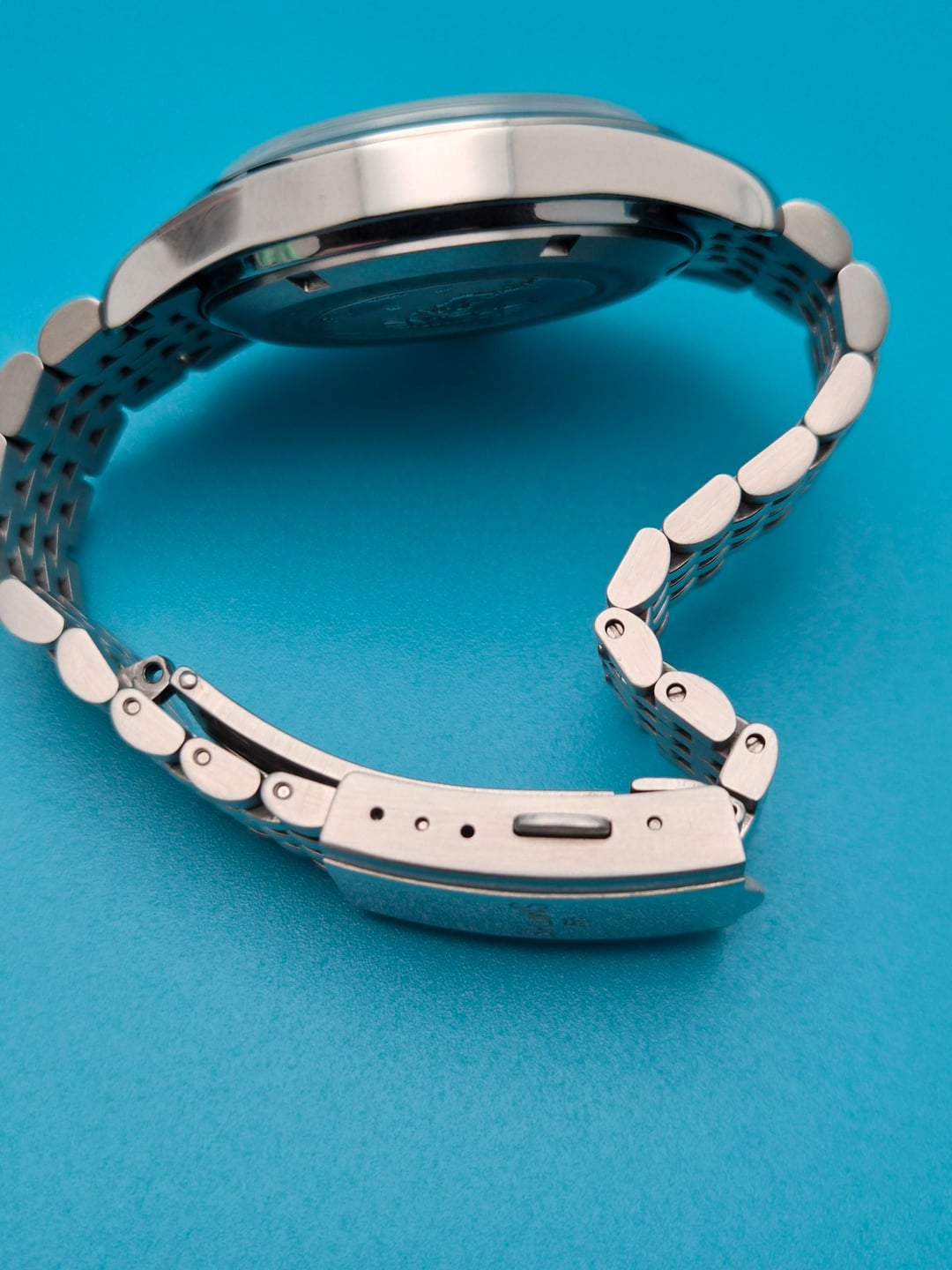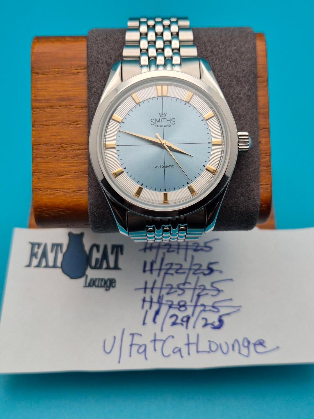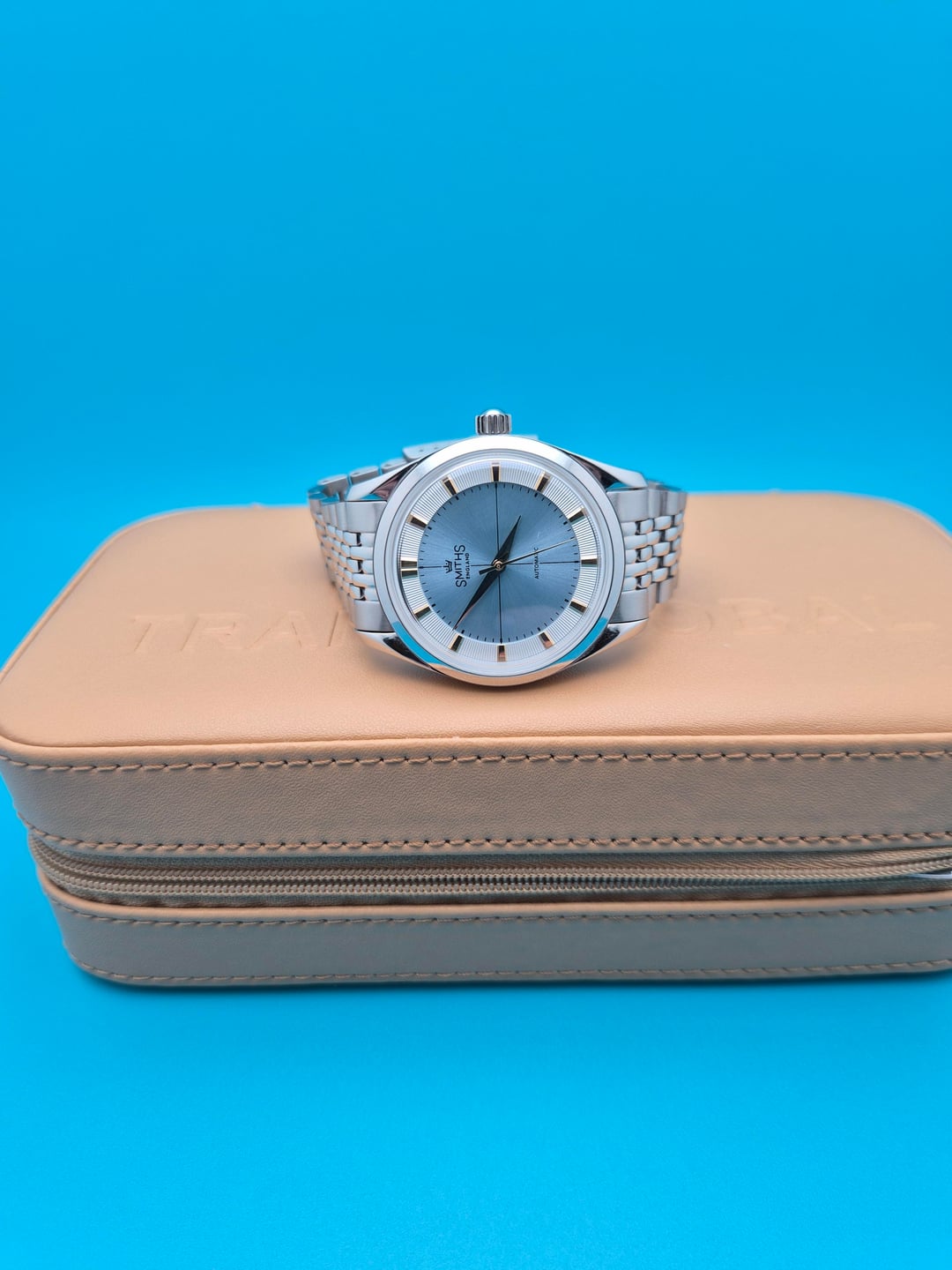 For sale: Smiths Trans-Global PRS-54 Ice Blue Dial Condition: Pre-owned. Watch is in excellent condition. Slight wear on bracelet clasp. The dial is stunning! This watch is currently sold out on Smiths Watches website. Details: • Case 316L stainless steel, all polished • Diameter 38mm, 41mm including crown • Lug to lug height 46.75mm • 12.3mm to the top of the sapphire crystal • Lug spacing 20mm • Anti-magnetic 20,000 • Water Resistance 330 feet Includes: Original box, materials, watch cloth, extra links Price: $499 Payment: PayPal F&F (preferred), Venmo, and Zelle accepted. Shipping: Free shipping within CONUS. Location: Fernandina Beach, Florida Thank you for viewing my listing.