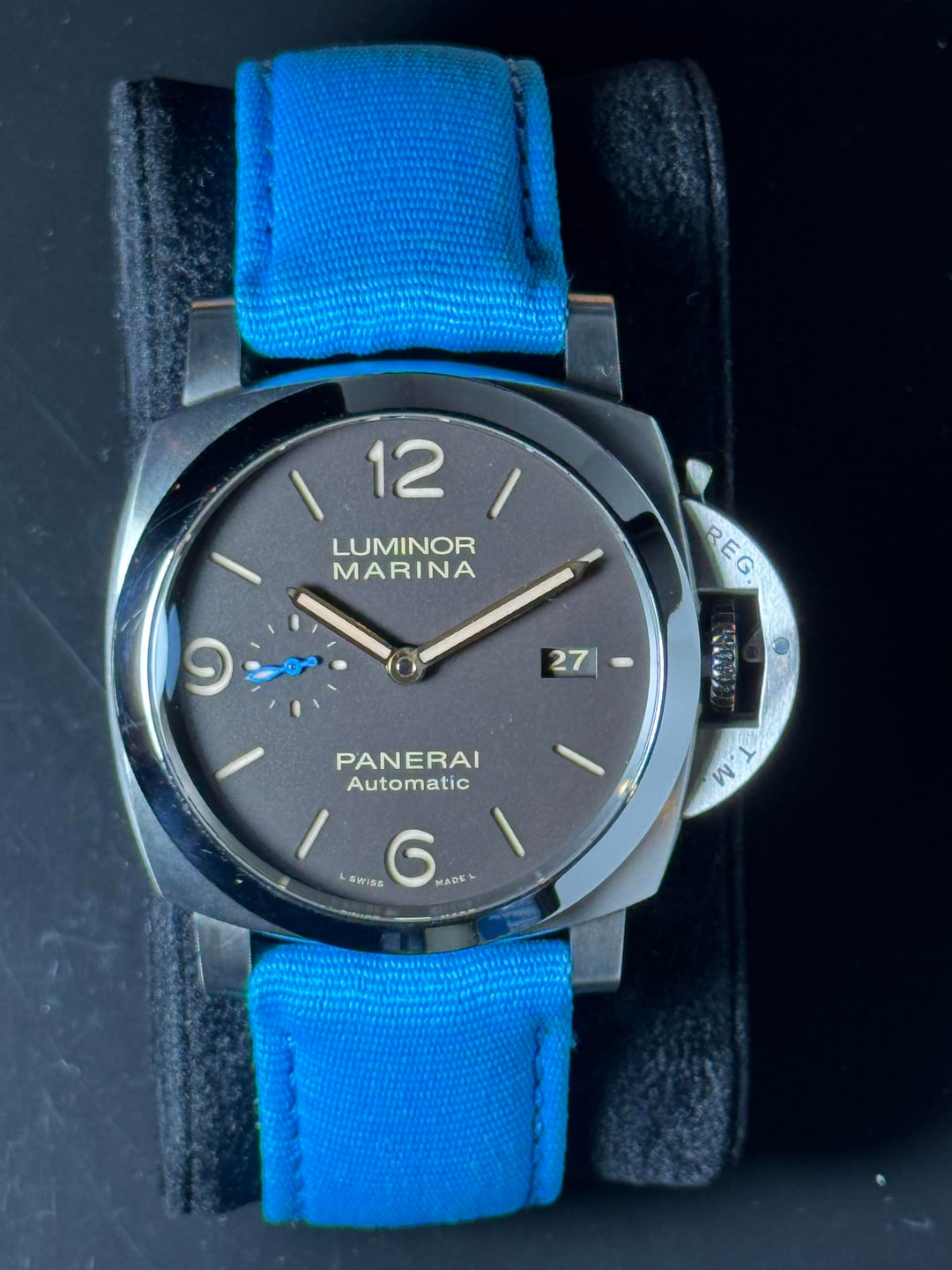 2018 Panerai 1351 (PAM01351) Titanium case, Brown Dial Luminor Marina Limited Edition, comes with aftermarket blue textile and leather strap (matching the seconds hand) and OEM Black rubber strap and tools for changing the strap. With original Boxes (inner and outer) and Papers and manual. In excellent pre-owned condition. Very classy look. Please feel free to ask any questions you might have prior to purchasing as ALL SALES ARE FINAL. Timestamp: [https://imgur.com/a/vgOJ9XU](https://imgur.com/a/vgOJ9XU) Asking: $5500 + L I accept Wire, Zelle or Cash if local to NYC for F2F