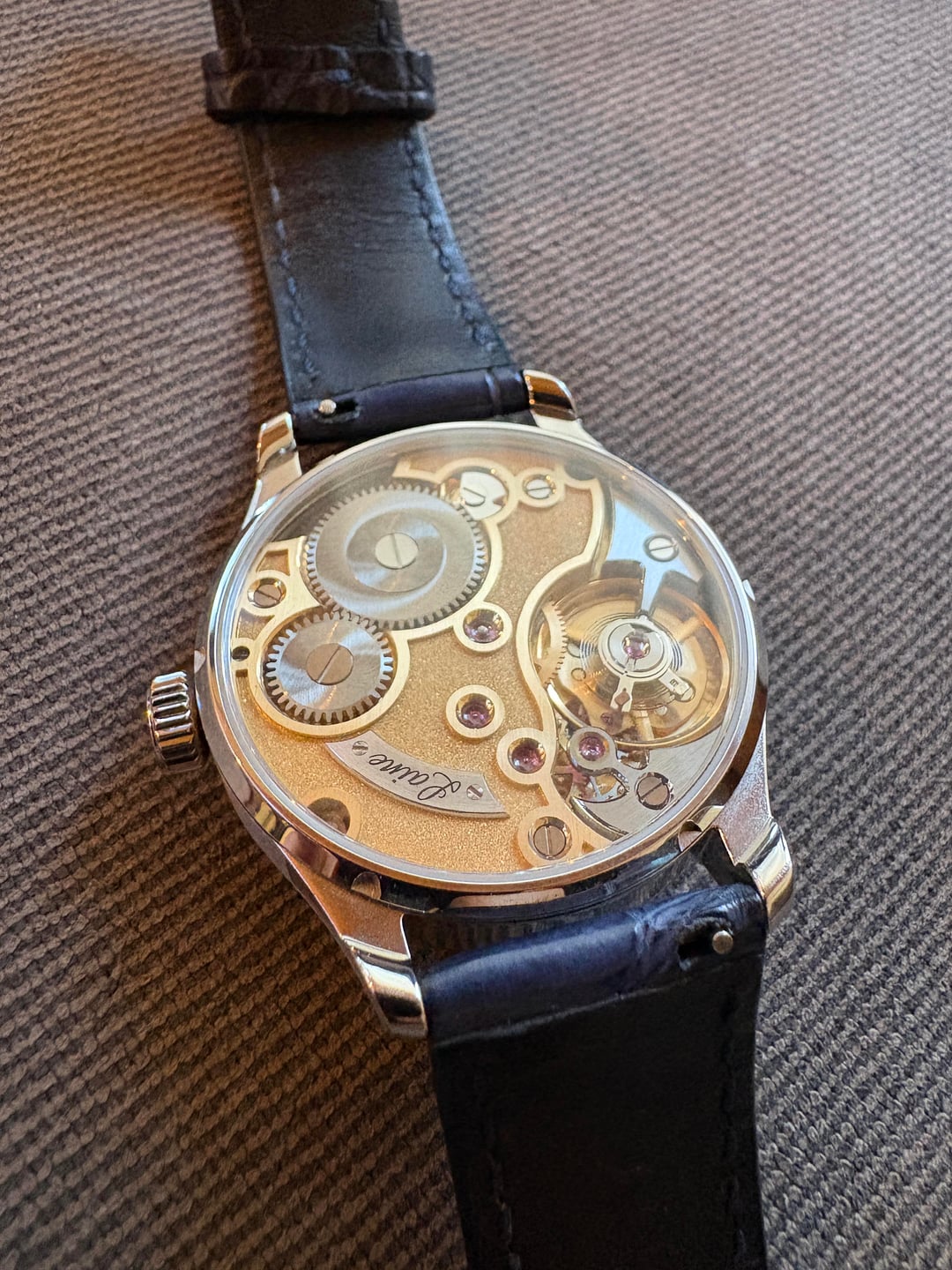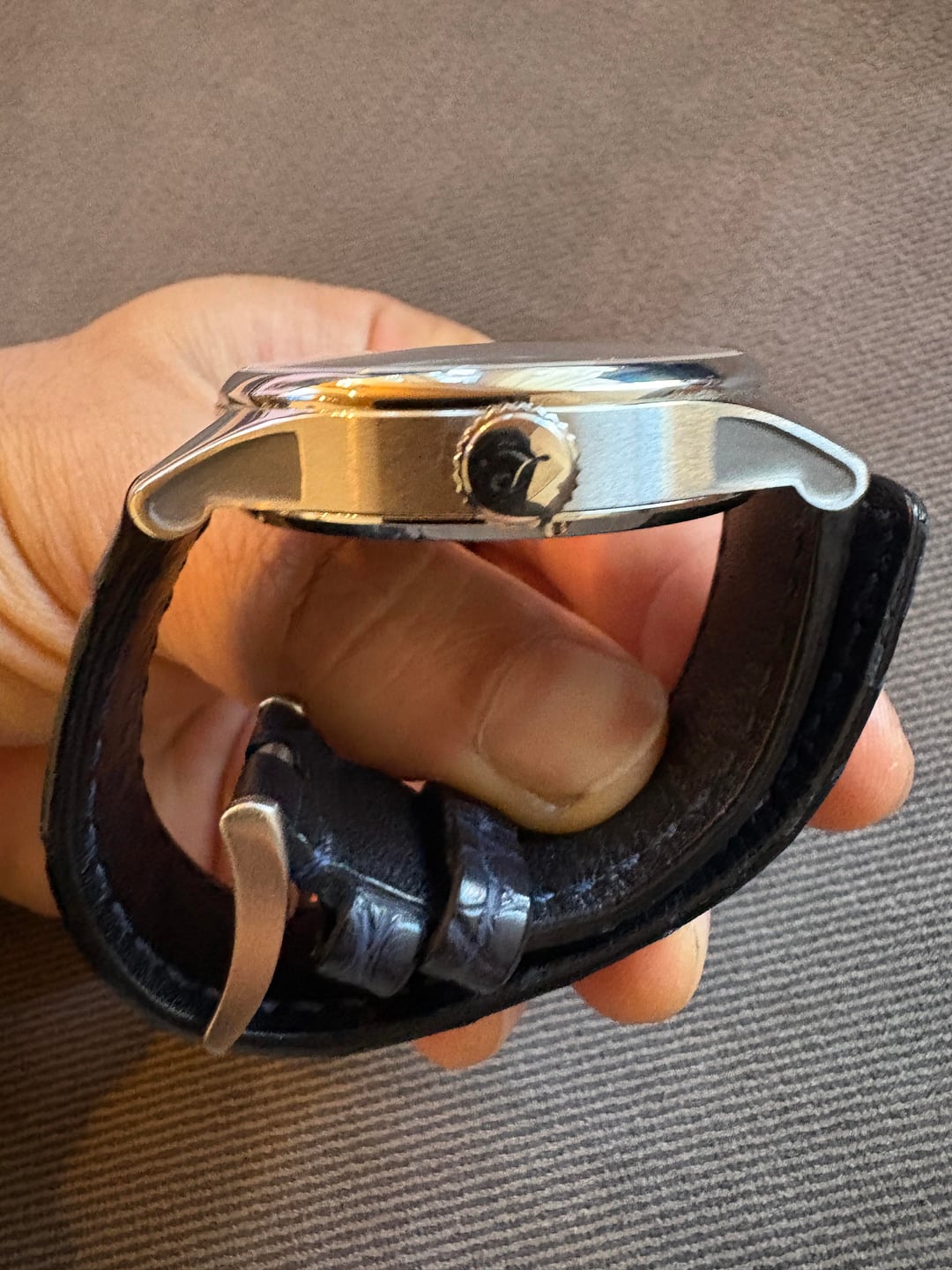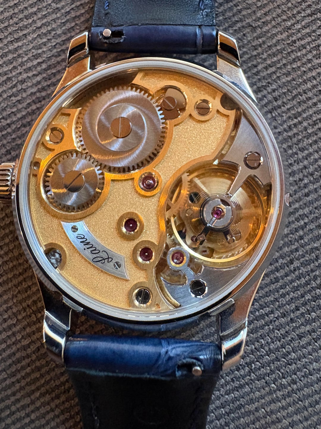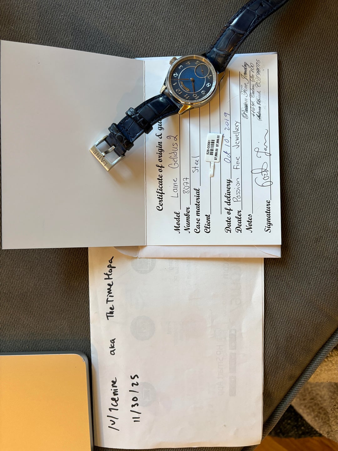 Here’s one that doesn’t show up too often. The Gelidus 2 isn’t just a watch—it’s a masterclass in restraint, craft, and the kind of finish work that makes loupe-wielders audibly gasp. Made by Finnish independent watchmaker Torsti Laine, the Gelidus 2 balances old-school horology with a quiet confidence that says, I don’t need to shout to be noticed. The frosted dial? Hand-finished. The movement? A reworked Unitas 6498 that’s been dressed up to the nines—hand-beveled bridges, black-polished steelwork... every screw, every angle, every grained surface feels intentional. **Condition:** Overall very good. Minor scratching on bezel between 6 and 7, barely noticeable in normal light and would polish out if needed. Keeping great time. **Scope of delivery:** Full set with 2019 card. **Specs:** Case size: 40.5mm Lug-to-lug: 48mm Case thickness: 10.5mm Water resistance: 50m **Price:** $5600 shipped insured in the US. Payment by wire, Zelle, or cash F2F in SF Bay Area. PayPal is only accepted for users with 25+ successful transactions or similar verifiable references, no exceptions. **Trades:** Not at this time. **Trusted seller in watches and collectibles (i.e. Pokemon cards). Dozens of watch transactions, hundreds overall, 100% positive across platforms.**