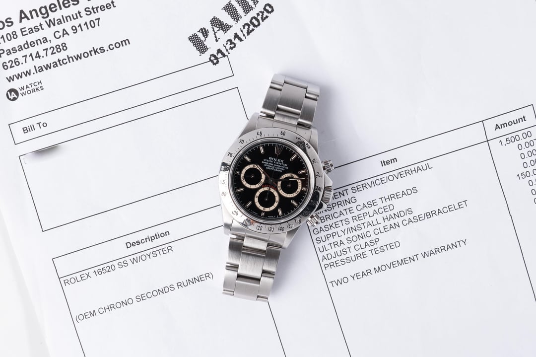1991 Rolex Cosmograph Daytona 16520 Zenith Black Dial $23,950 Daytona reference 16520 with highly coveted zenith movement in stainless steel and black dial. The watch has a later non inverted 6 dial. Small scratch on the dial between 11 and 12 o’clock, minor bubbling as well as light degradation surrounding the subdials which have developed a nice, creamy color. Some missing enamel on the stainless steel bezel on some of the outer numerals. The watch was serviced by LA Watchworks in 2020, where it received a full service overhaul as well as an OEM chrono hand replacement. Redacted service papers will be included. Serial - Year: N3 serial ~1991 Bracelet - Strap: 78390 bracelet with P clasp. 12 links. Fits up to 7.5” wrist Box - Papers - Accessories: Service papers from LA Watchworks Service History: 2020 via LA Watchworks. Running at 3s/d, 276 amplitude Pictures https://imgur.com/a/16520-mDlCRBt Timestamp https://imgur.com/w2WMOb4 Watches will be shipped via FedEx upon receipt of bank wire only. Sorry, no P2P payment platforms due to scams. Zelle with references. Prices are for an outright purchase, no trades preferred. **Inquiries:** [Instagram](http://www.instagram.com/angelcitytime), PM or chat Member of r/watchexchange for years. Excellent references on other platforms and forums which I can provide upon request. Please buy with confidence. All sales are final. Thanks for looking!