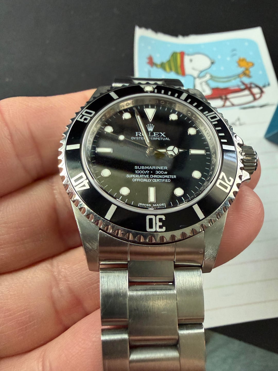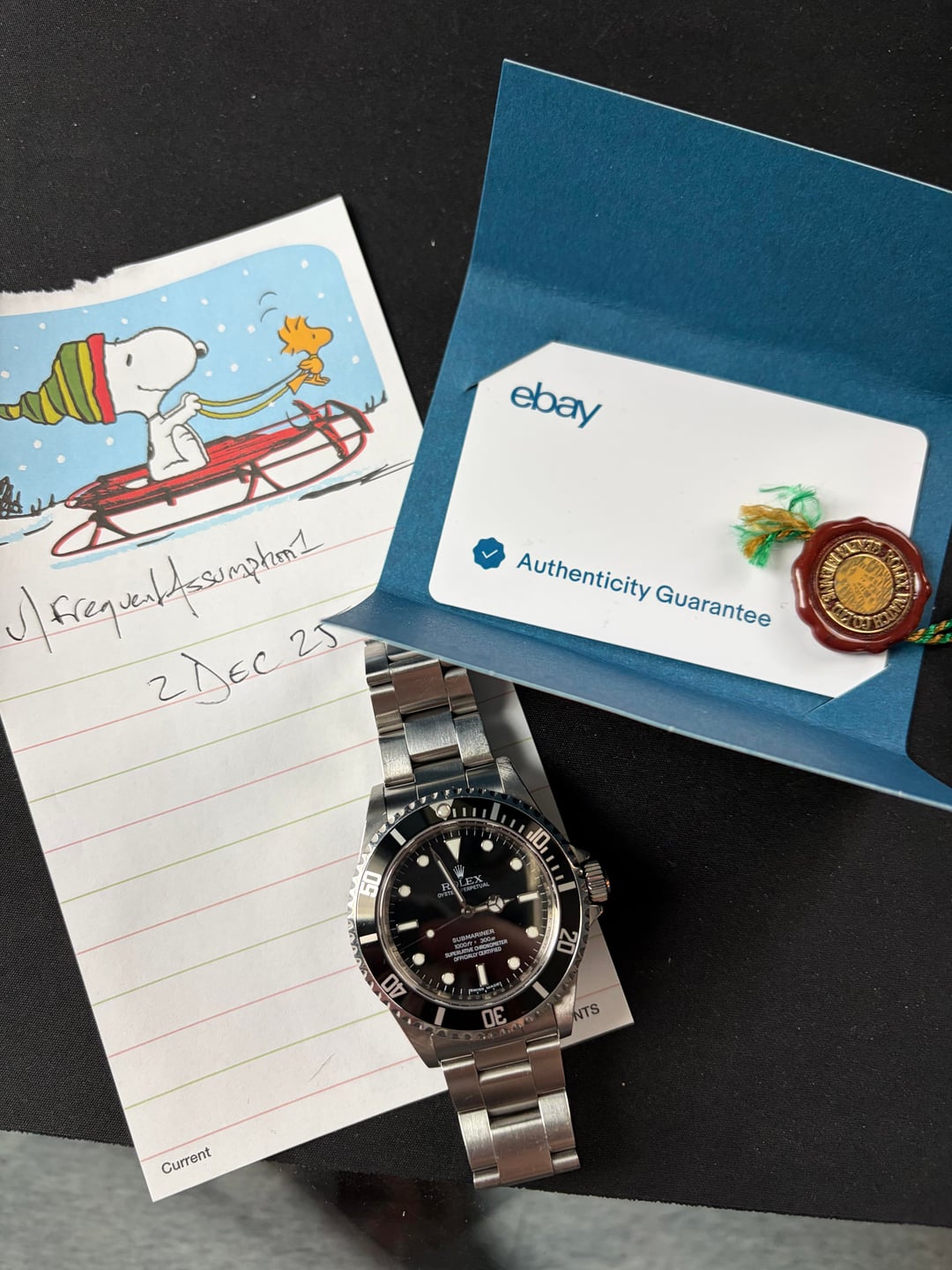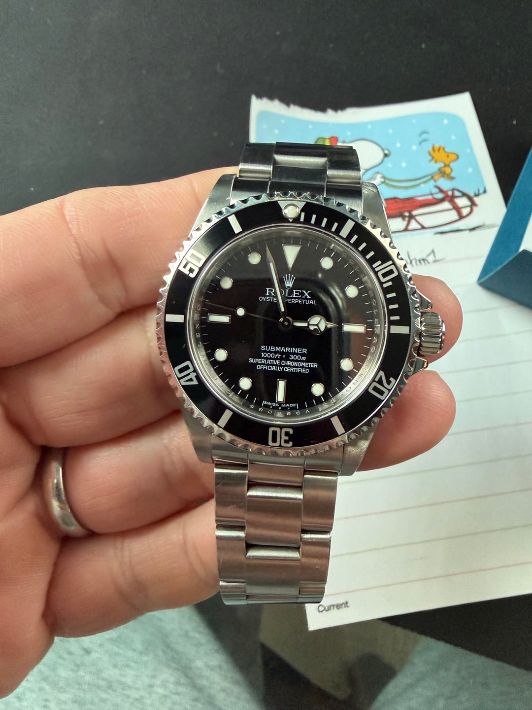 Catch and release for me. Case: Excellent condition 40MM case with thick lugs. Dial: Excellent dial with matching hands. No nicks or flea bites on the crystal Bracelet: Original bracelet. No stretch. 12 links fit up to 8.2” fully extended. Diving extension included Service history: No service history. Runs about 3-4 sec fast a day. All parts original and luminova shines bright. Comes with original Swiss tag and eBay authentication card dated Sept 2025 Offered at $7,990 shipped conus FedEx next day fully insured to your local FedEx location. I will gladly hop on a FaceTime call, exchange info, communicate via text or phone and over communicate with the buyer at every step of the way. This is the cheapest submariner on the market, looking at ebay, C24 or watch charts. Video: https://imgur.com/gallery/rolex-submariner-PHZqYCw No trades desired. Payment by PayPal F&F, Zelle or bank wire. Located in Southern CO Plenty of feedback here, eBay and WUS.