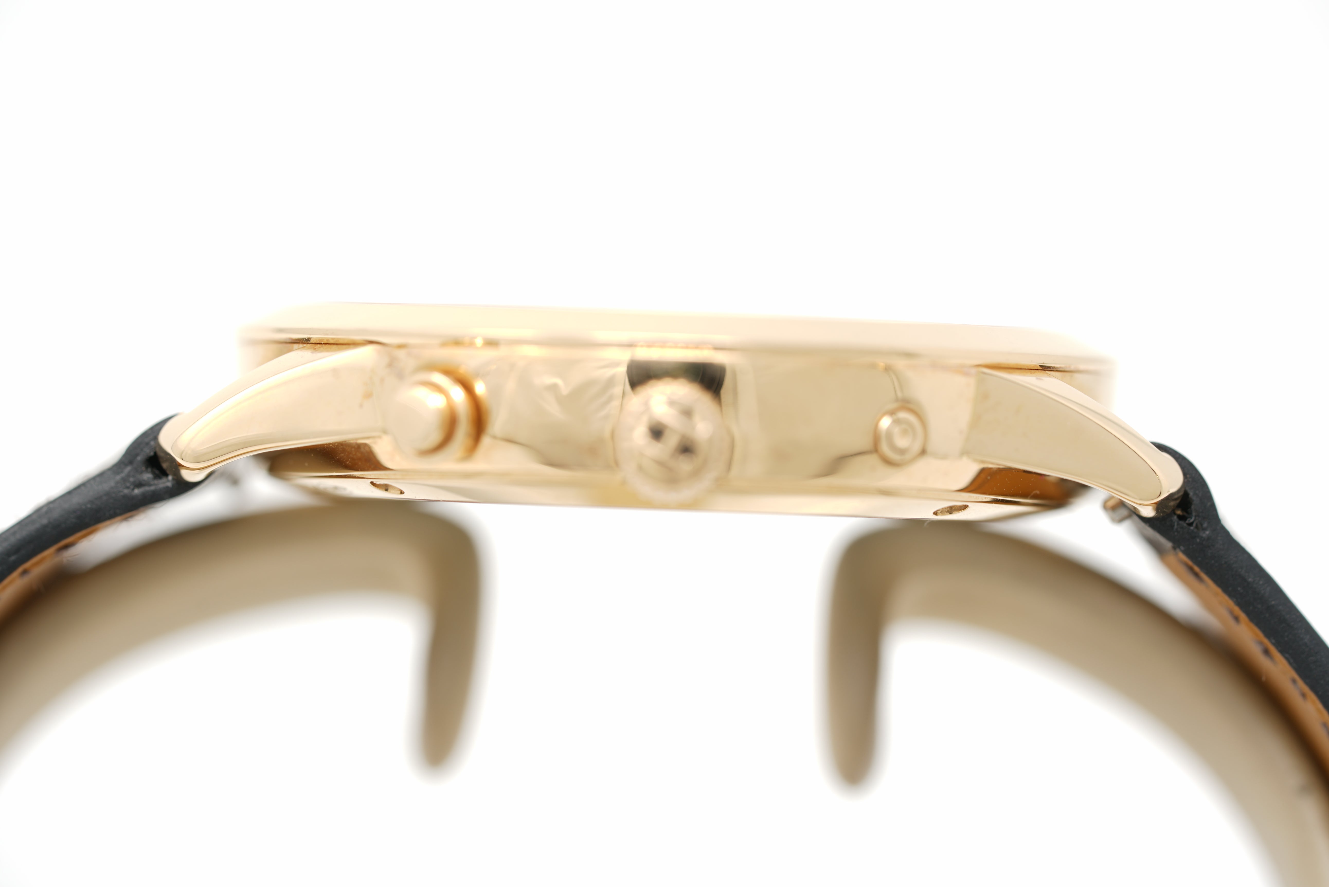 This pre-owned watch is in 86% condition due to slight marks on the lugs, bezel, and throughout the case. The strap is in 92% condition due to wear and creasing. The strap will accommodate a wrist size up to 7 and 3/8 inches. Originally purchased in December 2015, this watch comes with its inner and outer box, instruction manual, warranty card, and the one-year Topper Pre-Owned Select warranty.