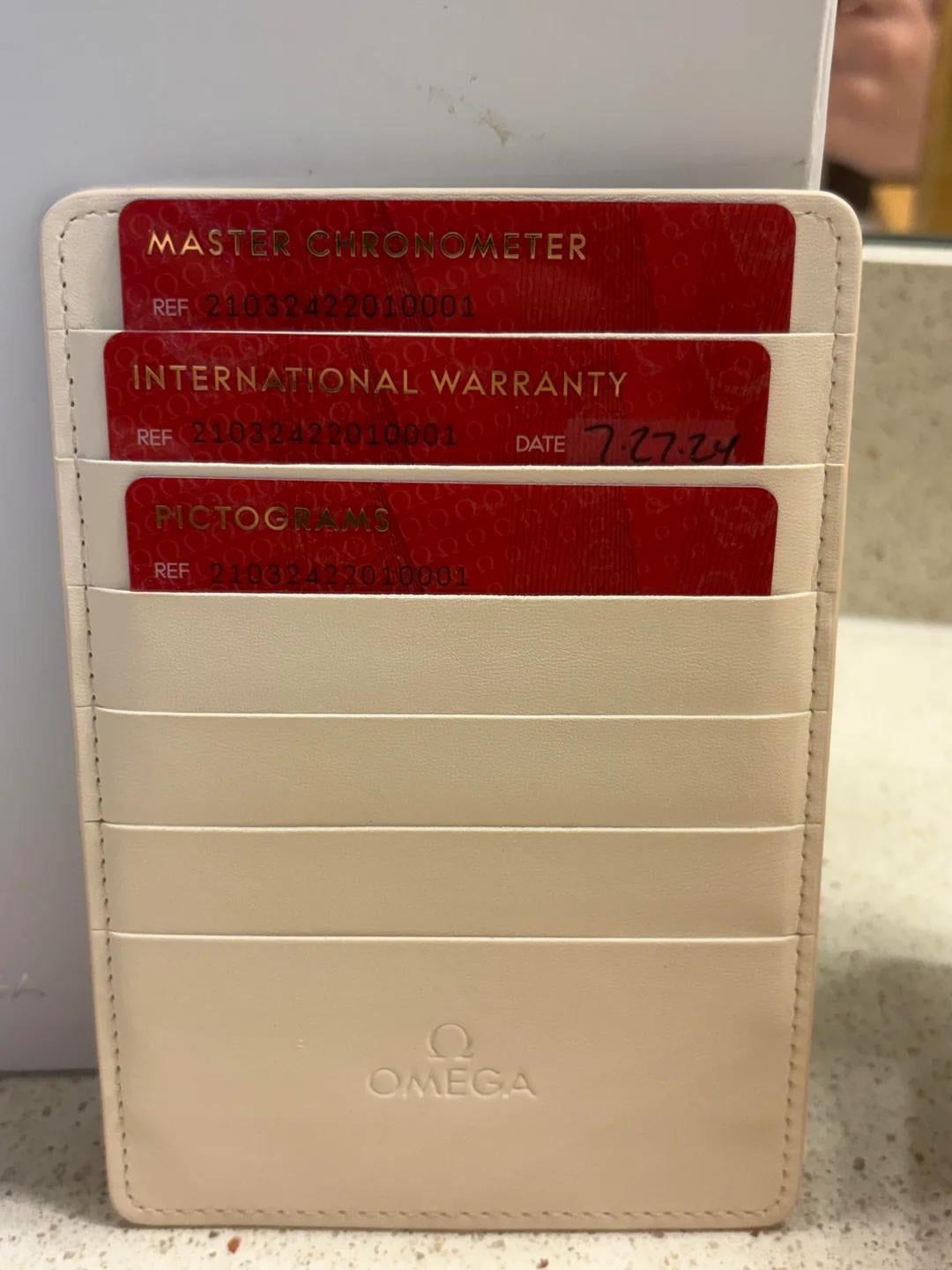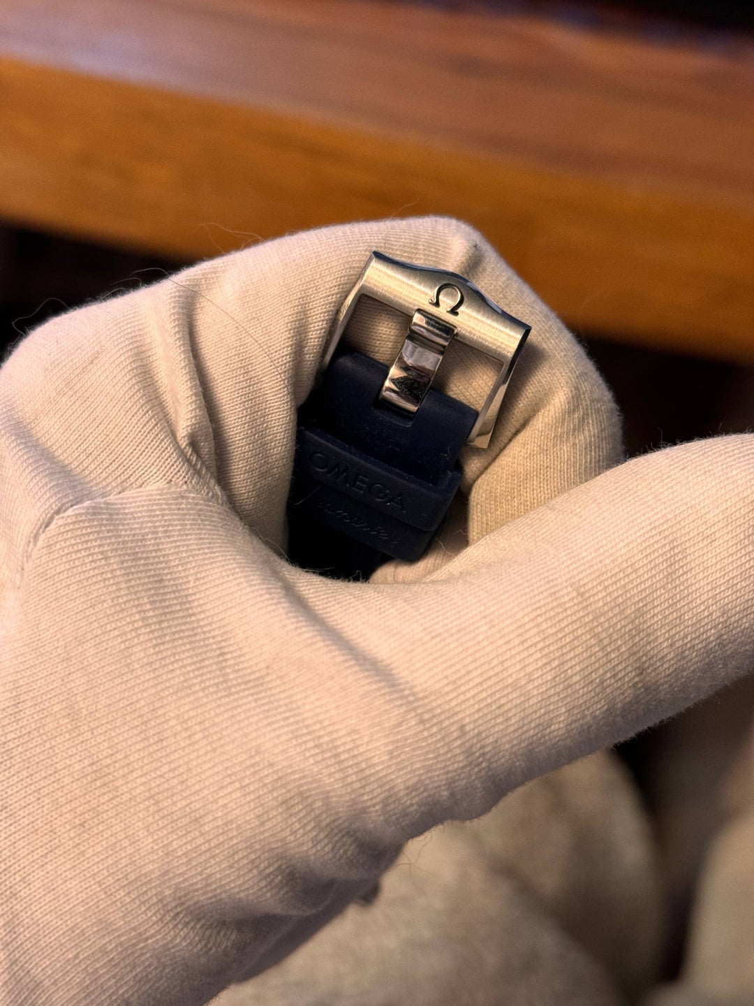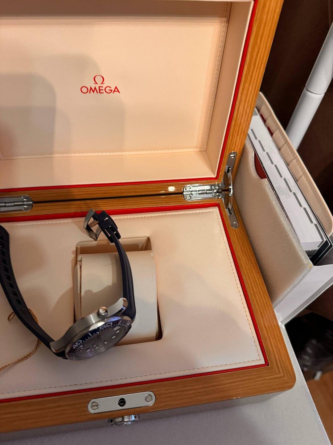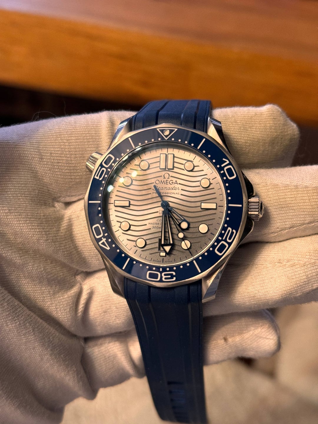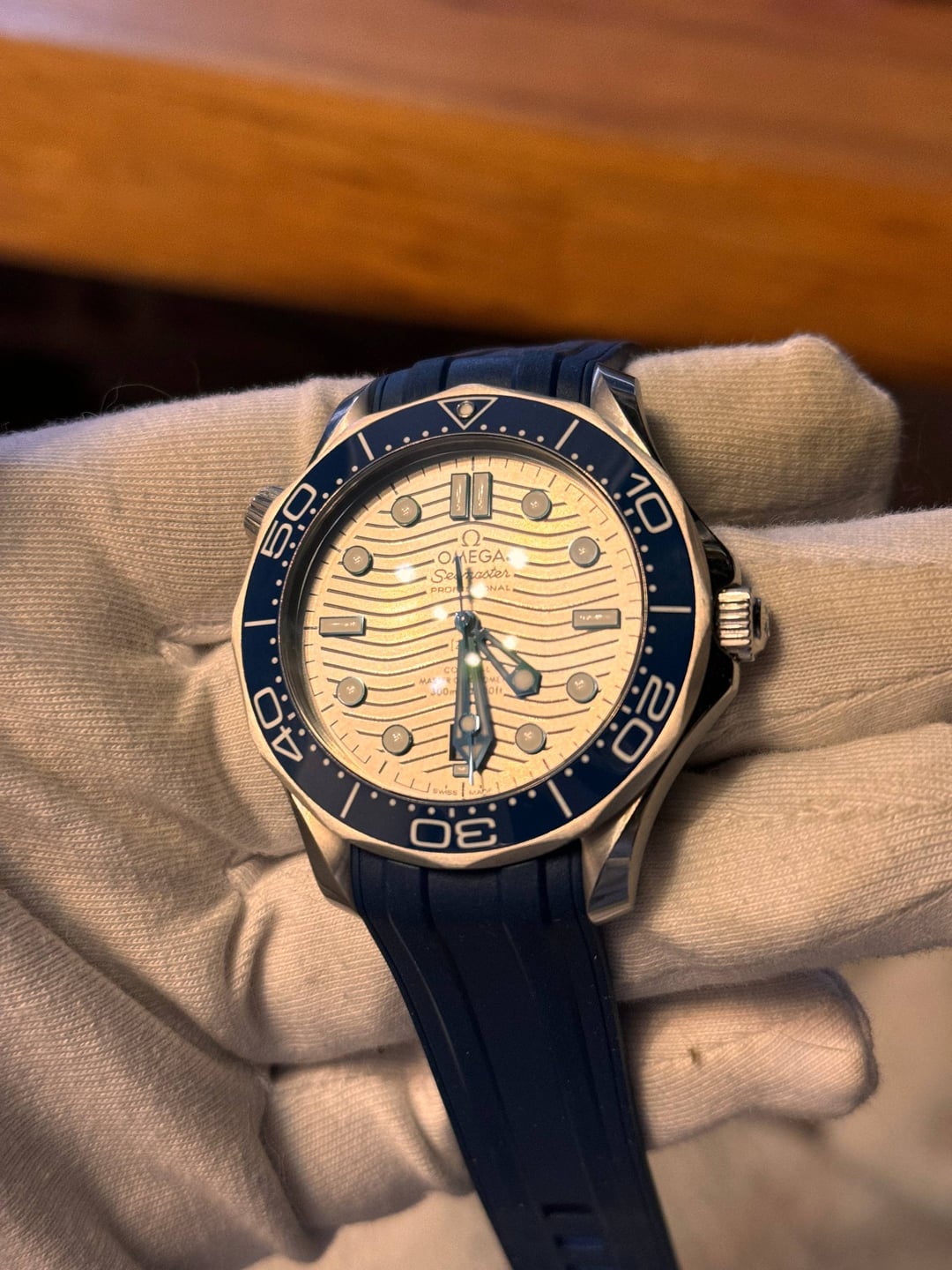 STUNNING chrome-colored ceramic dial with laser-engraved waves and a blue ceramic bezel. Luminous hands and hour markers filled with white Super-LumiNova. Full set with inner and outer boxes. Includes Pictograms card, Master Chronometer card, International Warranty card (dated 9/2024), and operating manual. Watch is in excellent pre-owned condition with only minor signs of wear. 20mm genuine Omega blue rubber strap with steel pin buckle. Self-winding mechanical, Co-Axial Master Chronometer Calibre 8800 42 mm 30.0 bar (\~300.0 metres) Timestamp: [https://imgur.com/a/BXqpTpr](https://imgur.com/a/BXqpTpr) Album: [https://imgur.com/a/XHFRmJ6](https://imgur.com/a/XHFRmJ6) Video: [https://imgur.com/a/XCThfjm](https://imgur.com/a/XCThfjm) **$3000** Payment via Wire, Trades accepted