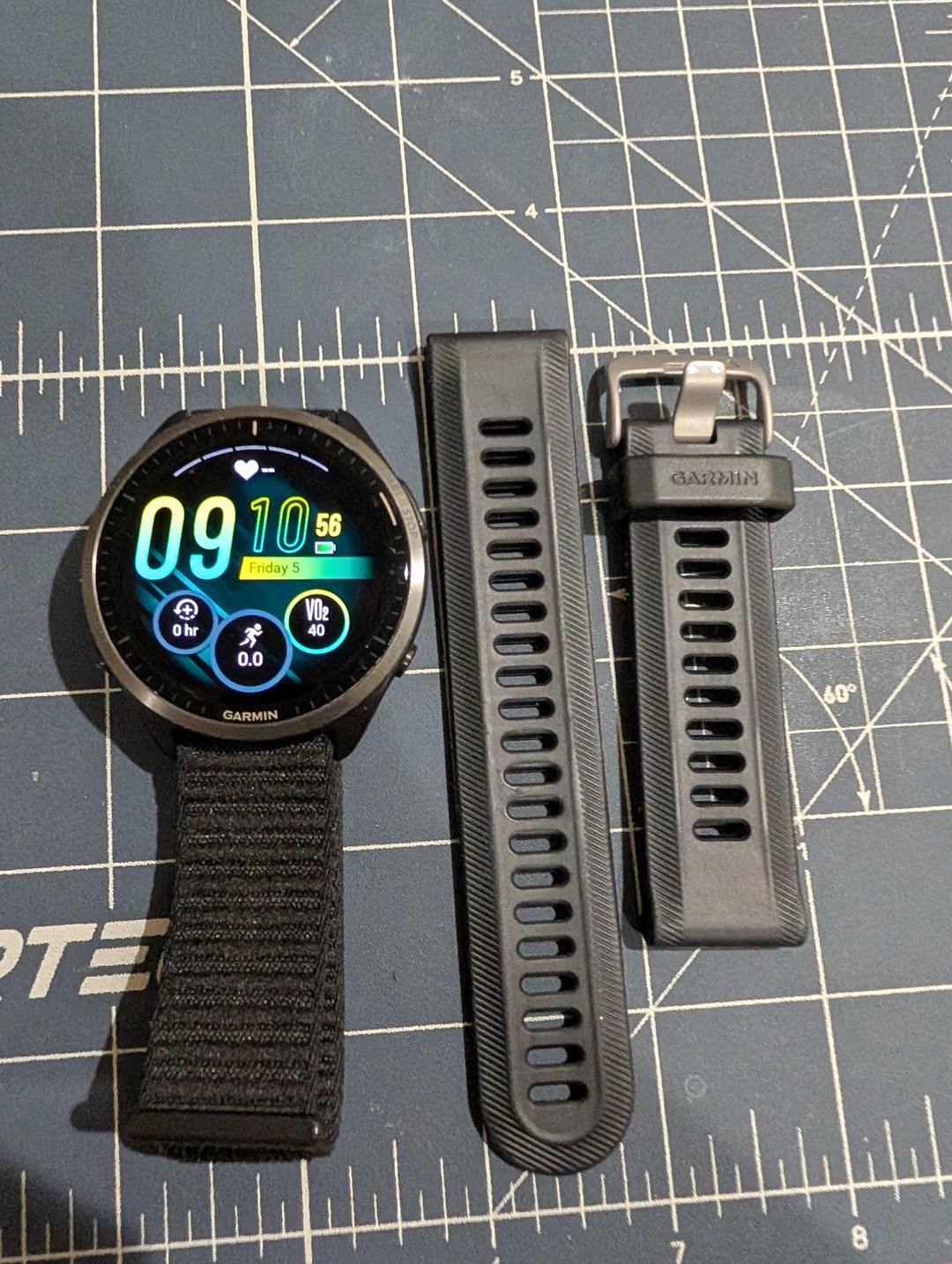 Up for sale is my Garmin Forerunner 965. This watch is in perfect working condition and is an excellent running watch but also a great all-around fitness watch. Watch comes with the original strap, a garmin charging adapter, as well as 10 nylon straps. I’ve found that these give me the best fit and are more comfortable than the rubber strap. There are some light scratches on the screen which are captured in the photo gallery below. I had to turn off the screen and angle the watch to capture them accurately as they’re very light. Full Photo Gallery: [https://imgur.com/a/forerunner-965-iATeYR0](https://imgur.com/a/forerunner-965-iATeYR0) Asking $290 shipped CONUS *Watch, straps, and charging cable only, no boxes or paperwork* Feel free to reach out with any questions! Specs: Lens Material = Corning® Gorilla® Glass 3 DX Bezel Material = titanium Dimensions = 47.2 x 47.2 x 13.2 (mm) Weight = 53 g Display Size =1.4" (35.4 mm) diameter Display resolution = 454 x 454 pixels Battery type = Lithium ion Battery life = Smartwatch mode: Up to 23 days / GPS-only mode without music: Up to 31 hours Memory/History = 32 GB