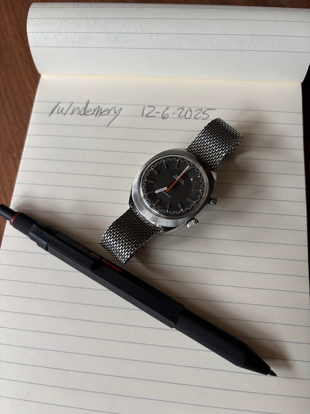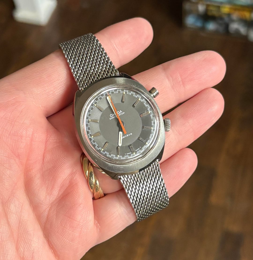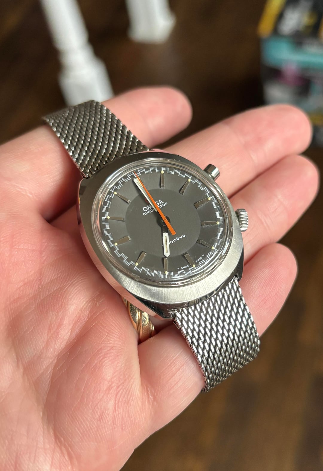 Up for sale is a beautiful example of an Omega Chronostop. The case, dial, movement, and hands are all in perfect condition. It's pretty rare to find one of these with the original radial brushed bezel. This also includes the pretty hard-to-find original mesh bracelet. **Asking $1350.** I would also be willing to work out a deal to trade for a Fuji X100VI, as that is what I'm selling this watch for.