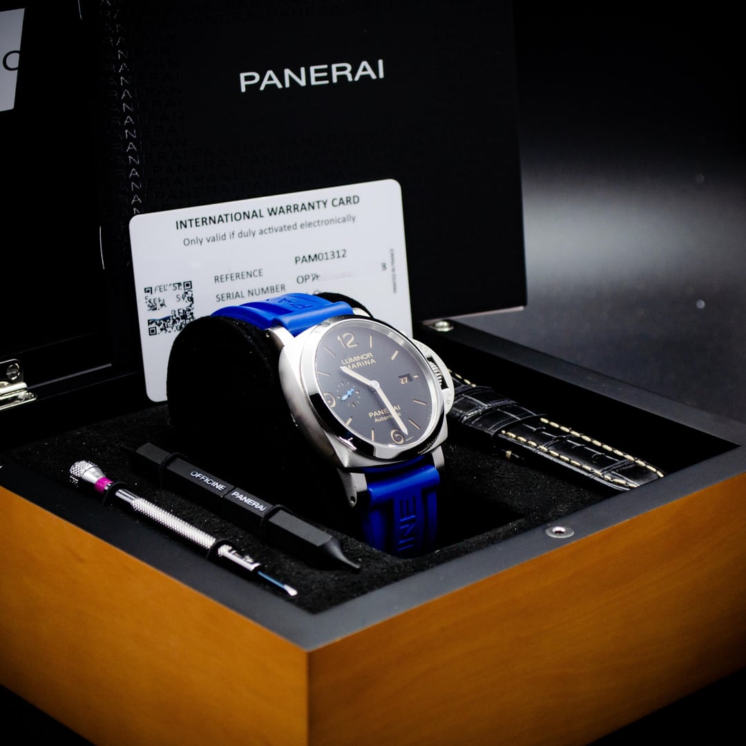 Greetings, WatchEx! Up for sale is the classic Panerai Luminor Marina (PAM01312). This is the desirable model featuring the blue small seconds hand and comes with both the alligator and rubber straps. **Key Details:** Condition: **In very good condition, rated at 9.8/10**, with minimal handling marks. See detailed photos for full transparency. Included: Box, warranty card (dated 2019, coverage until 2027), tools, booklet, **Black Alligator strap, and Blue Rubber strap.** Reference: PAM01312 Case Size: 44mm Stainless Steel Movement: In-house P.9010 (3-Day PR) Asking: **$5090** Trades: **TRADES WELCOME** Dealer: CastleWatchSupply All pics -> [**https://drive.google.com/drive/folders/1fjP00oZvKBLZOfw5PmS5wzQwJlyGwJ1N?usp=drive\_link**](https://drive.google.com/drive/folders/1fjP00oZvKBLZOfw5PmS5wzQwJlyGwJ1N?usp=drive_link) Timestamp -> [**https://drive.google.com/drive/folders/1-bDix4TafPiXLcpRkGRMP7pILecr\_rrx?usp=drive\_link**](https://drive.google.com/drive/folders/1-bDix4TafPiXLcpRkGRMP7pILecr_rrx?usp=drive_link) Located in Dallas TX