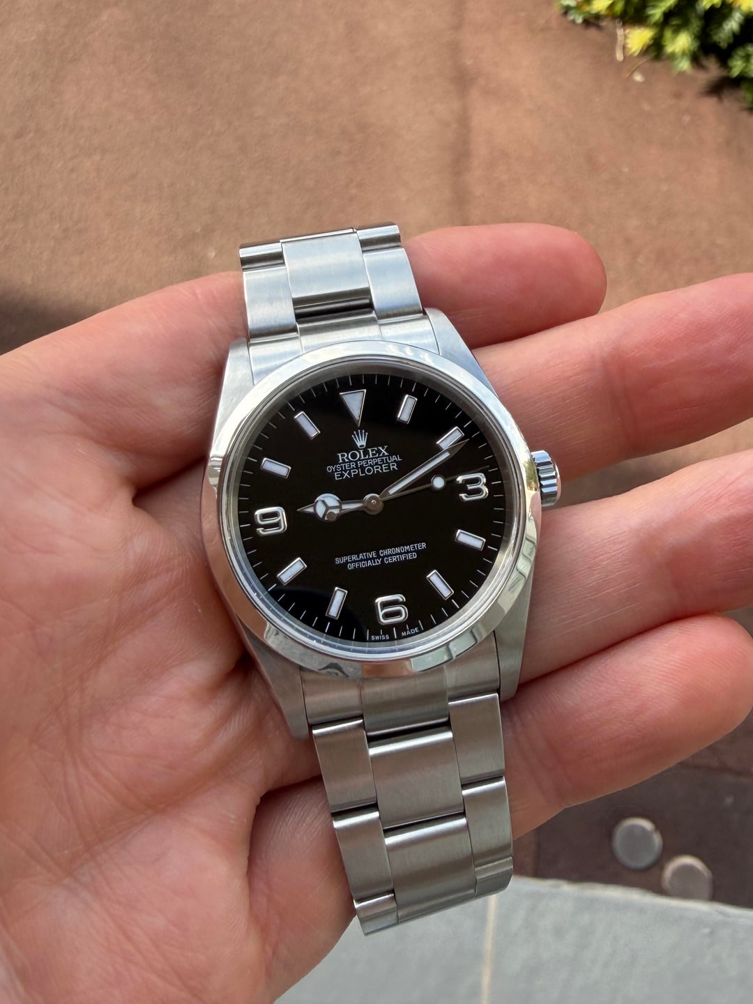 Up for grabs to today is this very nice **Rolex Explorer** (ref. 114270), which comes with box and papers from 2004. To me, the 36mm Explorer is the perfect version of this watch, with the classic design sitting elegantly on the wrist. The proportions are perfect, and the watch can be dressed down for a Sporty look, or dressed up with formal attire. This example comes as a full set with the inner + outer box, papers, original hang tag with matching serial and booklets. The watch is in excellent condition (scratch free crystal, case, clasp). The watch was serviced approx. 12 months ago. **Price: $6,199.** I have been a trusted seller on Reddit since 2018, and can provide references from 700+ prior successful watch transactions. If you have any questions or would like to see a video, just let me know. Thanks!