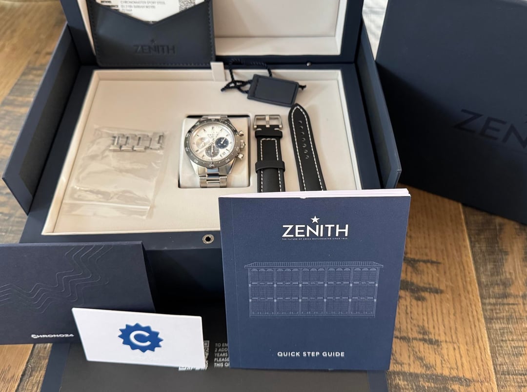 Up for sale is my Zenith Chronomaster Sport (white dial). This is a complete full set, and also comes with a black sailcloth strap from Artem ($100 value). It was acquired through Chrono24 earlier this year, and went through their authentication process - authentication card will be included here. The watch is in great shape, with only honest wear showing on the bracelet/clasp. Dial is pristine, and case/lugs seem perfect to me with minor barely visible hairlines at most. Warranty is good through October of 2028. Keeping great time, and chronos work flawlessly. Happy to do a FaceTime to show watch/functions if you would like. **Price**: $6900 + shipping (PP F&F and CONUS only)