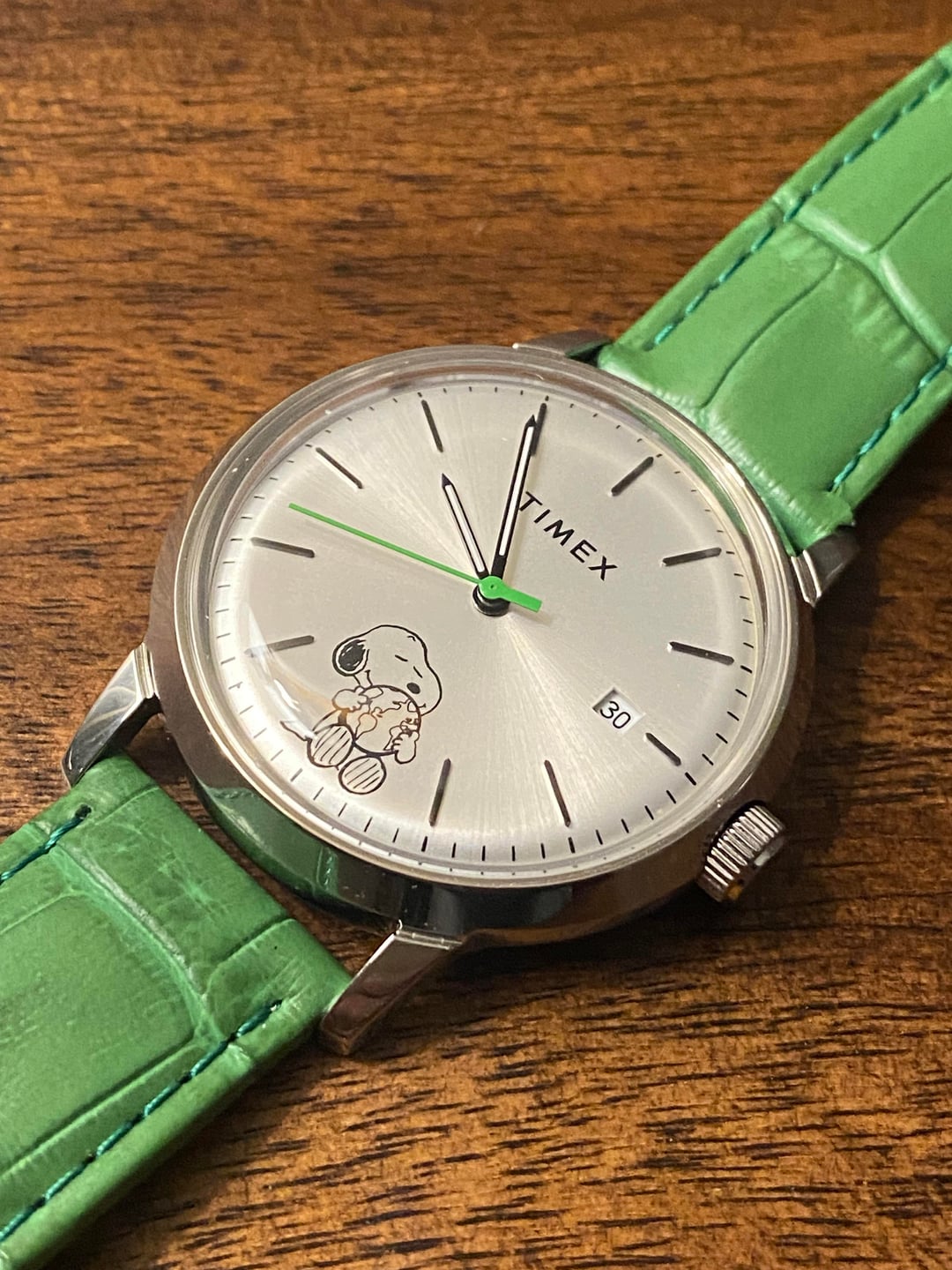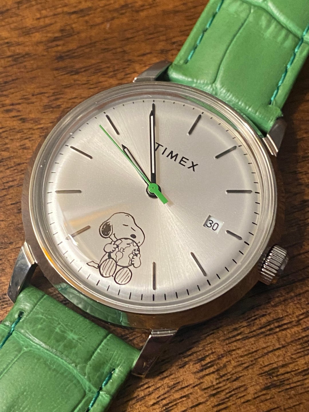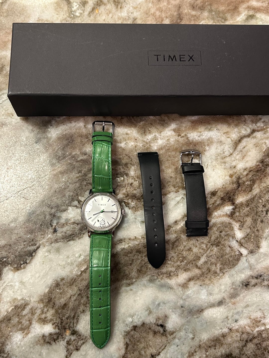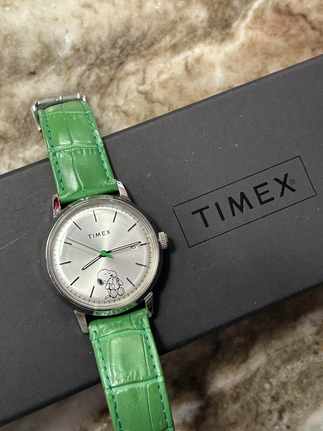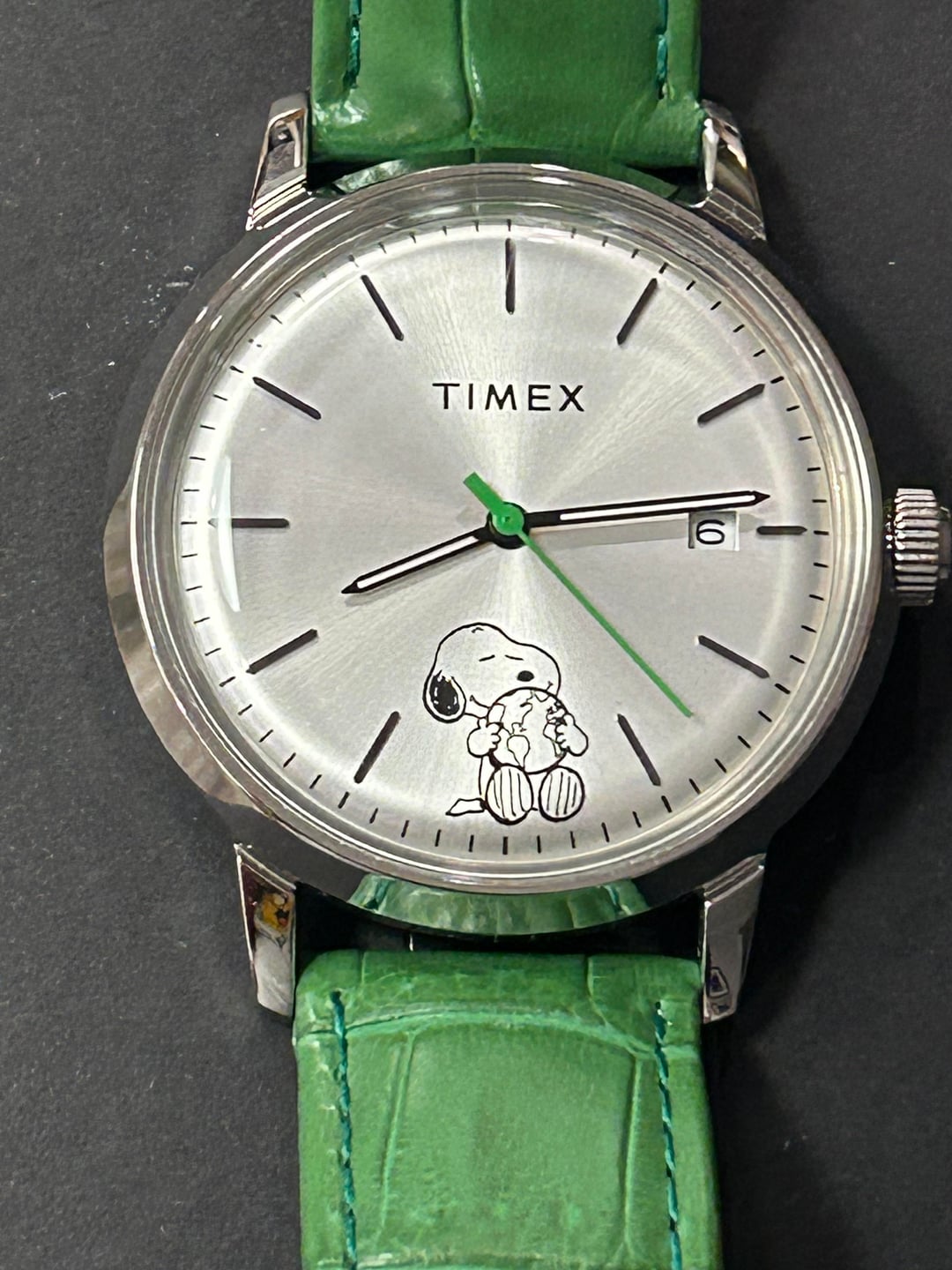 Hello all—here’s a very lightly worn Timex x Peanuts “Take Care” Marlin watch, with Snoopy right on the dial and a really cool green hand with an aftermarket green strap to match. This is a 40mm automatic watch that runs smoothly and has 50m of water resistance. Timex released these a few years ago and it just hasn’t been getting the wrist time it deserves. $185 shipped CONUS. Thanks!