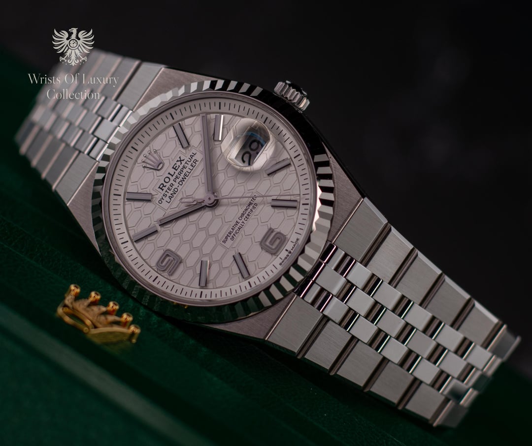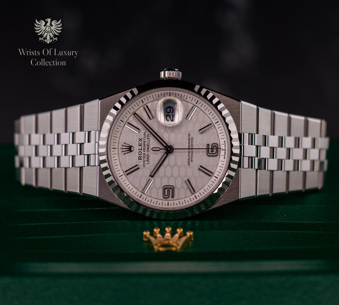 Available today from The Wrists Of Luxury Collection, is one of the most polarizing releases by Rolex, or any watch maker in 2025, the Land Dweller. A whole new model from Rolex, while also bringing back a discontinued style bracelet with the hidden clasp "super jubilee" everyone loved, and also introducing a ground breaking new movement, the Land Dweller is quite a package! Although modern and cutting edge, the Land Dweller is also paying homage to the styling of the Oyster, Oysterquartz, and the Datejust from the late 60s, and 70s. The new high tech Rolex Cal 7135 movement introduces many firsts in watchmaking, solidifying Rolex as one of the front runners in horological ingenuity. As all of the fluted dial models, this one continues the tradition with the white gold fluted bezel. Reference #: 127234 Model: Land Dweller 36 Case Size: 36mm Year: 2025 Movement: Rolex Cal 7135 self winding Water Resistance: 100m Power Reserve: 66hrs Scope of Delivery: double boxed, outer sleeve, watch, manuals, warranty card, green hang tag, card holder This watch is unworn, but does have some faint handling marks. Was sized at AD, and links have since been added back. Keep in mind everything appears exaggerated with the high power photography we use. This piece will look and feel new on the wrist. Available for $25,495 including overnight fully insured shipping to your local FedEx location! Wire/CC +3% Local pickup in SWFL Wrists Of Luxury is independent from any watch brand, only providing pieces from it's collection and is in no way endorsed by any manufacturer. All pieces listed are ours, and are as described or better. We have many references across many platforms, with tons of successful transactions. Please don't hesitate to reach out with any questions or concerns! Happy to help.
