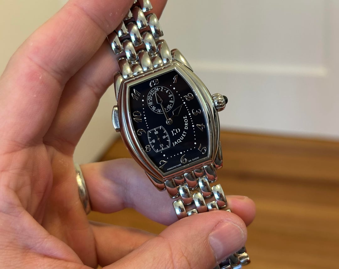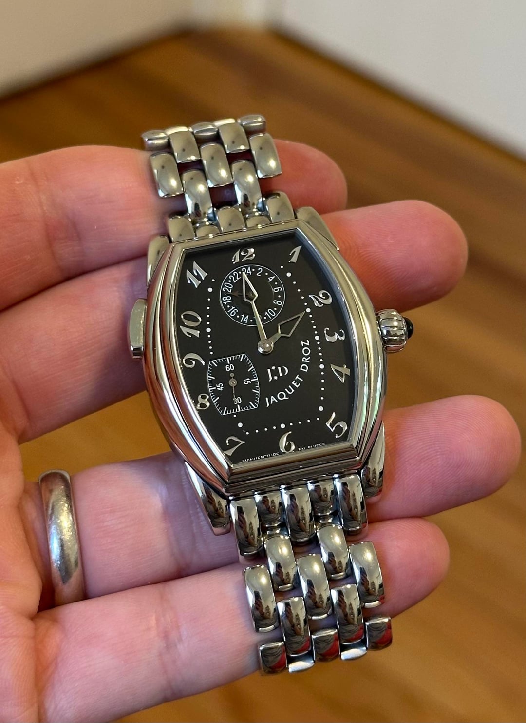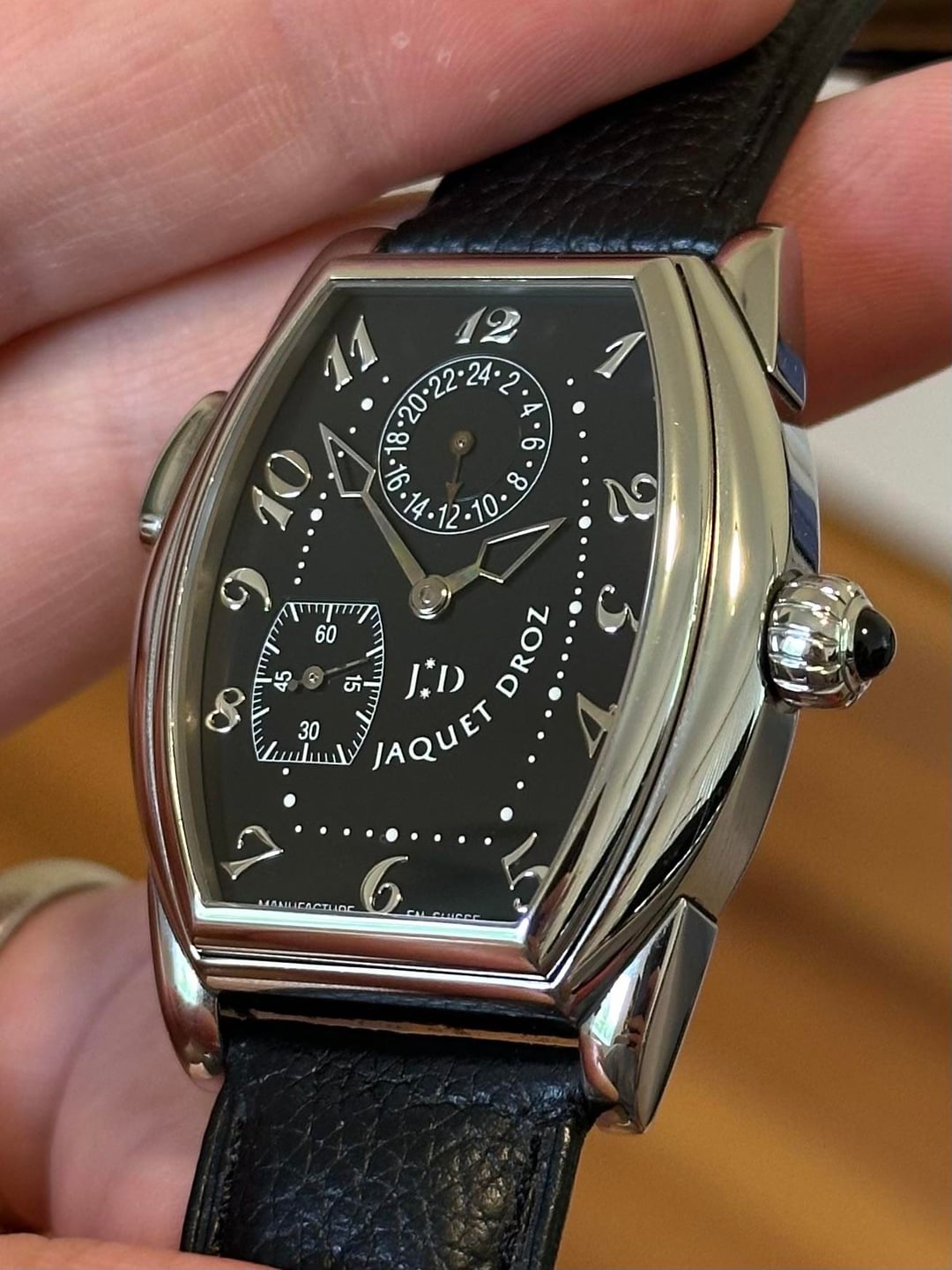 Up for sale is a Jaquet Droz Tonneau GMT, reference 5195 JS. Jaquet Droz is a Swiss watch brand tracing its heritage to a watchmaker by the same name in the 18th century. Alongside Omega, Blancpain, and Breguet, Swatch group revitalized Jaquet Droz in the 2000s and started releasing new watch designs under a characteristic style. This is one of those watches. The watch dial measures approximately 35mm x 38mm. It features an art deco stainless steel stepped case, somewhat reminiscent in shape to the Cartier Roadster. The dial layout, execution, and breguet numbers on this watch are one of my favorite aspects. The dial has a lot of aspects to it and is certainly not "minimalist," but it has a very nice balance. The black dial, white paint, and stainless steel numbers all work very well together. The watch has a shaped crystal that gives an interesting effect to the watch at different angles. The watch comes on a nice stainless steel Jaquet Droz bracelet with a butterfly clasp. The clasp of the bracelet has a few small hairlines. The watch has a push-button GMT feature that is contained in one of the subdials. The movement is a Jaquet 736 movement, which is manual wind and finished to a very high degree. Overall, the finishing throughout this entire watch is nicely done. The movement is visible through a partially see-through case back. The caseback has some scratches, but otherwise the watch is in good shape. **Price:** $2,500 **Timestamp:** in photos **Videos:** I can send a video of the watch through my instagram, @WarmDials **Payment and Shipping:** to be agreed upon by the buyer and myself, taking the buyer's purchase history into consideration. I'm located in the United States and frequent user in this community. I have bought and sold often, and I'm happy to answer any questions you may have / provide more photos or a video. You can find me on instagram at @WarmDials. Don't hesitate to reach out if you have any questions or want to chat