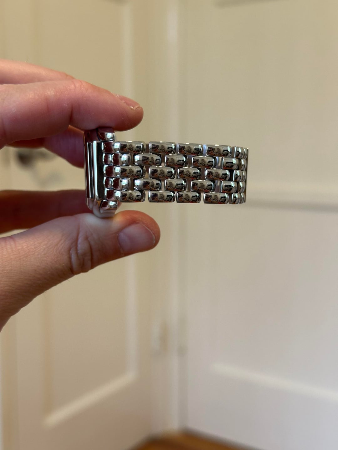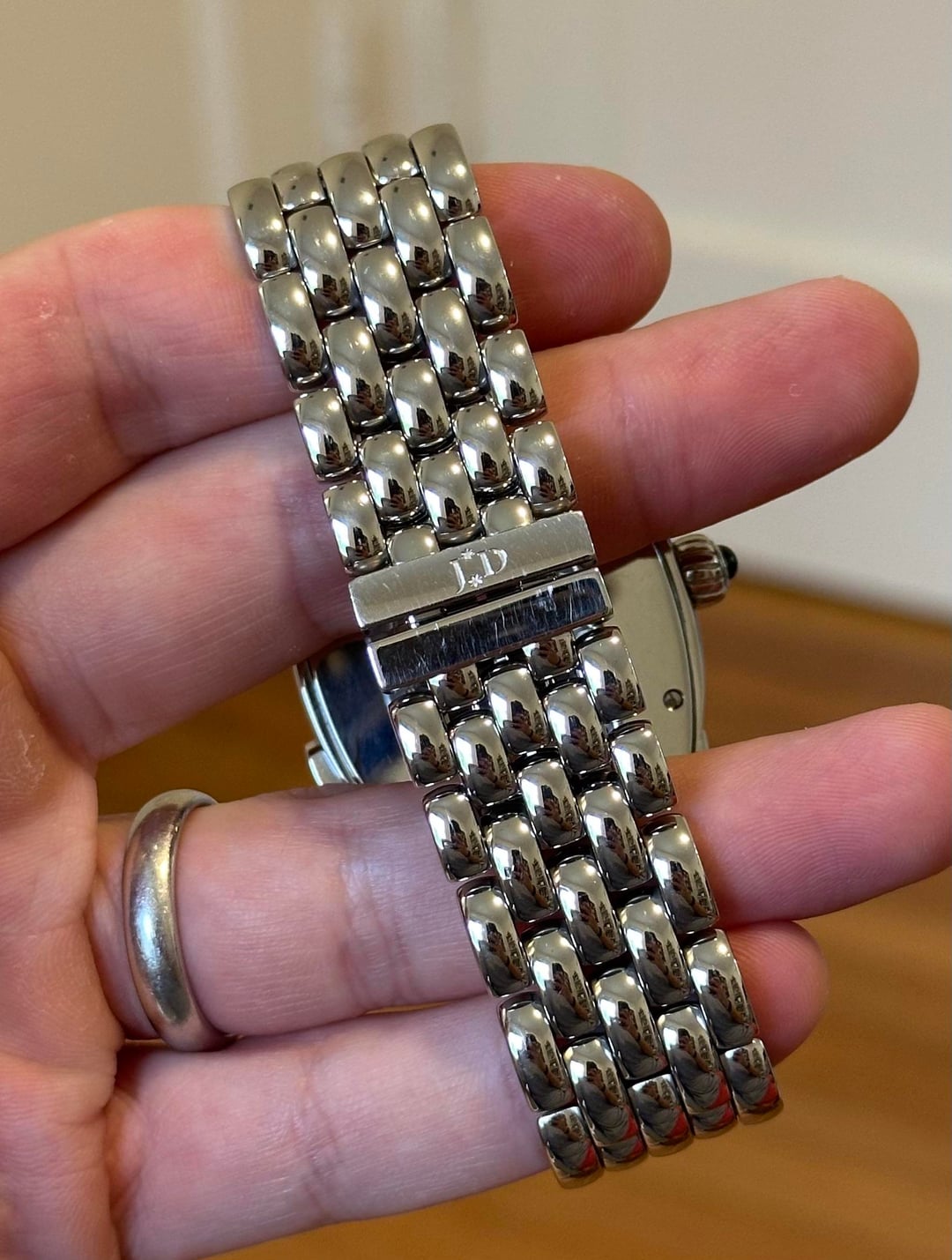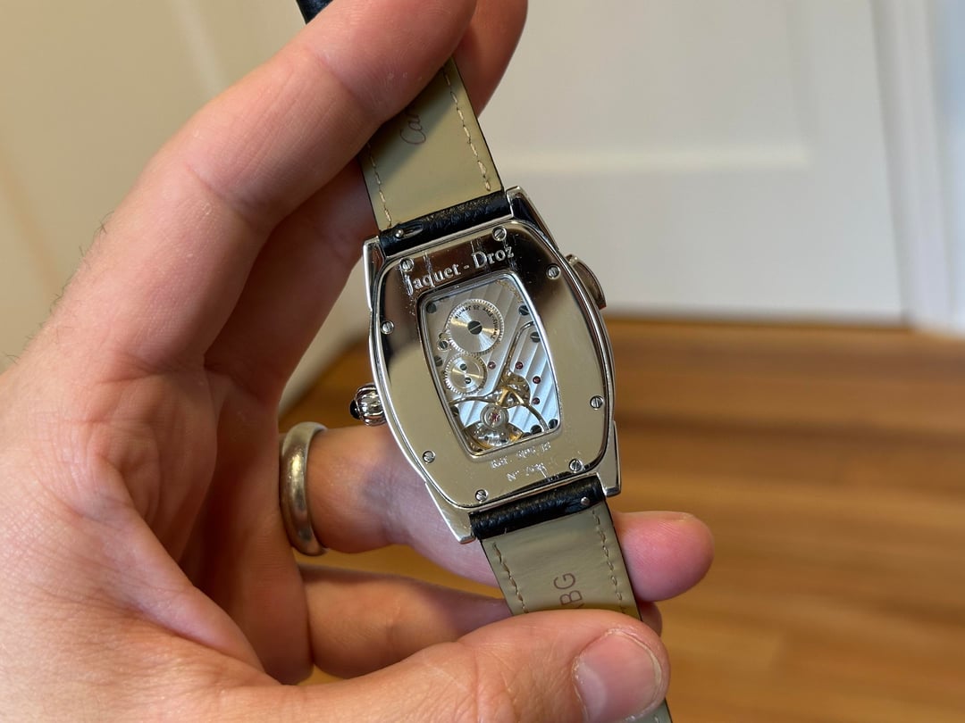Up for sale is a Jaquet Droz Tonneau GMT, reference 5195 JS. Jaquet Droz is a Swiss watch brand tracing its heritage to a watchmaker by the same name in the 18th century. Alongside Omega, Blancpain, and Breguet, Swatch group revitalized Jaquet Droz in the 2000s and started releasing new watch designs under a characteristic style. This is one of those watches. The watch dial measures approximately 35mm x 38mm. It features an art deco stainless steel stepped case, somewhat reminiscent in shape to the Cartier Roadster. The dial layout, execution, and breguet numbers on this watch are one of my favorite aspects. The dial has a lot of aspects to it and is certainly not "minimalist," but it has a very nice balance. The black dial, white paint, and stainless steel numbers all work very well together. The watch has a shaped crystal that gives an interesting effect to the watch at different angles. The watch comes on a nice stainless steel Jaquet Droz bracelet with a butterfly clasp. The clasp of the bracelet has a few small hairlines. The watch has a push-button GMT feature that is contained in one of the subdials. The movement is a Jaquet 736 movement, which is manual wind and finished to a very high degree. Overall, the finishing throughout this entire watch is nicely done. The movement is visible through a partially see-through case back. The caseback has some scratches, but otherwise the watch is in good shape. **Price:** $2,500 **Timestamp:** in photos **Videos:** I can send a video of the watch through my instagram, @WarmDials **Payment and Shipping:** to be agreed upon by the buyer and myself, taking the buyer's purchase history into consideration. I'm located in the United States and frequent user in this community. I have bought and sold often, and I'm happy to answer any questions you may have / provide more photos or a video. You can find me on instagram at @WarmDials. Don't hesitate to reach out if you have any questions or want to chat