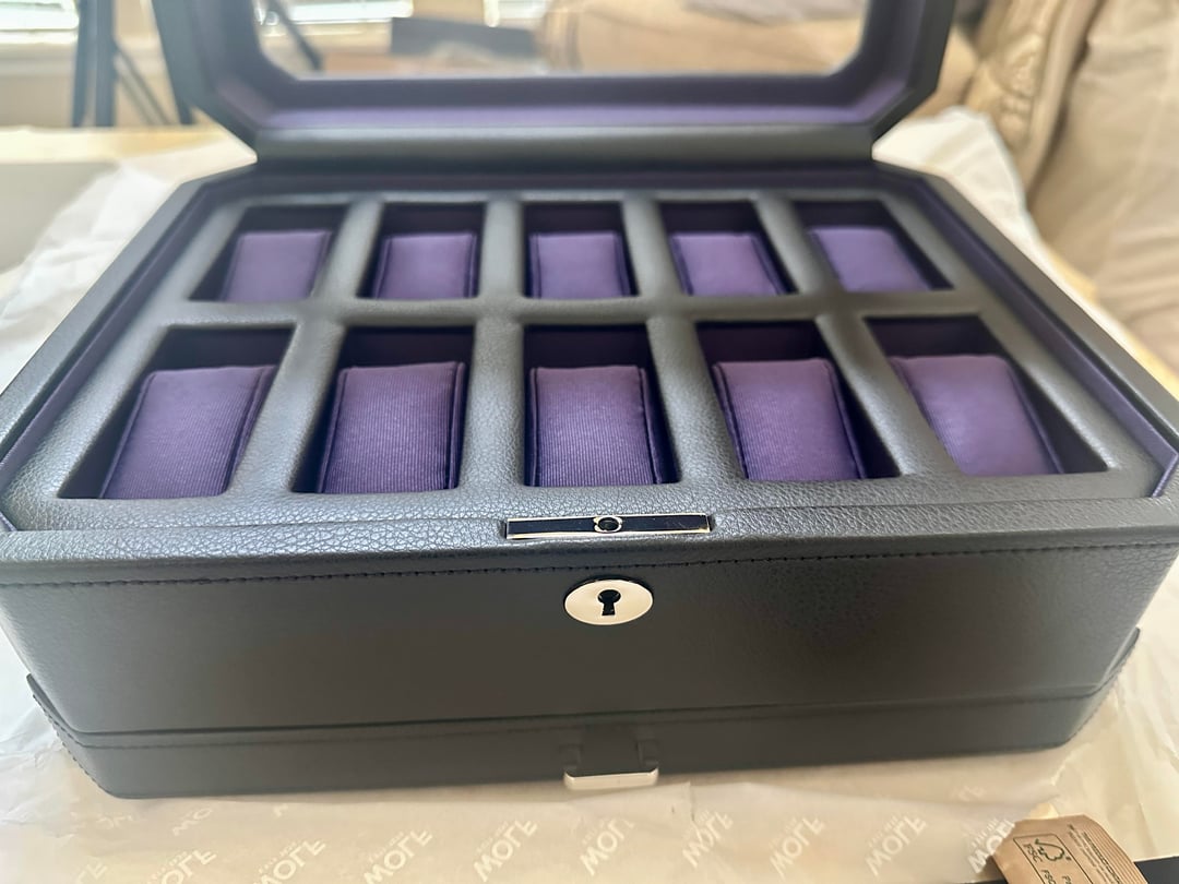 WOLF Windsor 10 pc boxes with drawer. Features chrome finished hardware, locking glass cover, smooth vegan leather and 10 pc watch and jewelry storage. Color - Black/Purple Condition - Brand New, with original packaging $165 each, shipped CONUS Zelle (preferred), PayPal FF