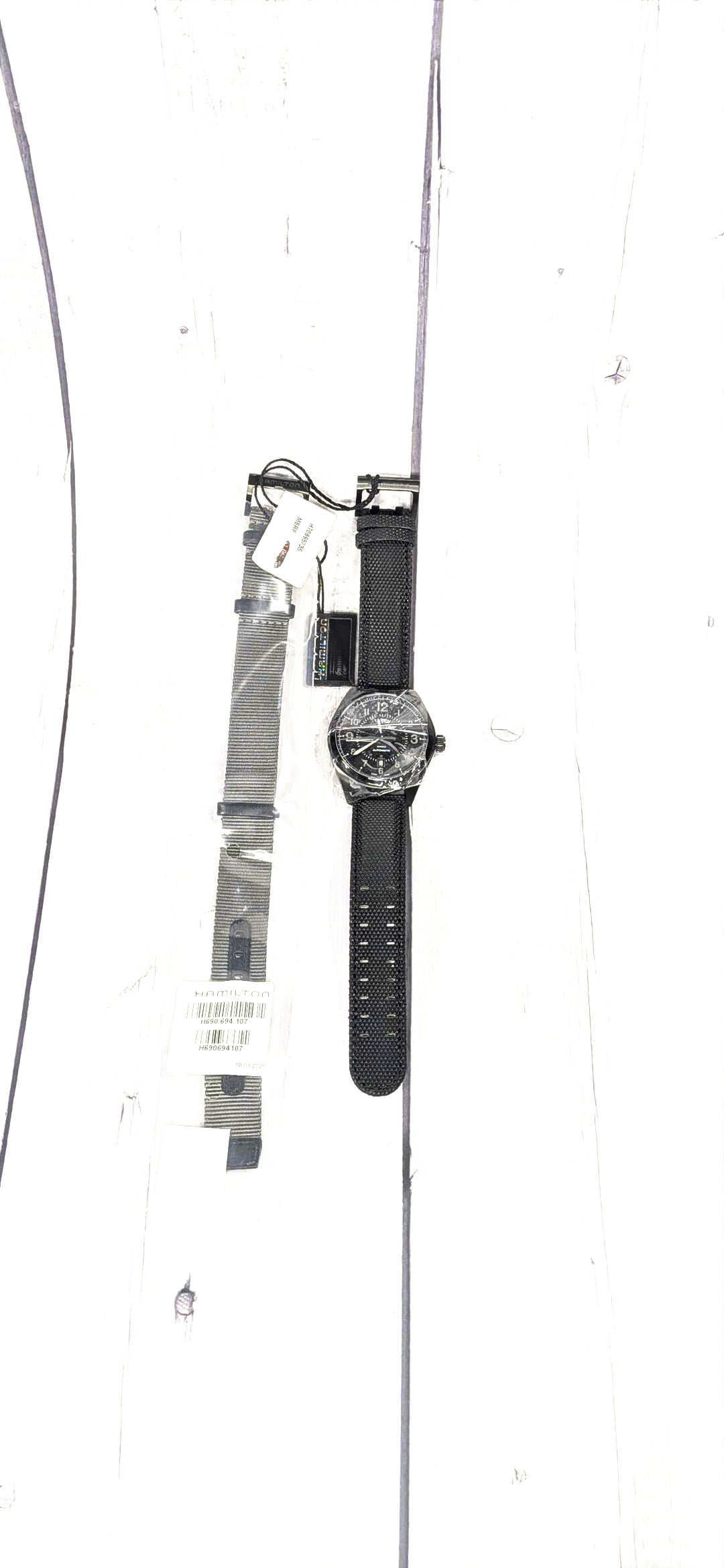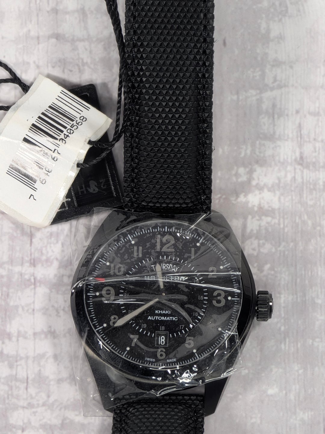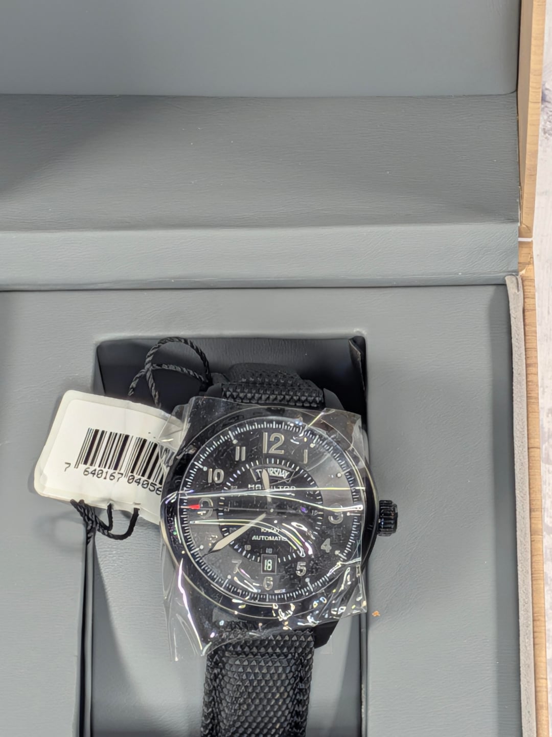 |Rare Hamilton Khaki Field Day Date Auto (Ref. H70695735), known as the "Stealth" model for its black PVD-coated case and tactical aesthetic. This timepiece is in Unworn/Mint condition. It retains its original factory stickers, ensuring the black PVD coating is flawless.BONUS: An authentic Hamilton Grey Nylon/Textile Strap is included. This lighter strap provides a fantastic contrast against the black case, creating a more casual, urban look. Lowering price to $850, shipping not included, only CONUS| |:-|