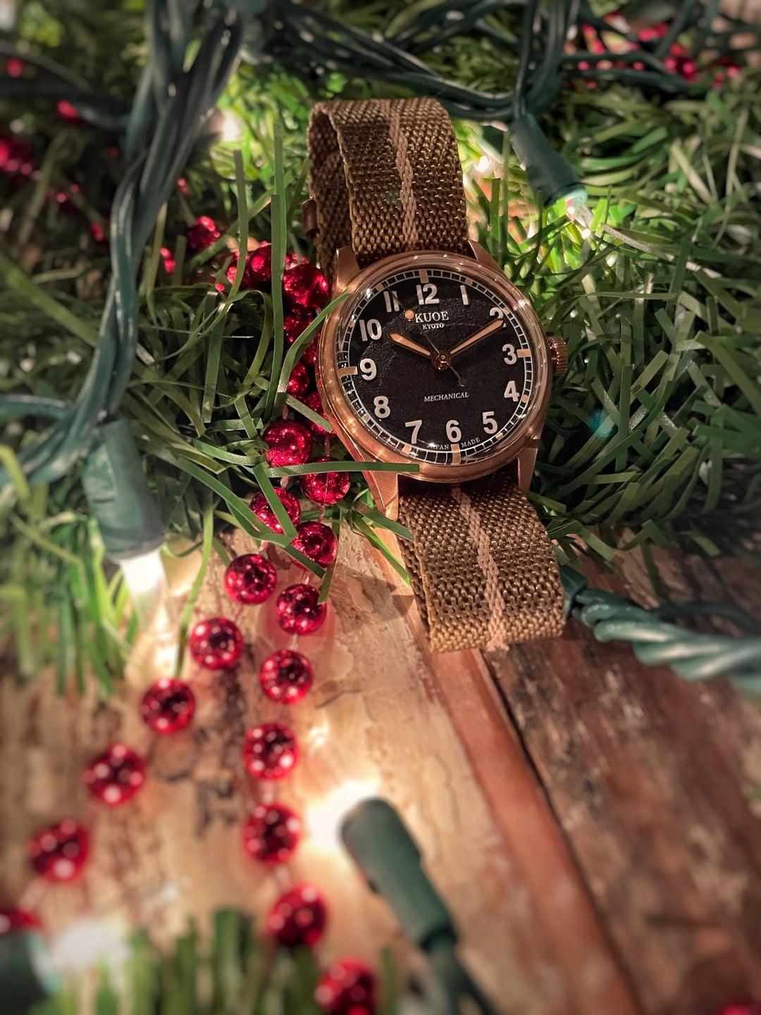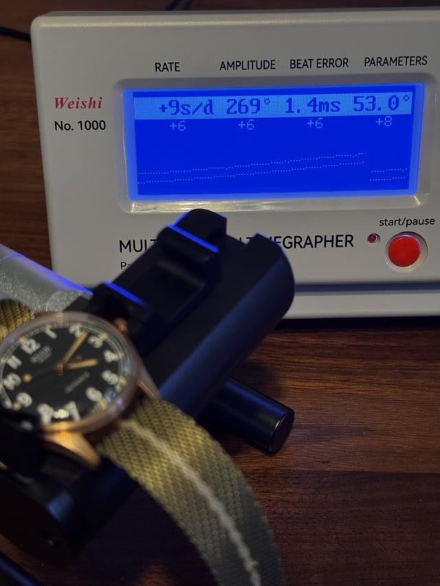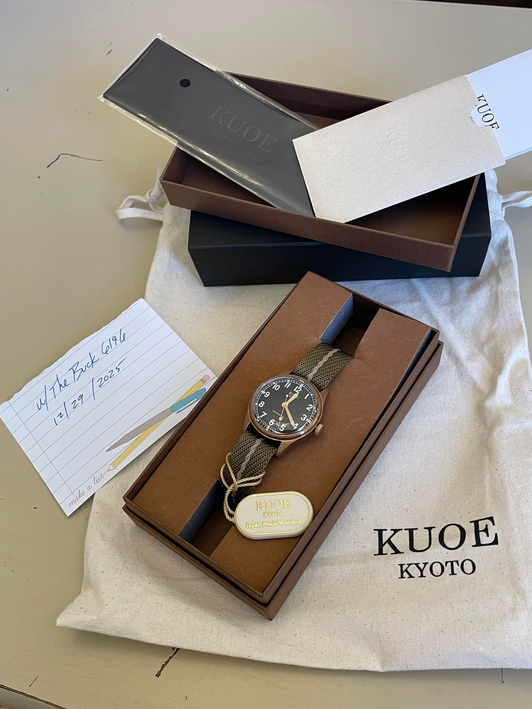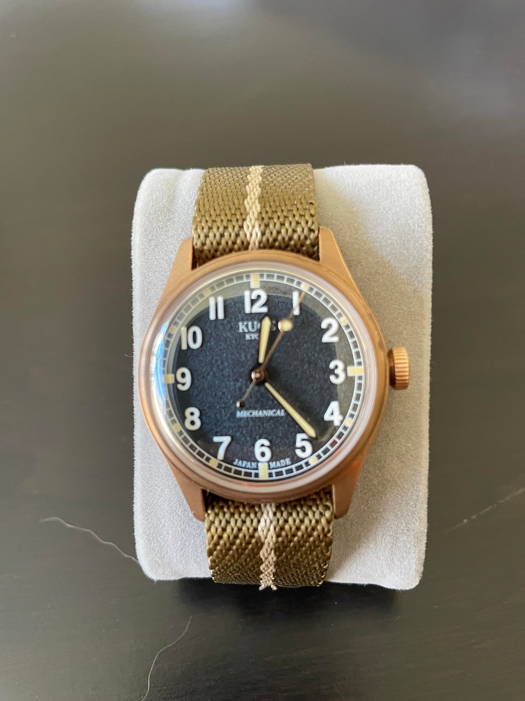 Kuoe Old Smith 90-002. Like new - only in my collection for a couple of months and worn a few times. Patina is still very light. Includes original nato strap plus additional black/khaki strap. Also has box, papers, and hang tag. Previous owner provided timegrapher pic which shows everything is working correctly. $450 plus $20 for insured shipping in CONUS Payment by PayPal (buyer pays fees if G&S), Zelle * Case Size: 35x35x12mm * Lug-to-Lug: 42mm * Band Width: 18mm * Automatic with hand-wound and hacking * TMI Japanese Movement, Cal. NH38 * Glass: Dome-shaped Sapphire Glass with AR and AF coating * Case: CuSn8 Bronze * Hands and Buckle: PVD coating * Case-back: SUS 316L * Screw-Down Crown * Water Resistant: 10 BAR * Power Reserve: ~41 hours Kuoe listing https://www.kuoe-en.com/product-page/old-smith-90-002-bronze-case-black-dial-no-date