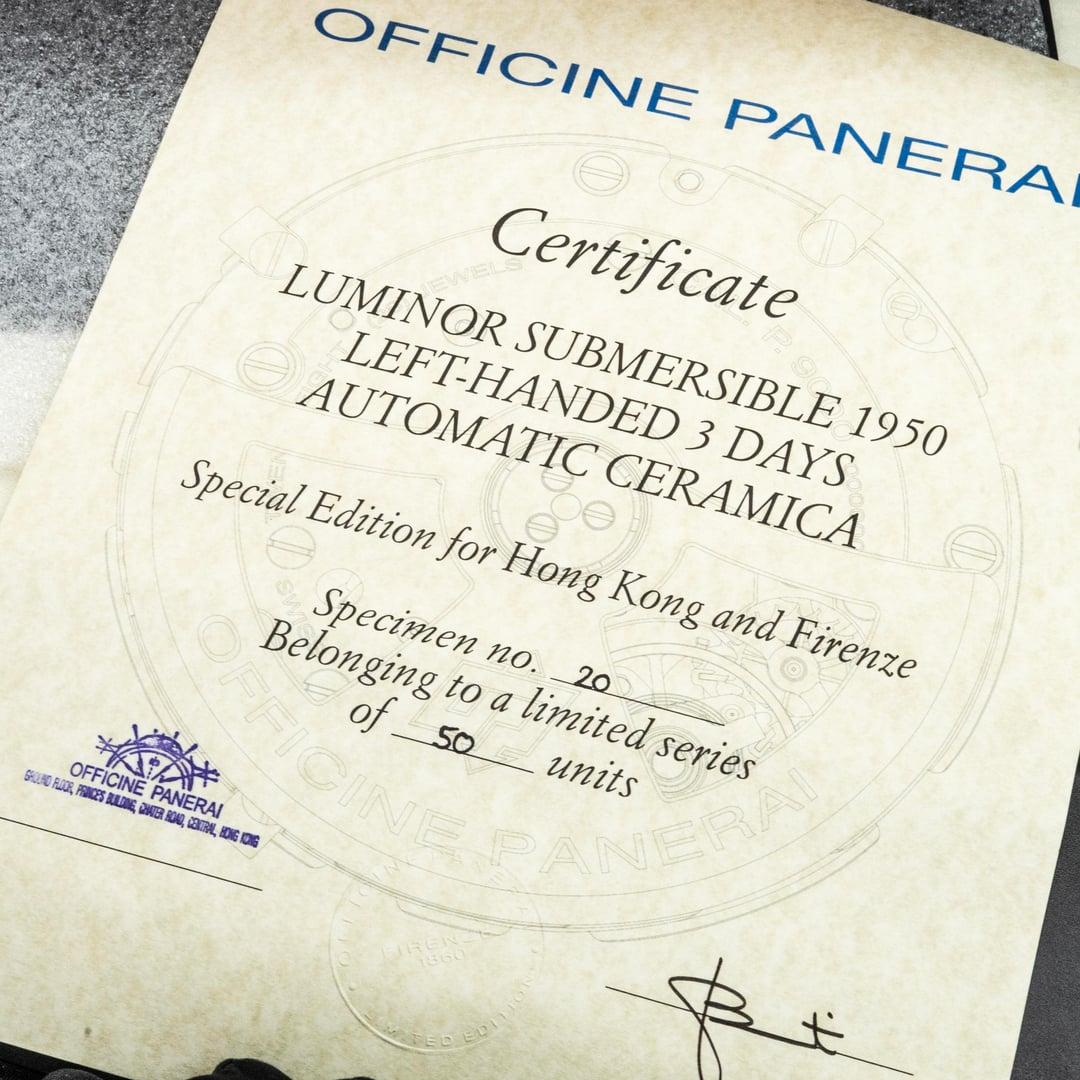 [https://www.dropbox.com/scl/fo/nz62otbn6tx9mnqgh70nf/AAHC7MwC9RzTKm-iG8AZUSI?rlkey=6k7ttdt134vwrnneoavvlaczf&st=tbbreqyl&dl=0](https://www.dropbox.com/scl/fo/nz62otbn6tx9mnqgh70nf/AAHC7MwC9RzTKm-iG8AZUSI?rlkey=6k7ttdt134vwrnneoavvlaczf&st=tbbreqyl&dl=0) **PAM00607 LUMINOR SUBMERSIBLE 1950 LEFT-HANDED 3 DAYS AUTOMATIC CERAMICA BLACK - 47MM - BOX AND PAPERS** **.** The PAM 607 is the significantly rarer brother to the beloved PAM 508. Only 50 of this model were ever made as part of a 2014 release for Hong Kong and Firenze boutiques only; and are EXTREMELY rare to find on the open market. **.** * **Reference: PAM 00607 | PAM 607** * **47mm black ceramic case** * **Calibre P.9000, automatic movement, 72 hour power reserve** **.** ***Contents*****:** Watch, Special Edition box set, 2014 warranty papers, serialized scroll, and OEM strap on pin buckle. ***One year service warranty included at no charge via Bo Knows Luxury, LLC; beginning on date of purchase.*** . **Condition:** Mint condition with faint handling marks from shipping and photography. The photos in this album were taken using a macro setup to ensure an accurate representation of the watch's condition. This timepiece has been professionally pressure-tested and thoroughly validated to confirm all functions operate within factory specifications. . ***Price: $17,625.*** *Fully insured overnight shipping included in the US. Payment accepted via:* * *Bank Wire* * *Zelle* * *All major credit cards* . Please message me directly to confirm availability before marking sold! USAF veteran owned company with hundreds of successful deals done, and plenty of references available to any interested buyers. Thanks for looking! 🙏