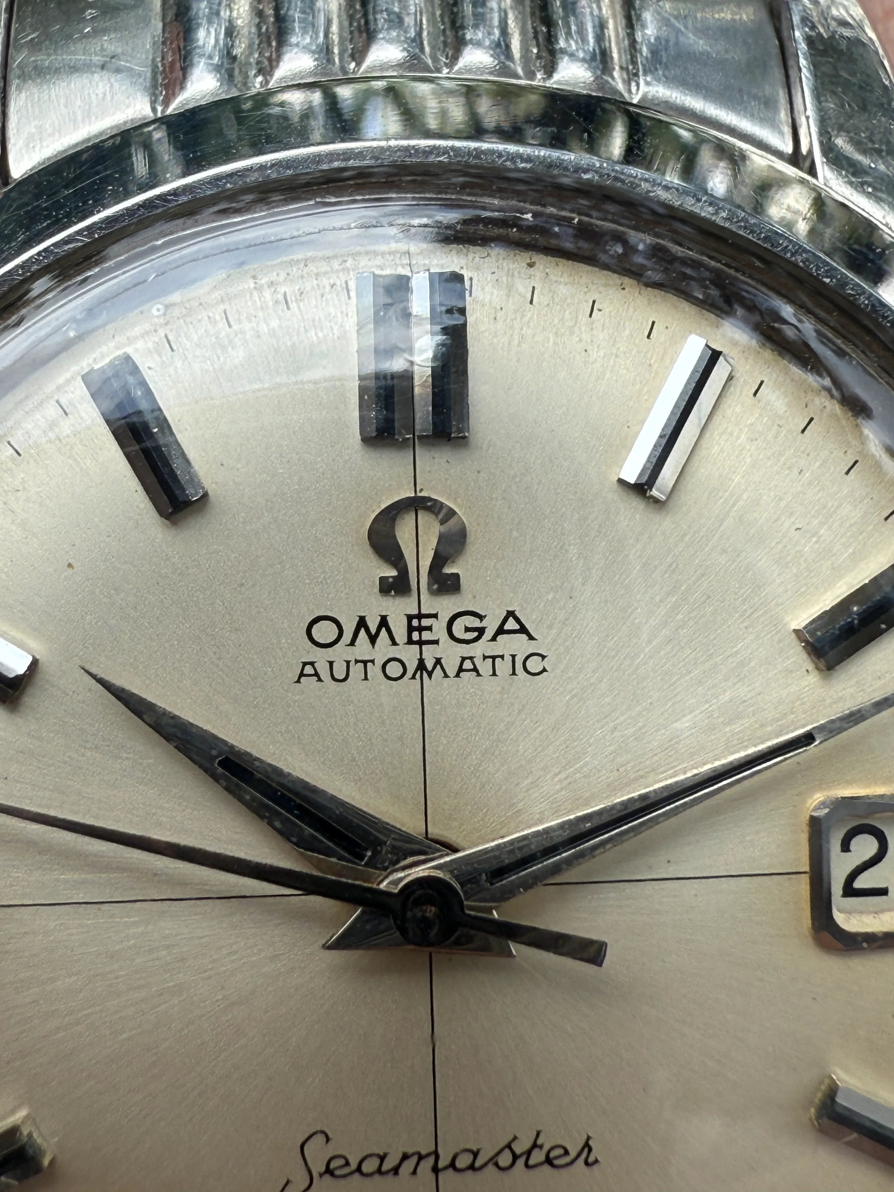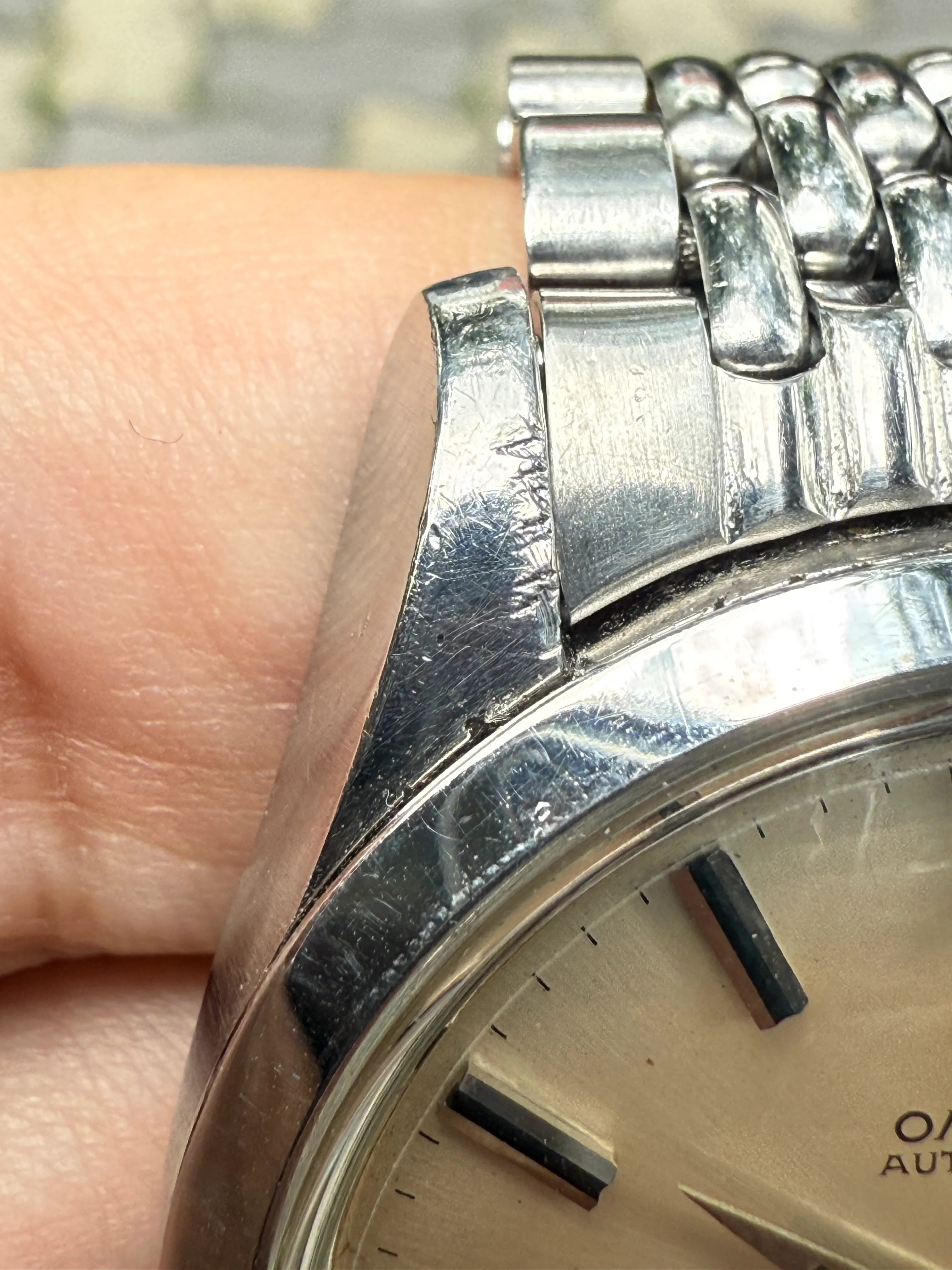 - Case: The diameter is 35mm without the crown. Original case is in fair condition, has scratches all over; some visible scratches/chips on the upper left lug. Original Omega scallop crown.
