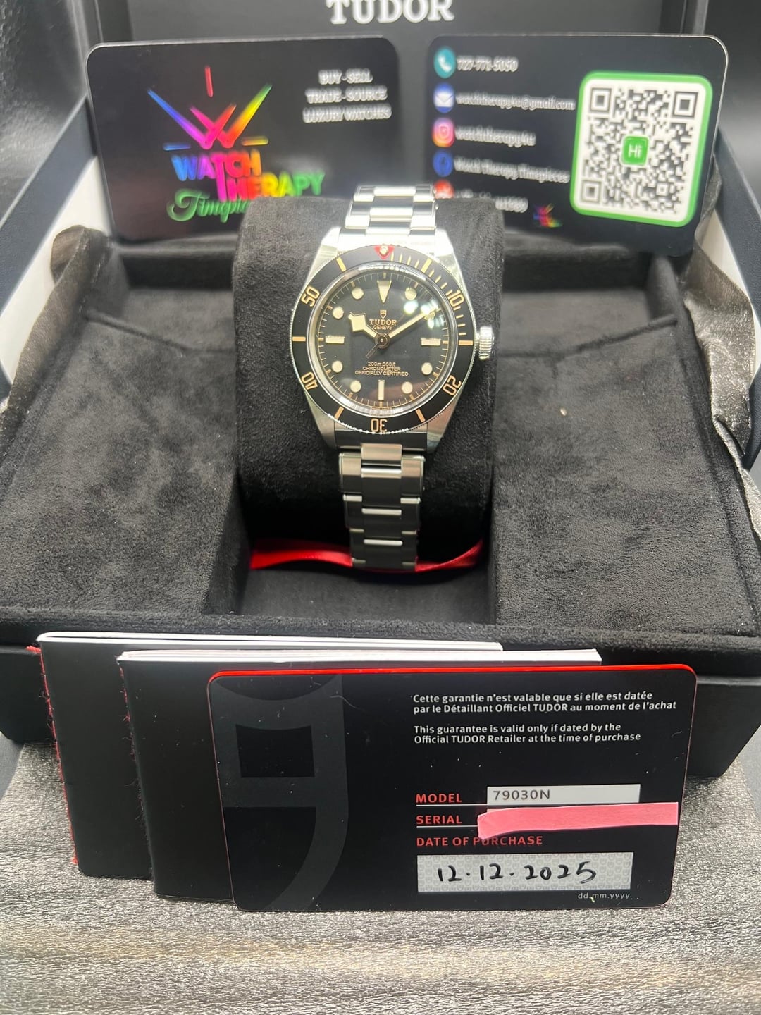 **F/S: New Tudor Black Bay 58 Black 12/25 Ref# 79030N** **Shipping from Florida!** **Mods-different watch than the one previously reserved, TY** **Specs:** \* Beautiful black domed dial \* Automatic self-winding \* 39mm \* SS Riveted Bracelet \* 200M Water Resistance \* 70-hour power reserve \* MT5602 (COSC) movement **Includes**: Warranty card 12/25, double boxed, booklets and tag. **Condition:** 10/10 Unworn **Price: $3450.00 + Insured shipping to your local FedEx for pick-up in Con US**. I am also open to a face-to-face public transaction in or around the Tampa Florida Region, within reason. I have many strong and viable references within Reddit and from Buy/Sell/Trade Watch Facebook groups. Always willing to jump on a call or meeting link to show you the watch. Thank you and please reach out if you have any questions or concerns. Florida residents may be subject to sales tax w/o a valid reseller cert. ***No Trades, TY*** **Location**: Tampa Florida **Payment:** Zelle or Wire Timestamp: [https://imgur.com/a/F06eiwR](https://imgur.com/a/F06eiwR) FB: Watch Therapy Timepieces IG: [@watchtherapy4u](https://www.reddit.com/u/watchtherapy4u/)