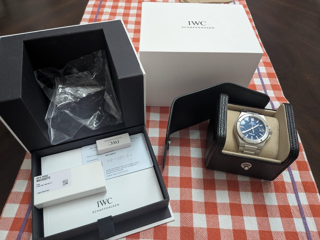 Up for sale is my IWC Ingenieur with Blue dial. The watch is dated 8/3/25. Comes with box, papers, micro adjust clasp, original butterfly clasp AND two extra links! The watch itself is in amazing condition, only minor desk diving scratches on the micro adjust clasp and on a couple of the links where the micro adjust interacts with the bracelet. The watch is fitted with the micro adjust clasp (which costs $460 from IWC), with the original butterfly clasp included in the box. I have also attached the 2 extra links to the butterfly clasp. This watch has been a true joy to own, but unfortunately I must let it go to a new home. Specs: 40mm,100 meter water resistance, 120 hour power reserve. Location: USA/California Price: $9500 (includes shipping to US). Payment methods accepted PayPal, Cashapp, Venmo and Zelle. I will ship within 24 hours of receiving payment via FedEx along with forwarding you the tracking information. Not looking for a trade this time.