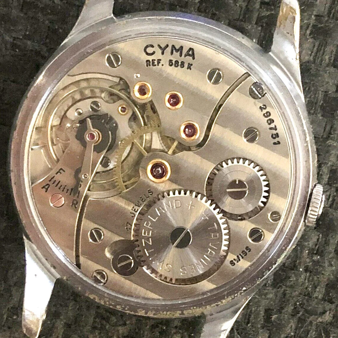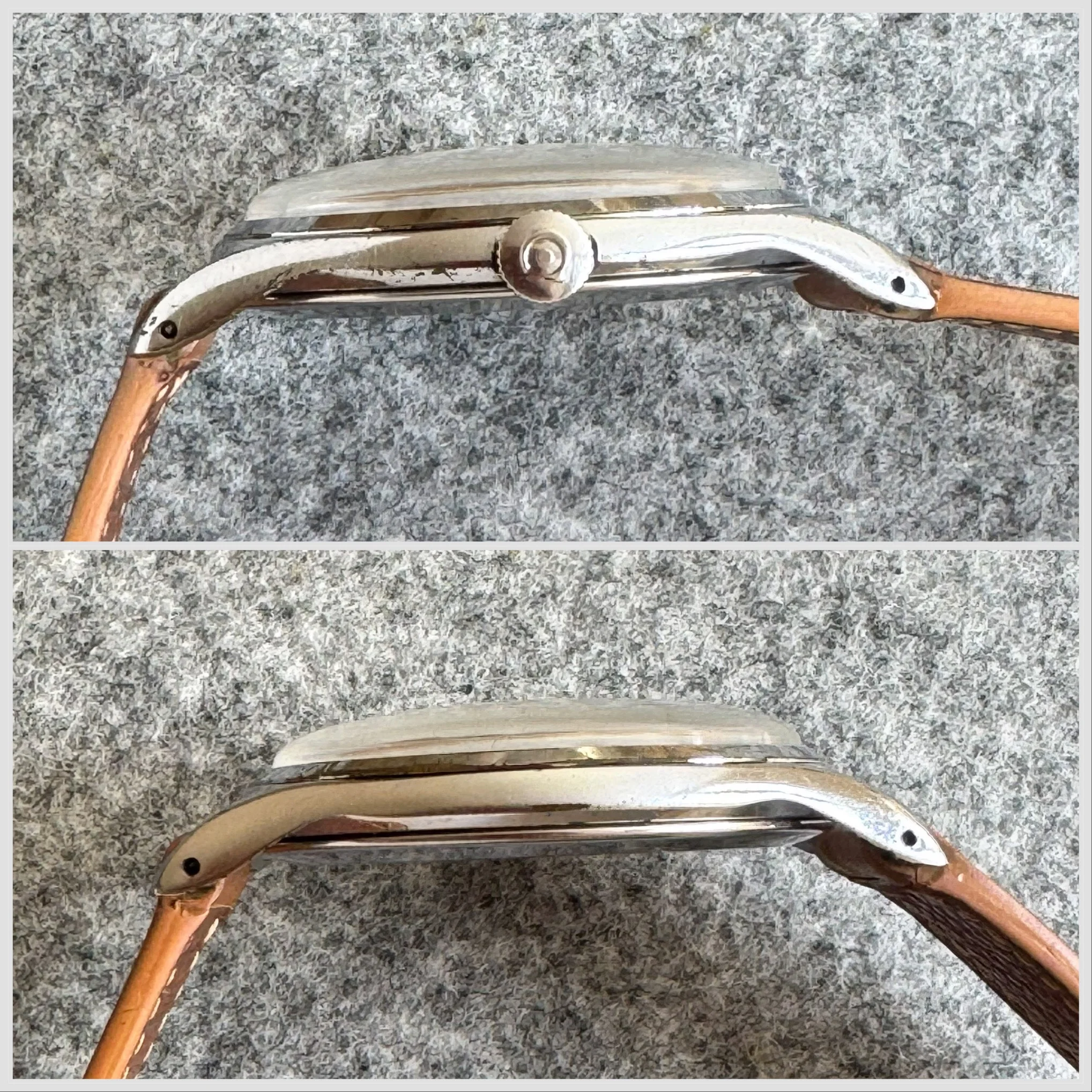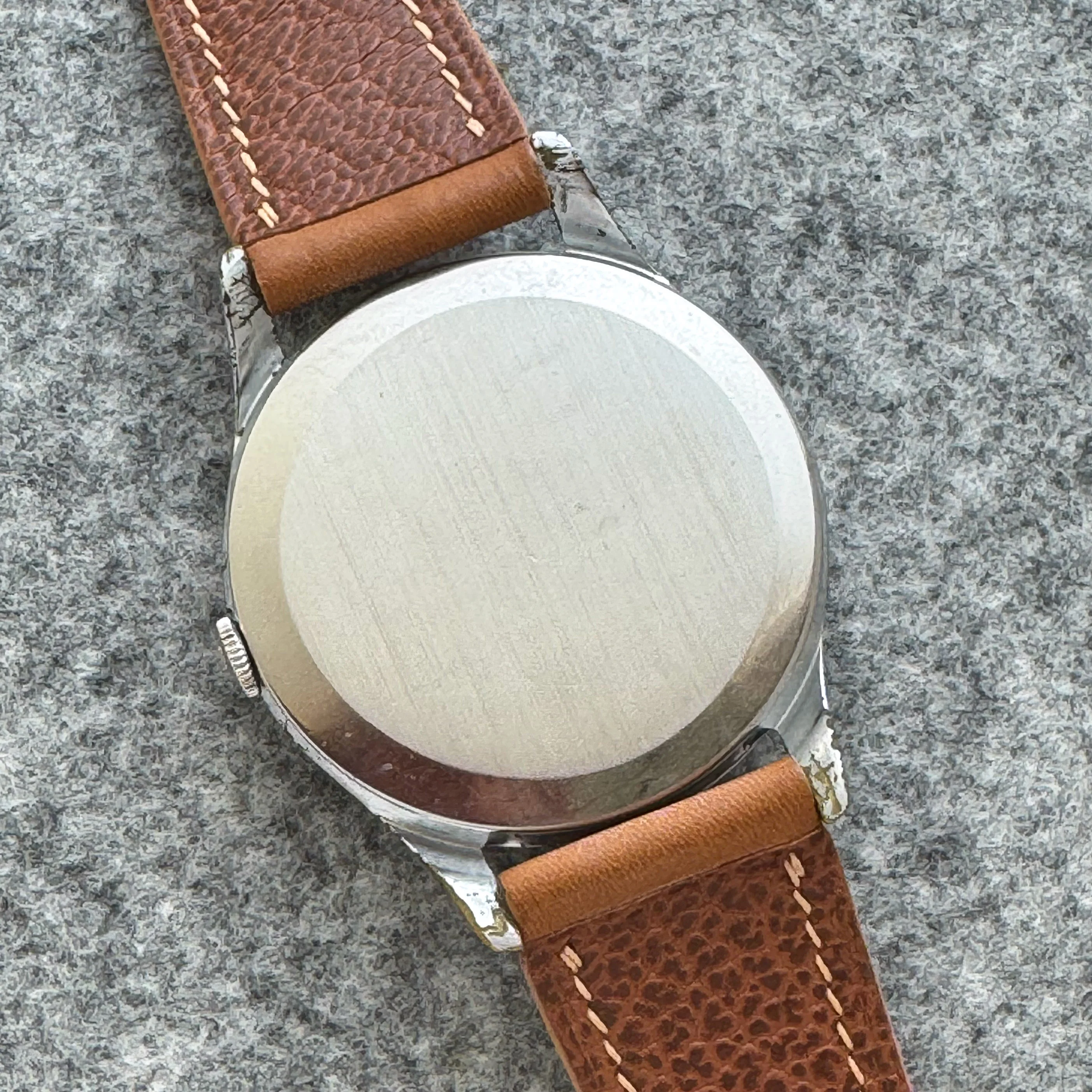 The watch is in good condition for a vintage watch. The dial is very well preserved with a pleasing light ivory patina. The 38mm (measured without crown) case is a chrome case, which shows slight wear on the underside of the lugs, but not obvious on the wrist. Watch was last serviced Jul 2021, the movement picture is from the original seller before service. The watch is currently keeping good time, about +12 sec/day.