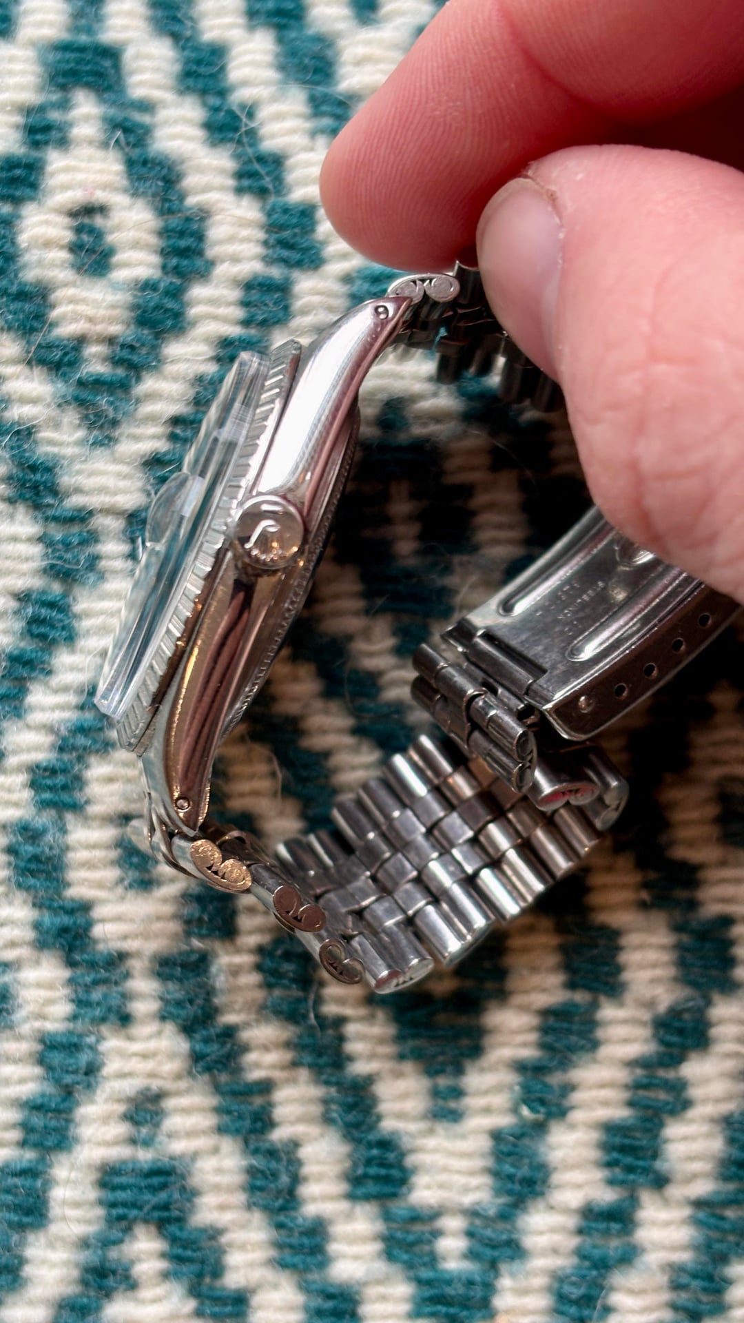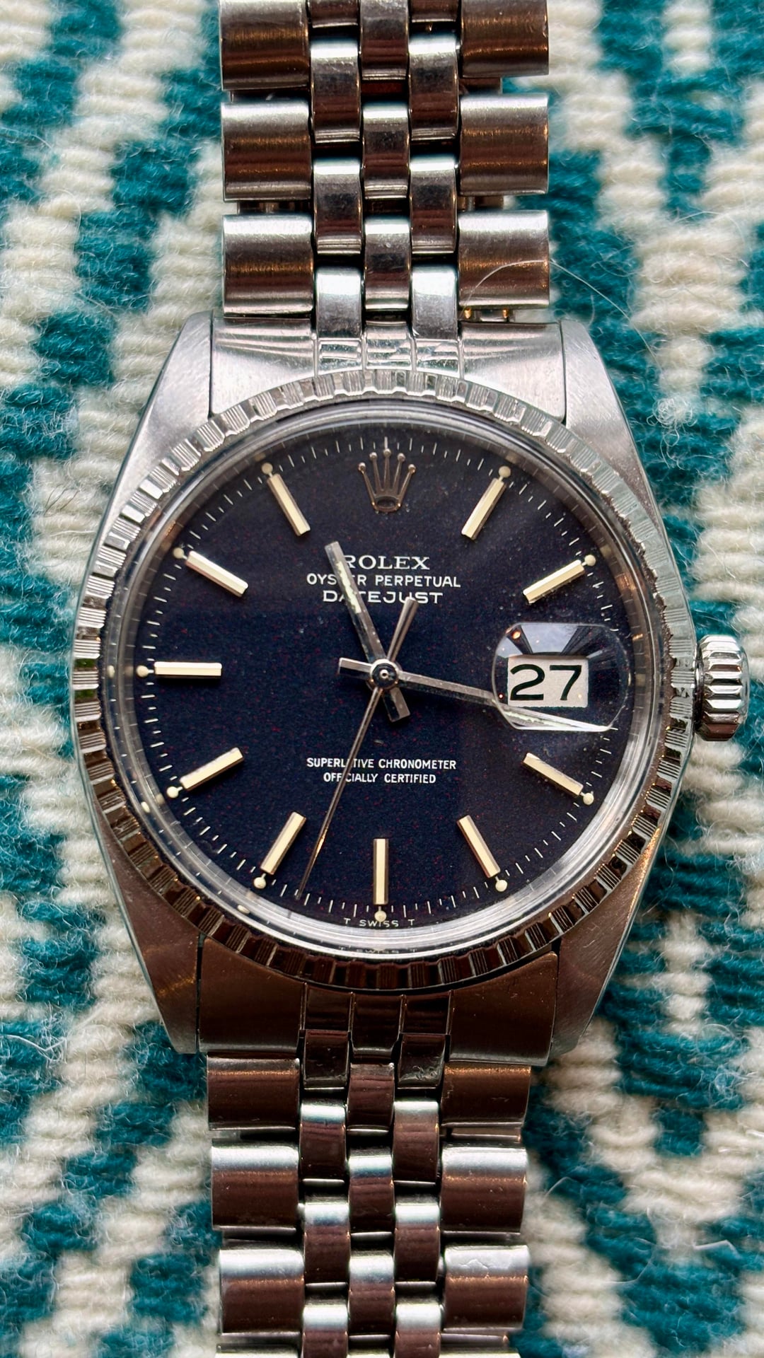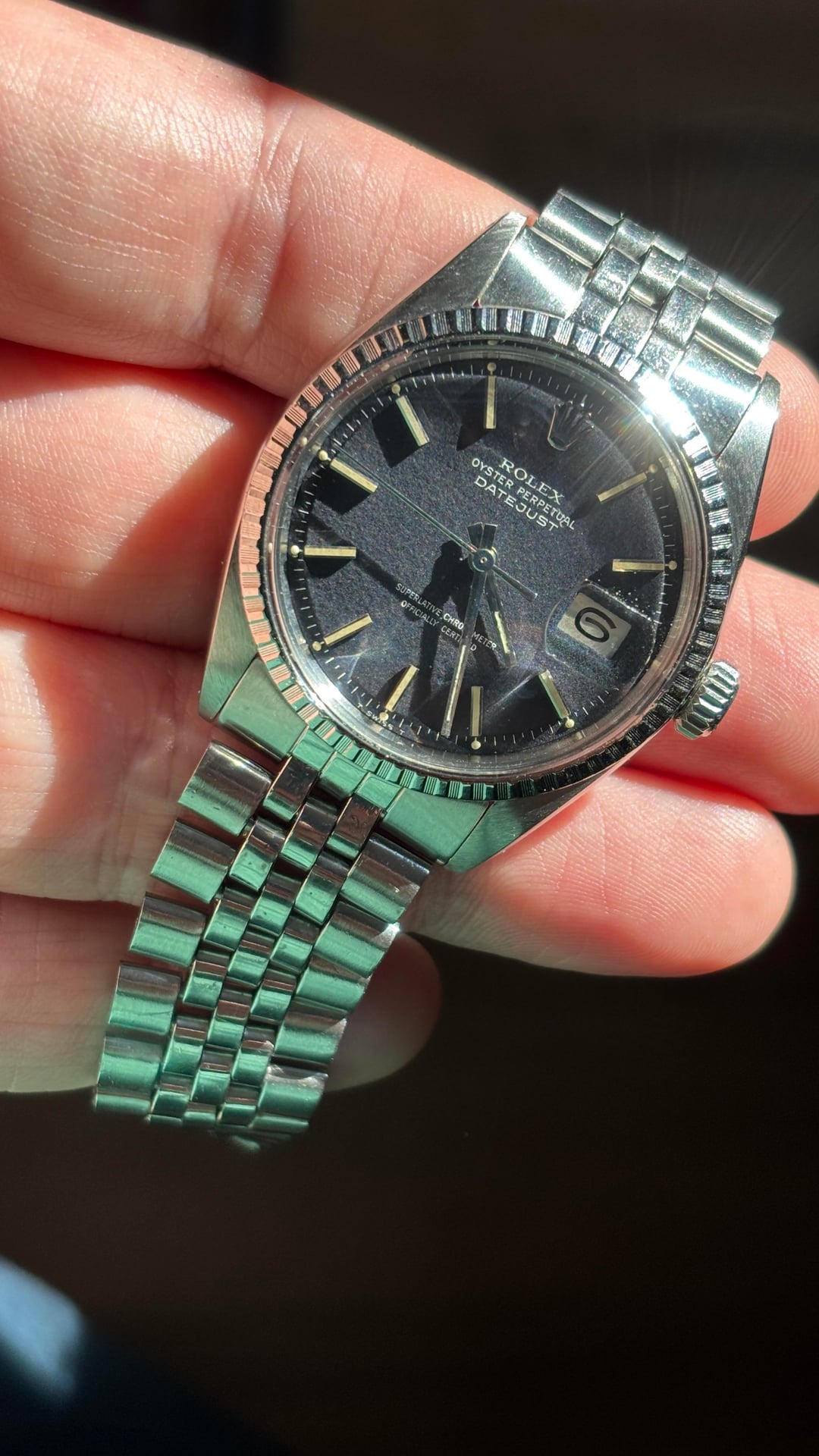 Hey there, I’m selling my lovely confetti dial 1603 Datejust. It’s 3.84M serial dates it to approximately 1974. This dial is known for the flecks of color mixed into the black dial that give it a subtle shimmering and colorful quality, very different from a straight matte black dial. It comes on a folded link jubilee bracelet that is sized to 7.5 inches. The watch was serviced this summer and has a new crystal and gaskets, the old crystal and service papers will be provided. Asking $7200 shipped fully insured within the US, open to using PayPal, Zelle, Venmo. Pleased let me know if you have any questions! Thanks.