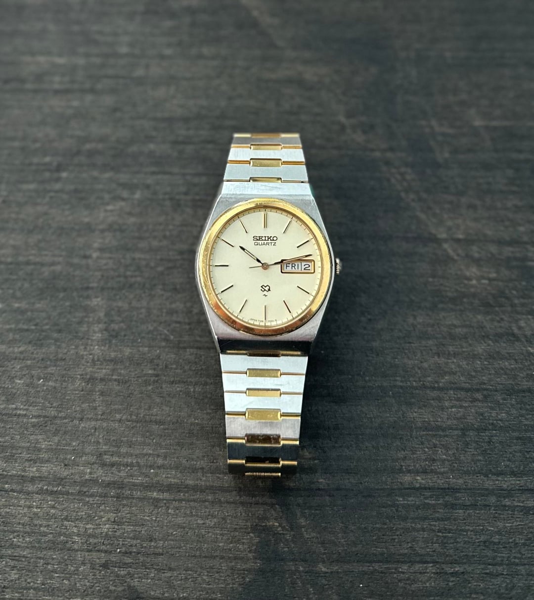For sale is this awesome vintage Seiko SQ 7126-7000. The 7126 quartz movement features a day/date function and keeps perfect time, and the battery was replaced this month. The dial, hands, and crystal are in perfect condition. The two-tone case and bracelet are in good shape with wear marks typical for its age, as shown in the photos. Case measures 36 mm w/crown and 40 mm lug-to-lug. Crown has a scratch and some wear but is in decent shape. The bracelet is sized for an 8 inch wrist and the clasp has 7 micro adjustment holes. No extra links. Asking $60 which includes CONUS shipping. Prefer Zelle, CashApp, or Venmo. Happy to answer any questions. Thanks for looking!