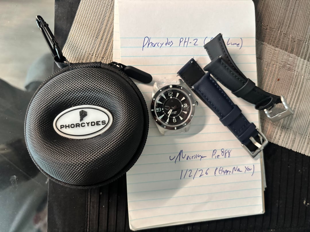 $130 Shipped, Paypal FF or Zelle \*Corrected post w/ pics\* Hi Everyone, I purchased this as a gift, but Phorcydes mistankely shipped only the watch head. They've kindly re-shipped a full watch, so this is available for sale. Specs found on AX or the Phorycdes website, but 39mm/NH35, beutiful domed crystal, and those incredible lume blocks. I have one myself, and it's a fantastic tool watch. I'm including \*my\* Phorcydes case, and 2 rubber straps w/ quick-release. The straps were cut to my wrist, so 6.5", maybe 6.7" max. Happy New Year!