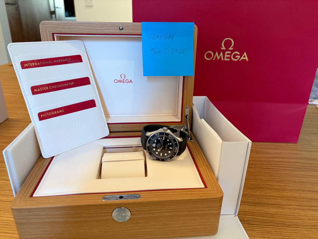 Up for sale is my No Date SMP 300. Purchased directly from Omega Boutique. Warranty card dated 3/29/2025. Mint condition - Worn sparingly with nearly no visible signs of wear (9.5/10). Price: $5400 Shipped from Austin, TX - CONUS only Whats included: Complete set, original Omega rubber strap with deployant clasp, both boxes, and 3 cards. Happy to video chat, answer any questions, or provide additional photos on request. Not interested in trades at this time.